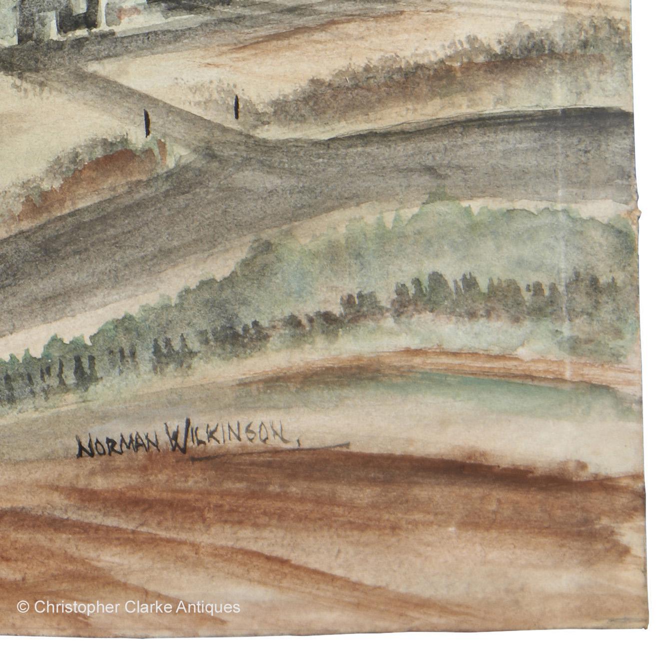 Norman Wilkinson has signed the illustration towards the bottom right of the picture. Although quickly painted, this Wilkinson painting has good detail to the background, showing the two sheds, a light, barrage balloon and the airship's shadow. There is a border of shadow marks probably made by a previous mount. Dated to the back 1917.