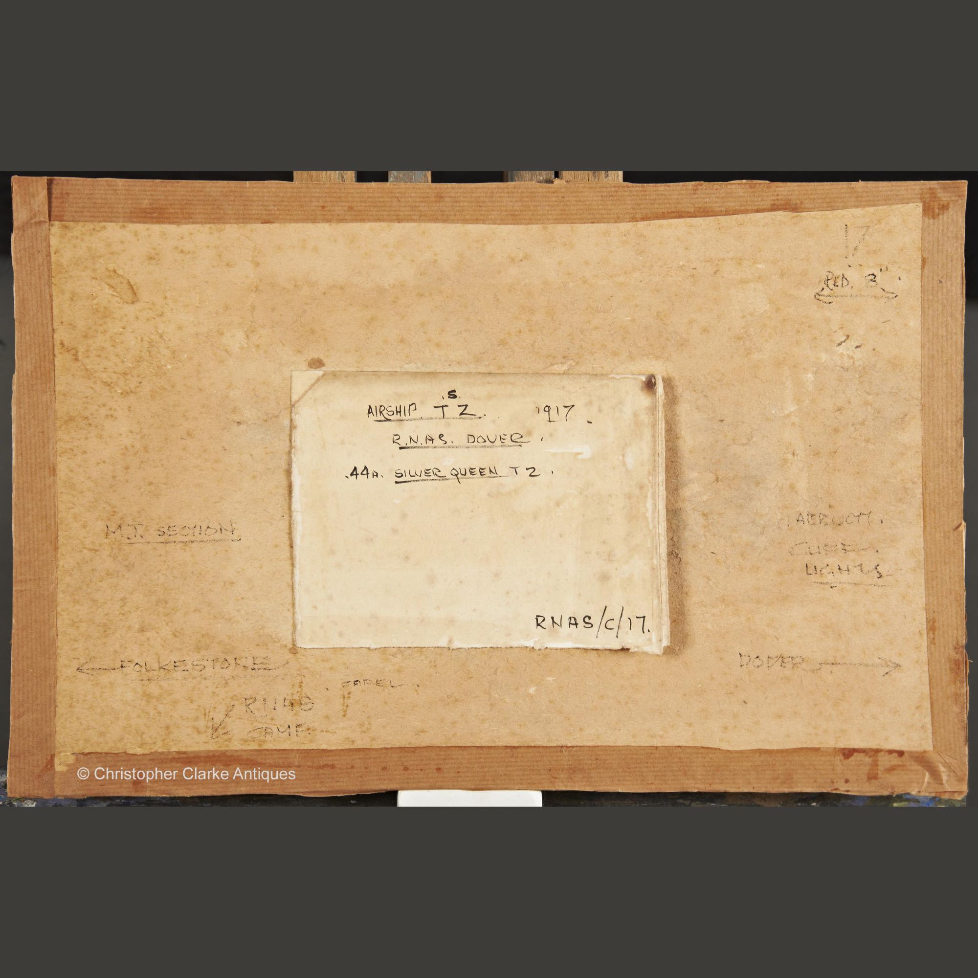 The label to the back of the board notes '.S., Airship TZ. 1917, R.N.A.S. Dover, 44A Silver Queen TZ' with 'RNAS /C/17.' to the bottom corner. Locating key notes with arrows for Dover, Folkestone and RNAS Camp are inscribed directly to the back of the board along with Capel, 17, Red 8, Aubrey Cliff Lights and M.T. Section.