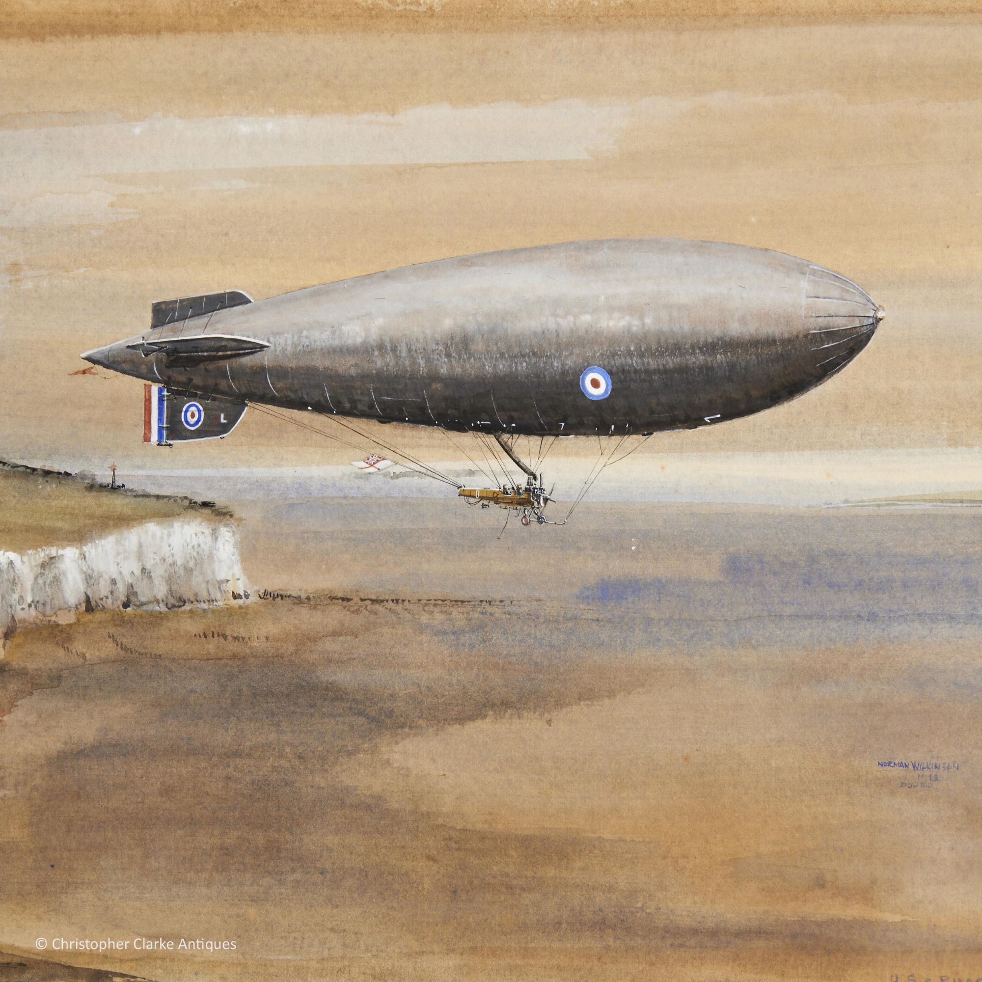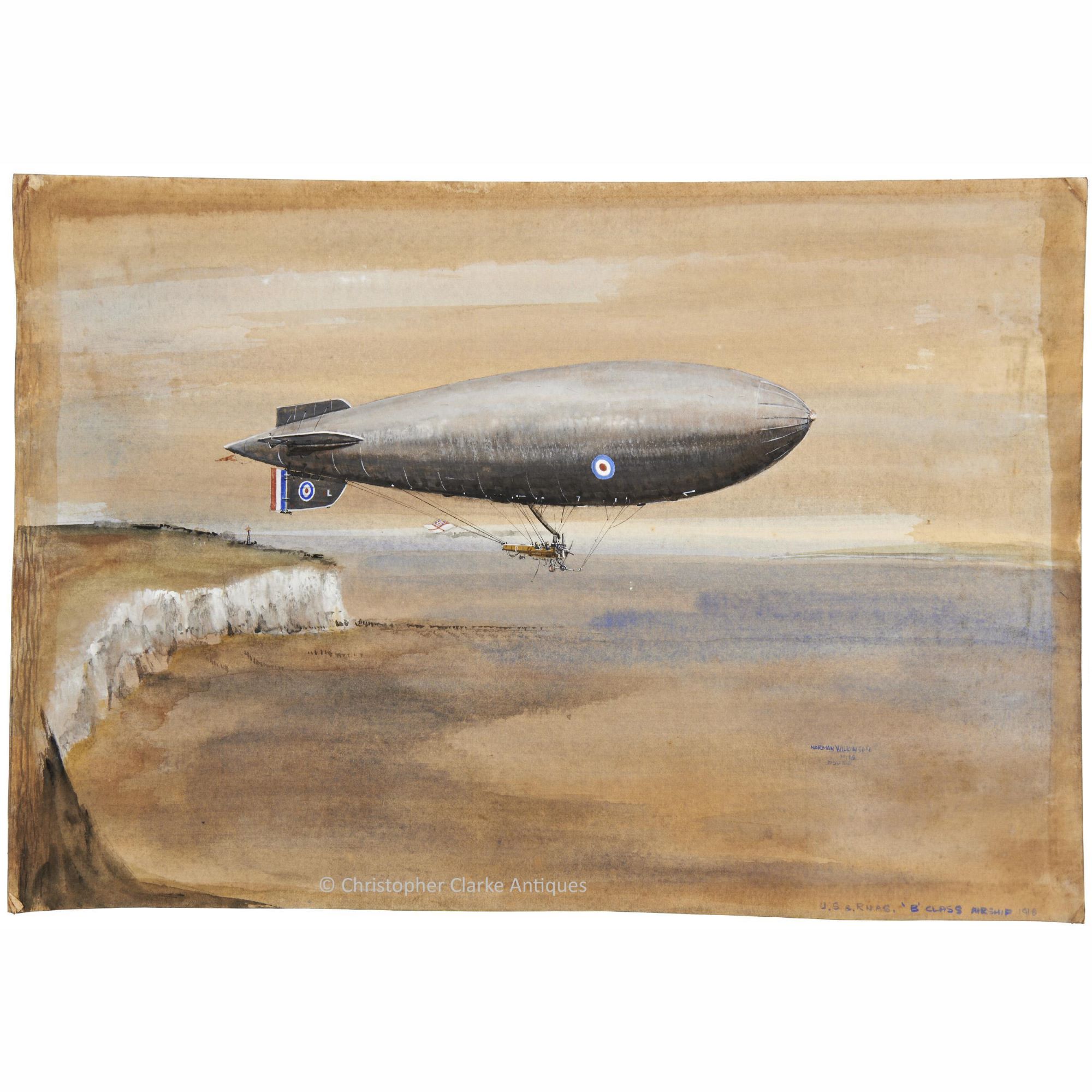 A watercolour and gouache on board painting of a non-rigid airship on the Kent coast by Norman Wilkinson.