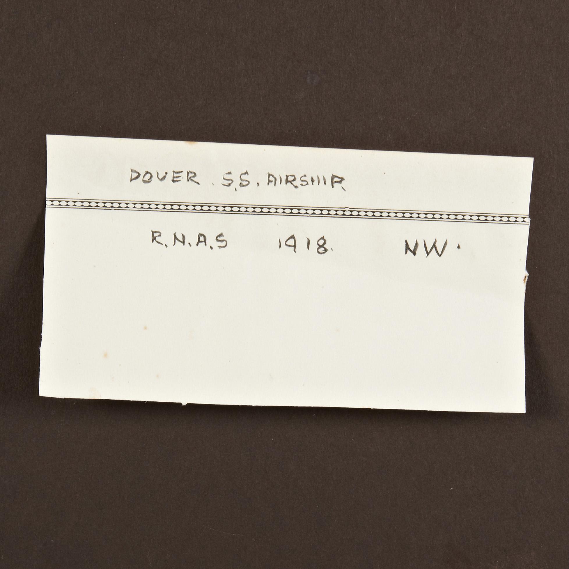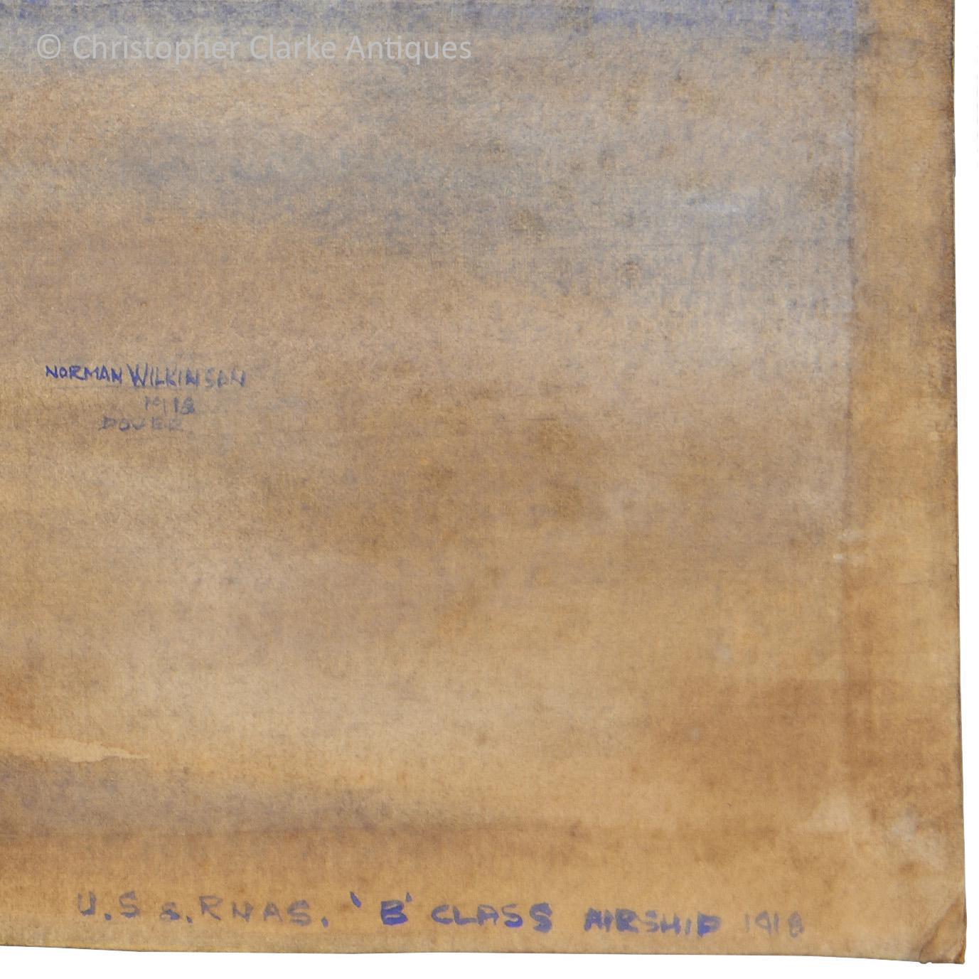 The illustration is signed 'Norman Wilkinson 1918 Dover' and below, to the bottom right is annotated 'U.S & (or 8). RNAS. 'B' Class Airship 1918'. A label to the back of the board, which is maybe later, is simply noted with 'Dover S.S. Airship, R.N.A.S 1918 NW.' Wilkinson's notes to the picture do not align with the information known today but this is not uncommon for some of his pictures. This was either artistic licence for the purpose of the illustration or clerical error.