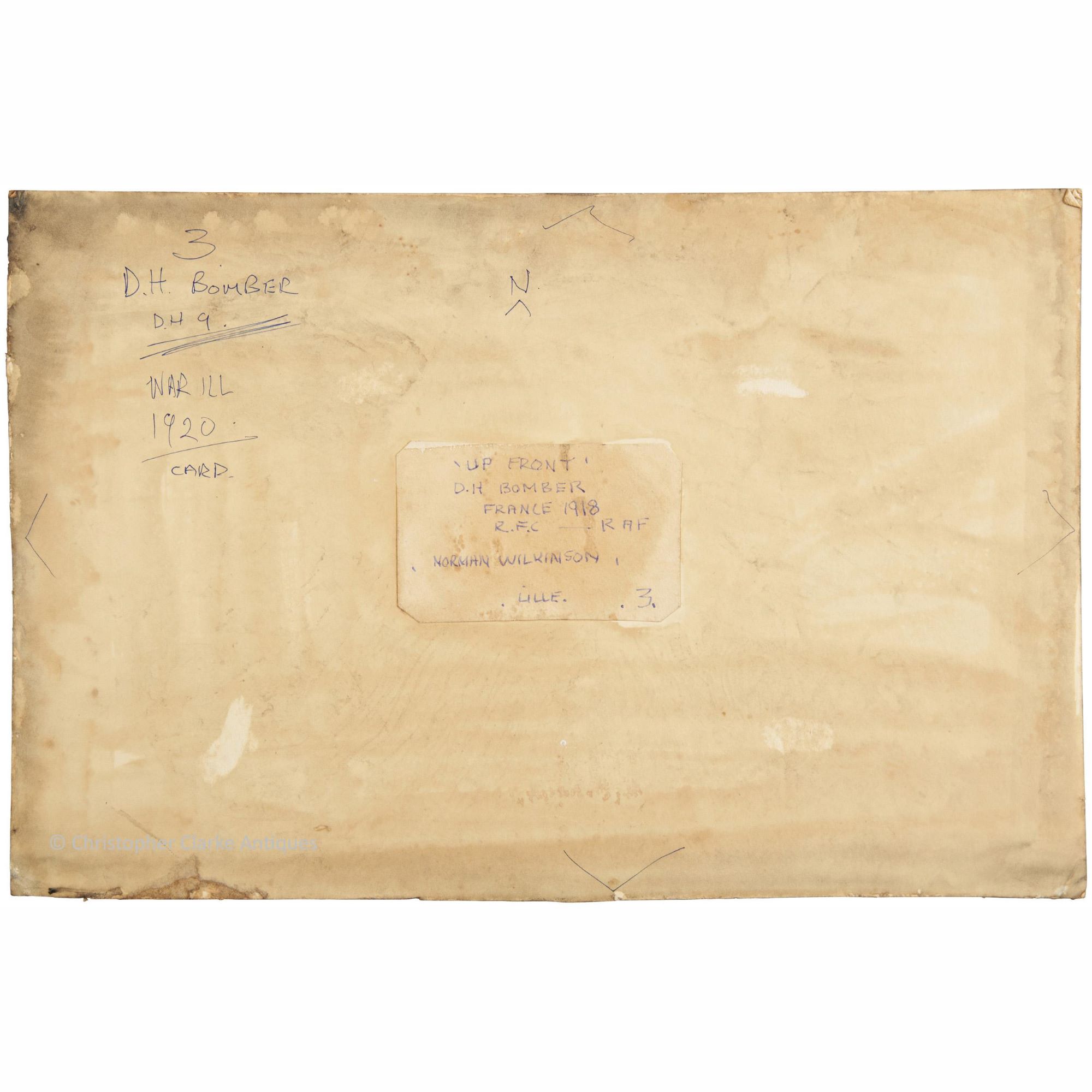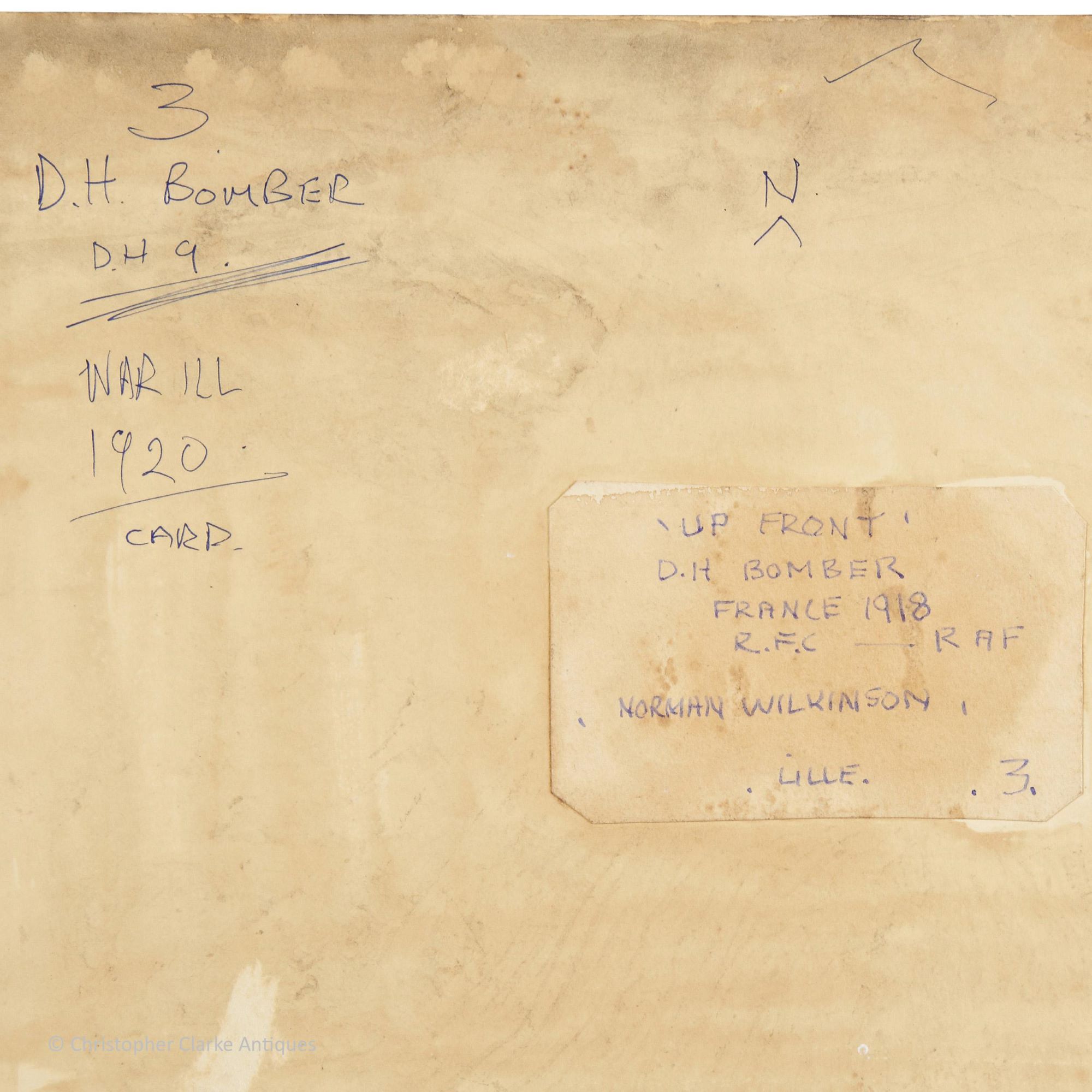 The back of the board has a label noting 'Up Front, D.H Bomber France 1918, R.F.C - RAF, Norman Wilkinson, Lille. 3'. Further writing direct to the board state ' 3, D.H. Bomber D.H 9., War Ill 1920, Card' along with an arrow to each edge with the top one also marked N.