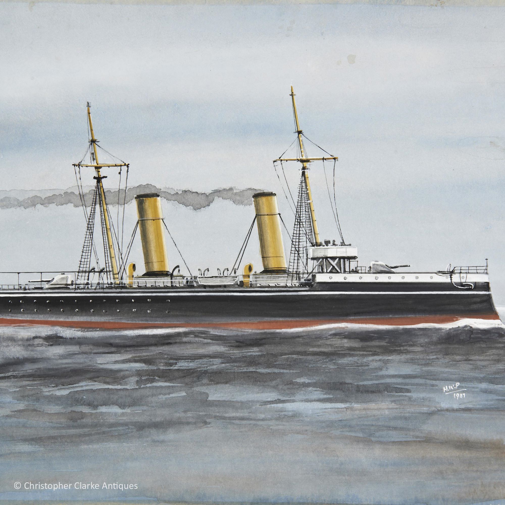 A watercolour and gouache on board of HMS Karakatta by Harry Price.