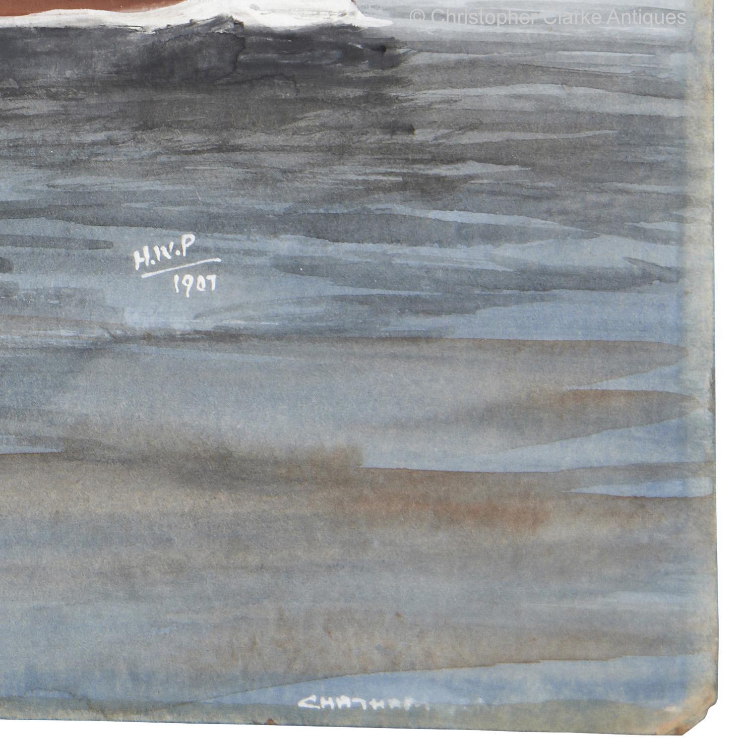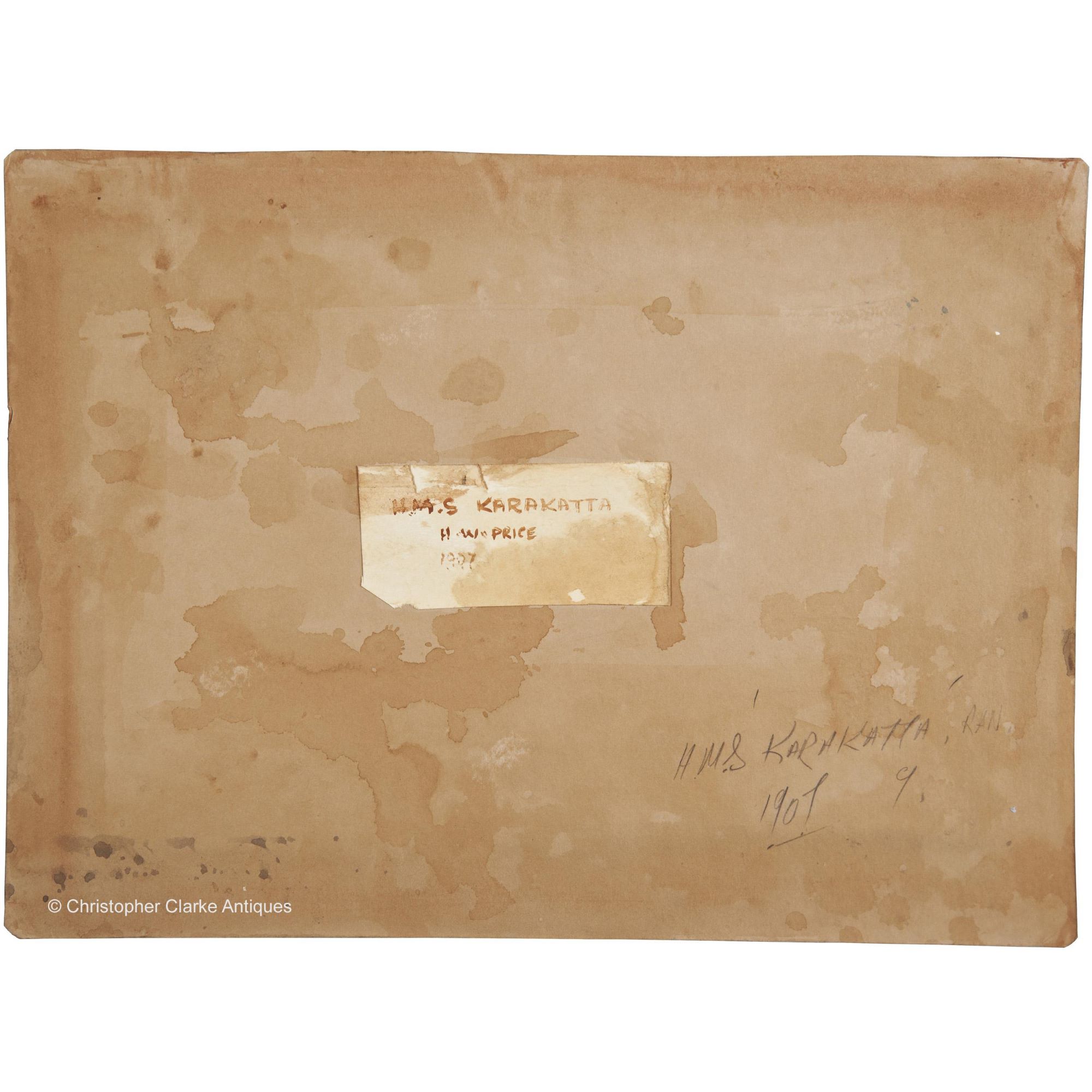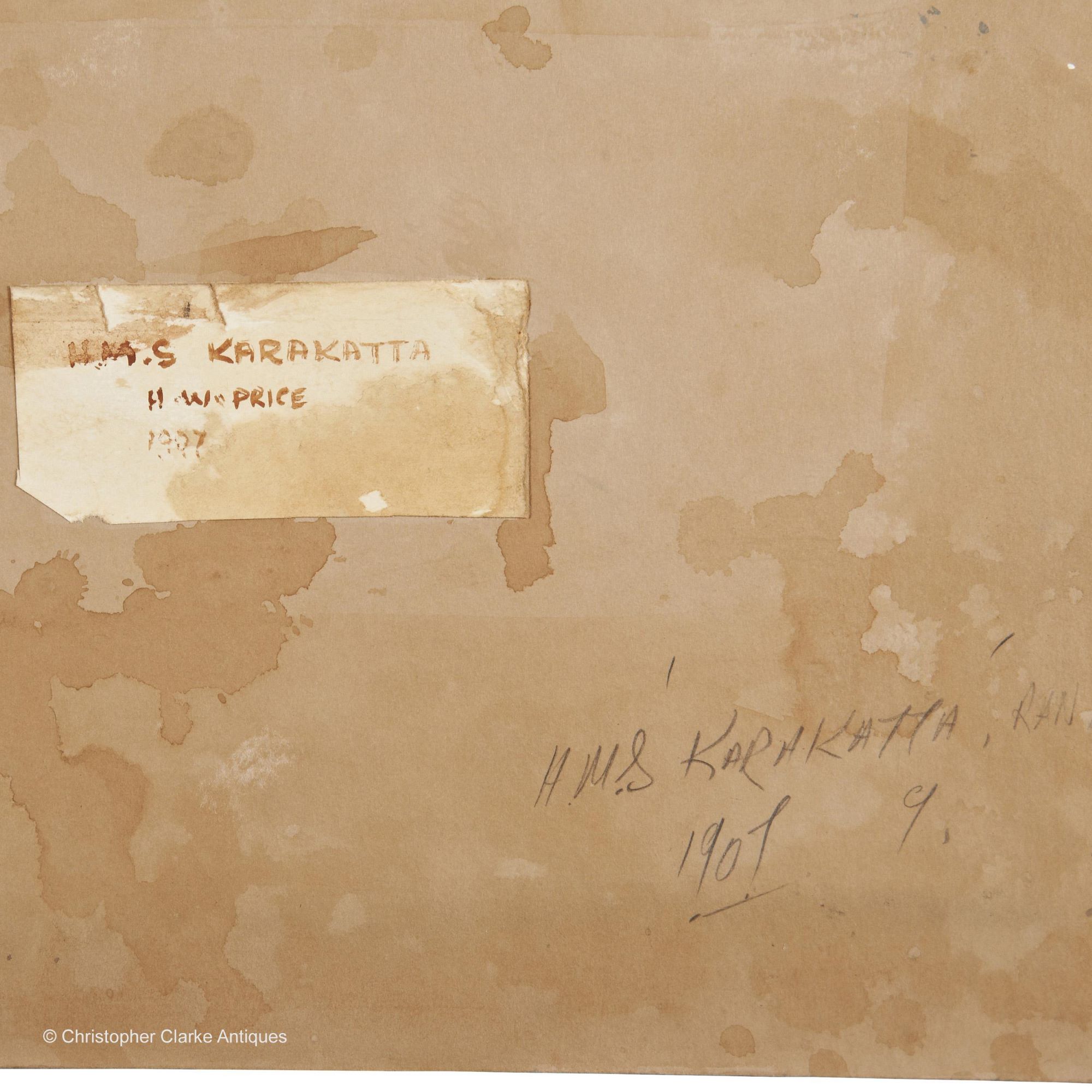 The painting is signed 'H.W.P. 1907' to the right, below the bow of the ship with 'Chatham' written to the bottom edge. The back of the board has a label noting 'H.M.S Karakatta, H.W. Price, 1907'. Also written in pencil directly to the board is H.M.S Karakatta, RAN, 1907, 9.'
