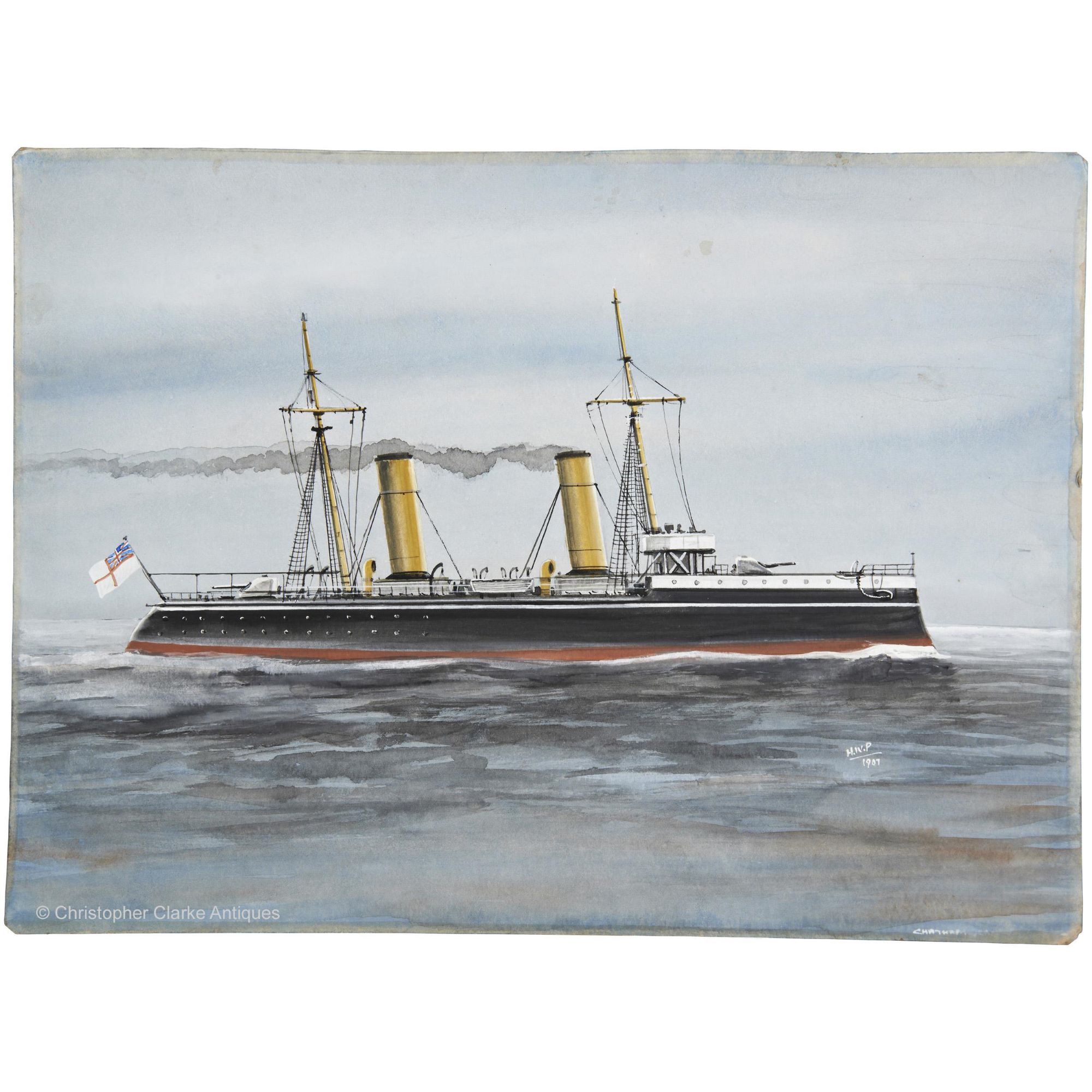 Like Price's painting of HMS Marathon done in the same year, this picture was made after the ship had left Royal Navy service and Price may have intended it for publication. He may well have been working from previous sketches he made of the ship in Sydney or a photograph. The painting is similar to that of Marathon and Hansa, showing Karakatta at sea and in good detail. Dated 1907.