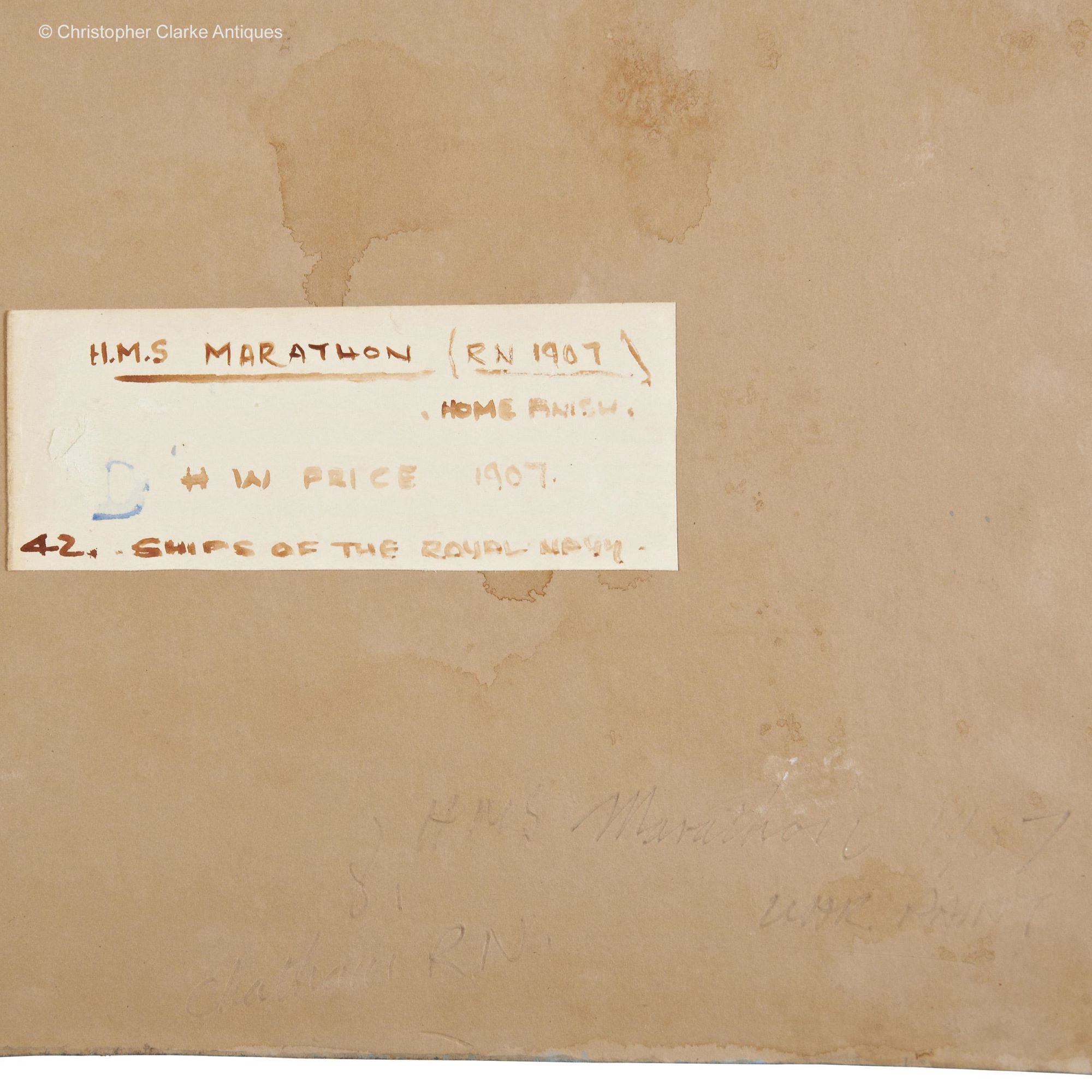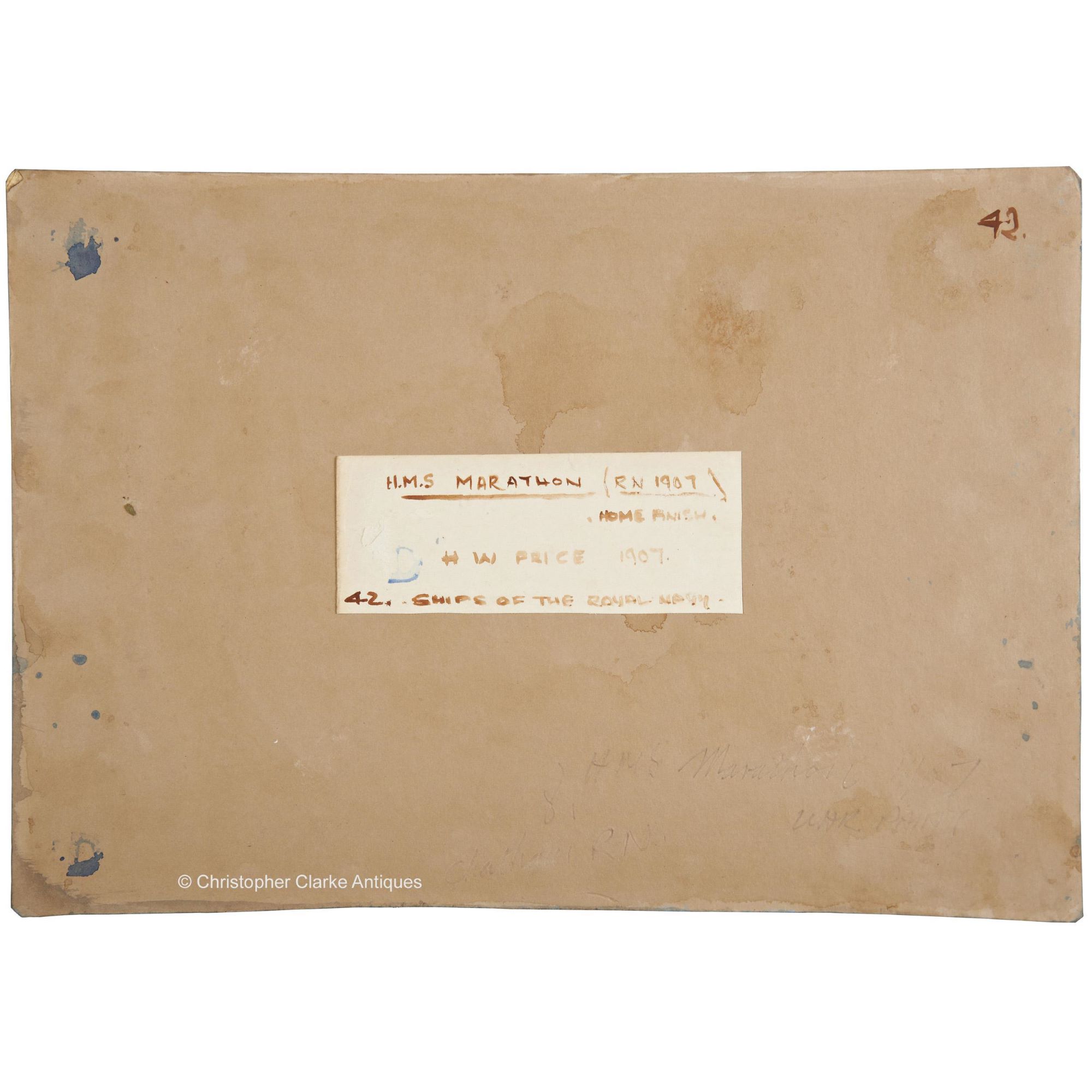 The painting is signed by Price 'H.W.P 1907 to the front. The back of the board has a label stating 'H.M.S Marathon (RN 1907) Home Finish, H W Price 1907., 42. Ships Of The Royal Navy.' Written in pencil directly to the board is 'HMS Marathon, War Paint 1907.' The number '42' is also written in watercolour to the top right corner.