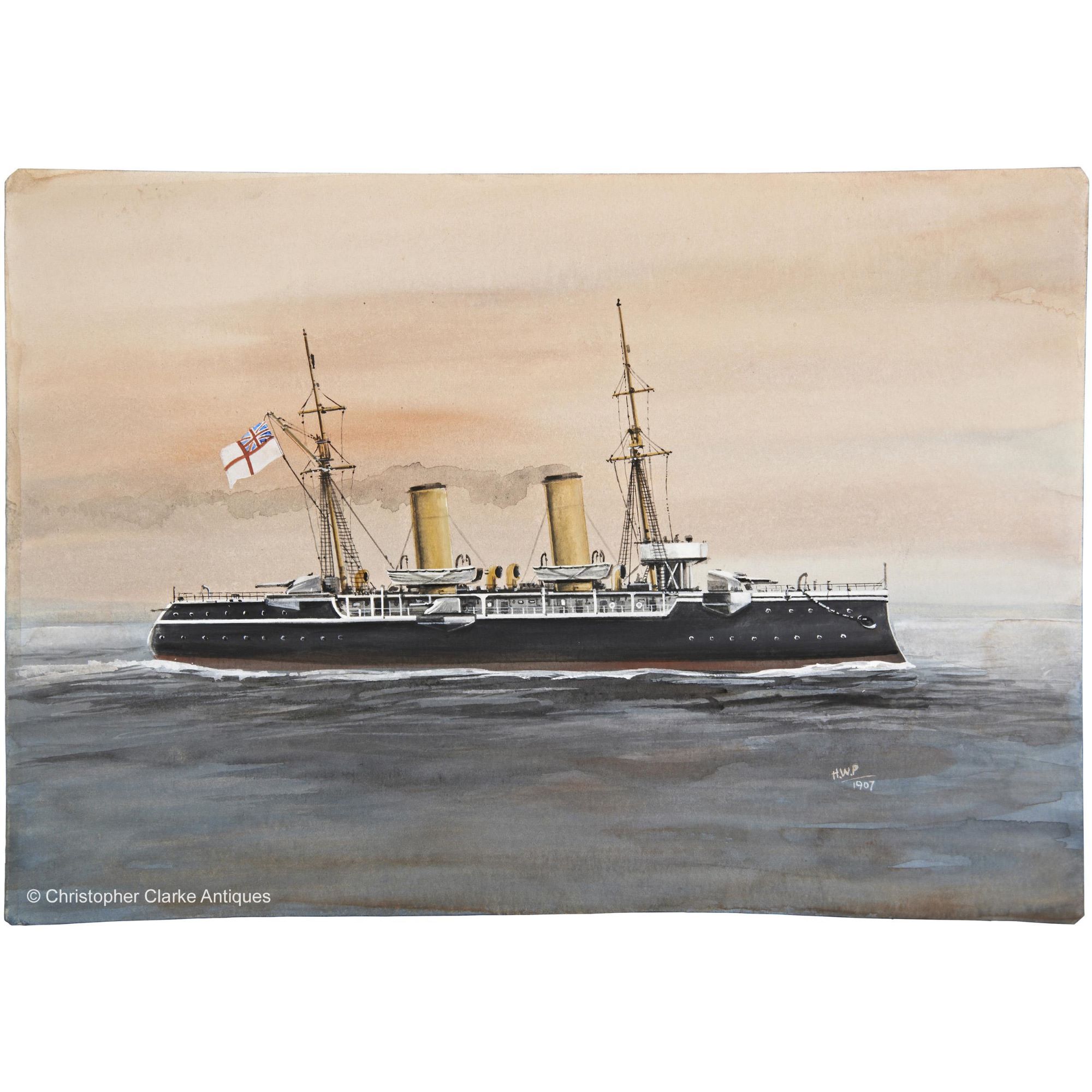 A watercolour and gouache on board of HMS Marathon by Harry Price.