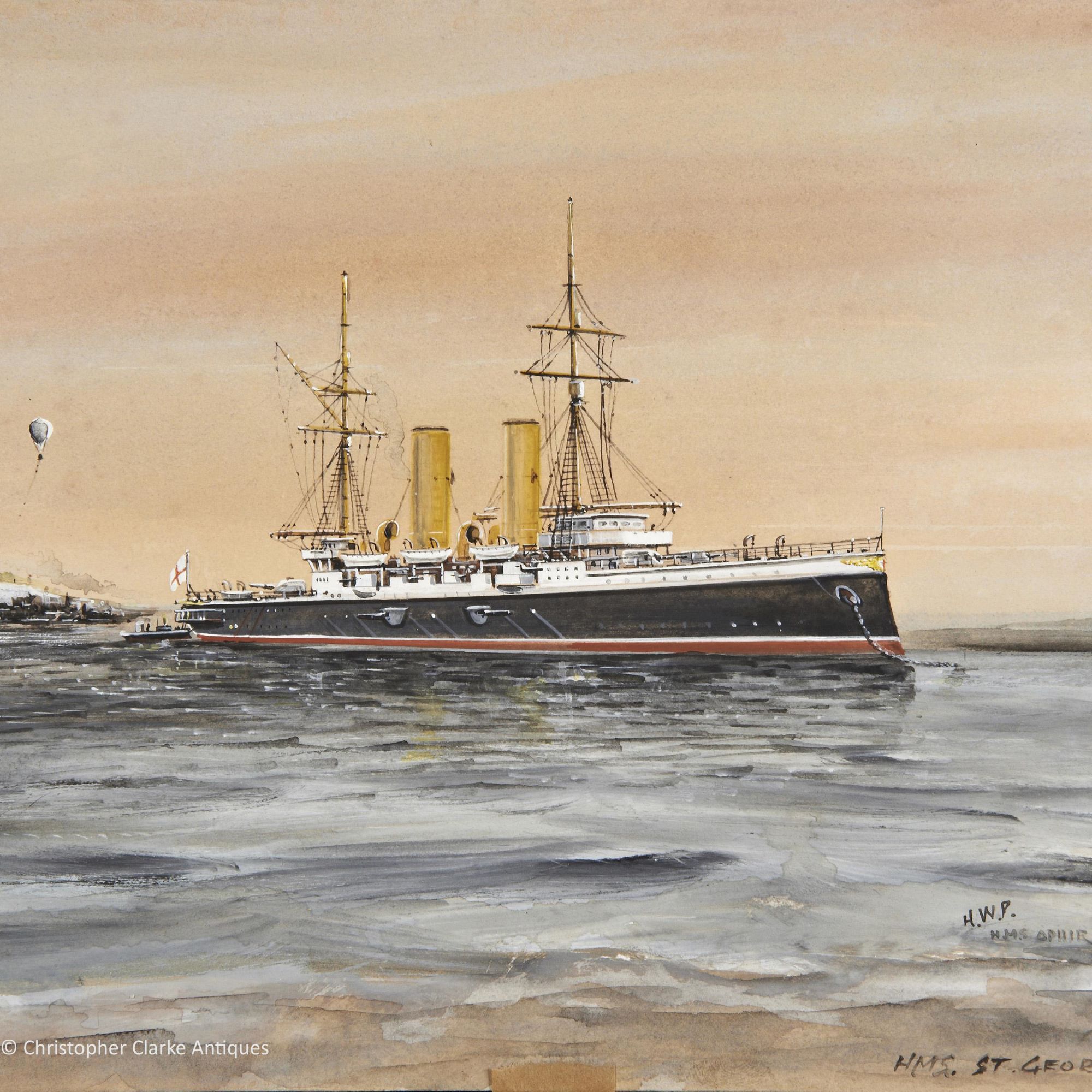 A watercolour and gouache on board of the Edgar class cruiser HMS St. George by Harry Price.