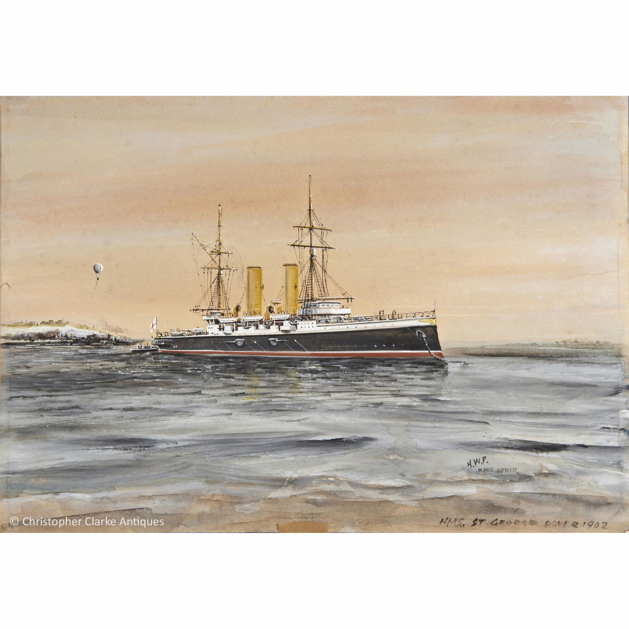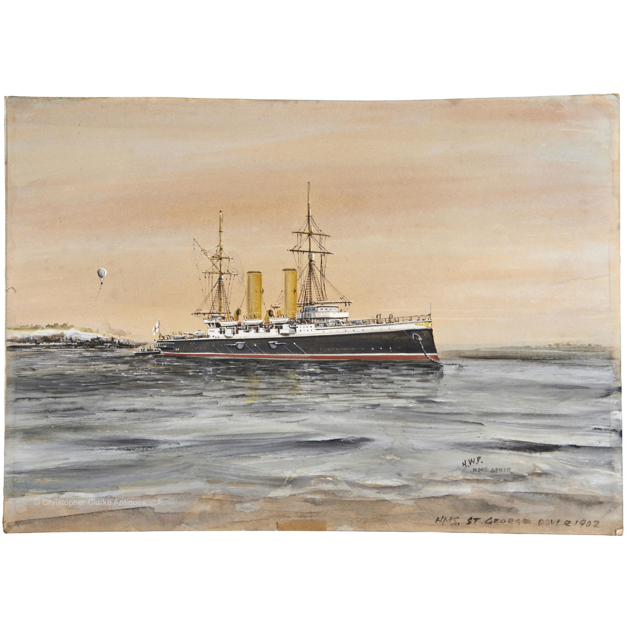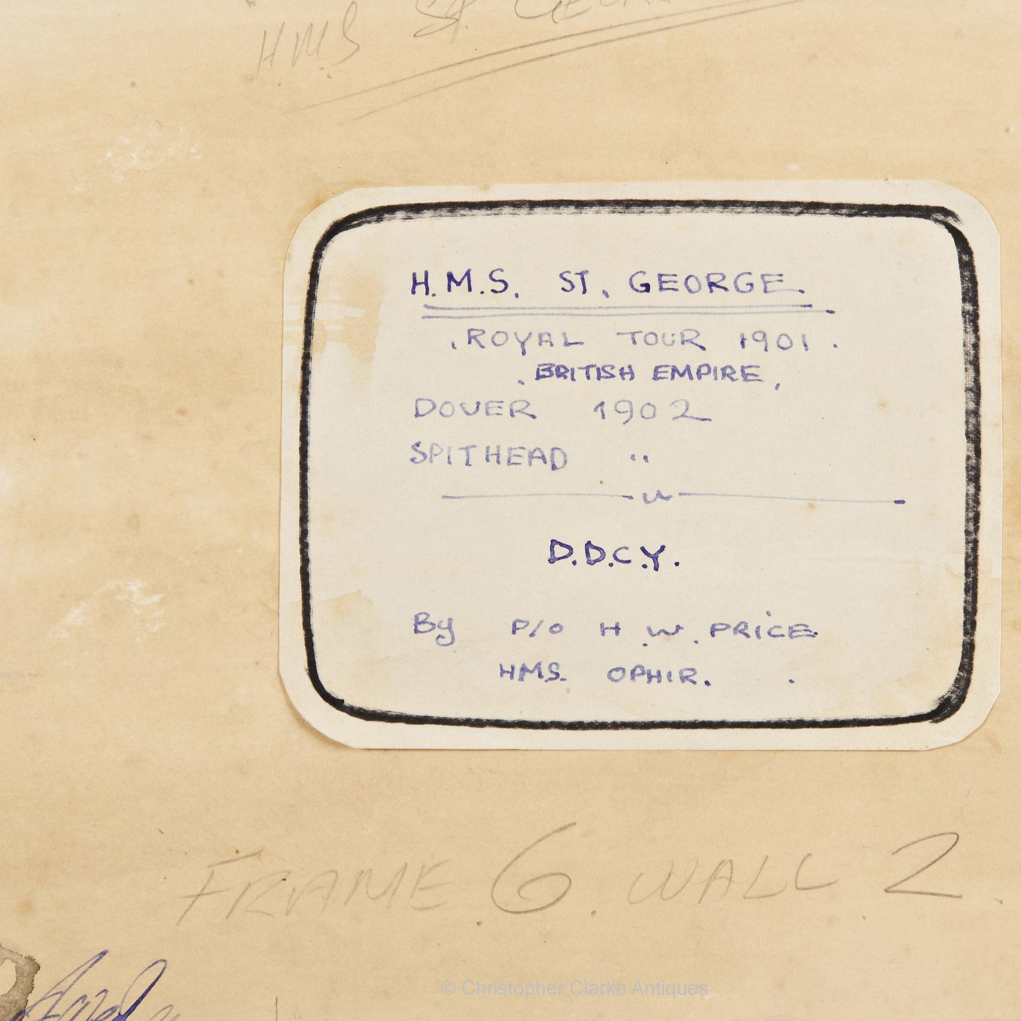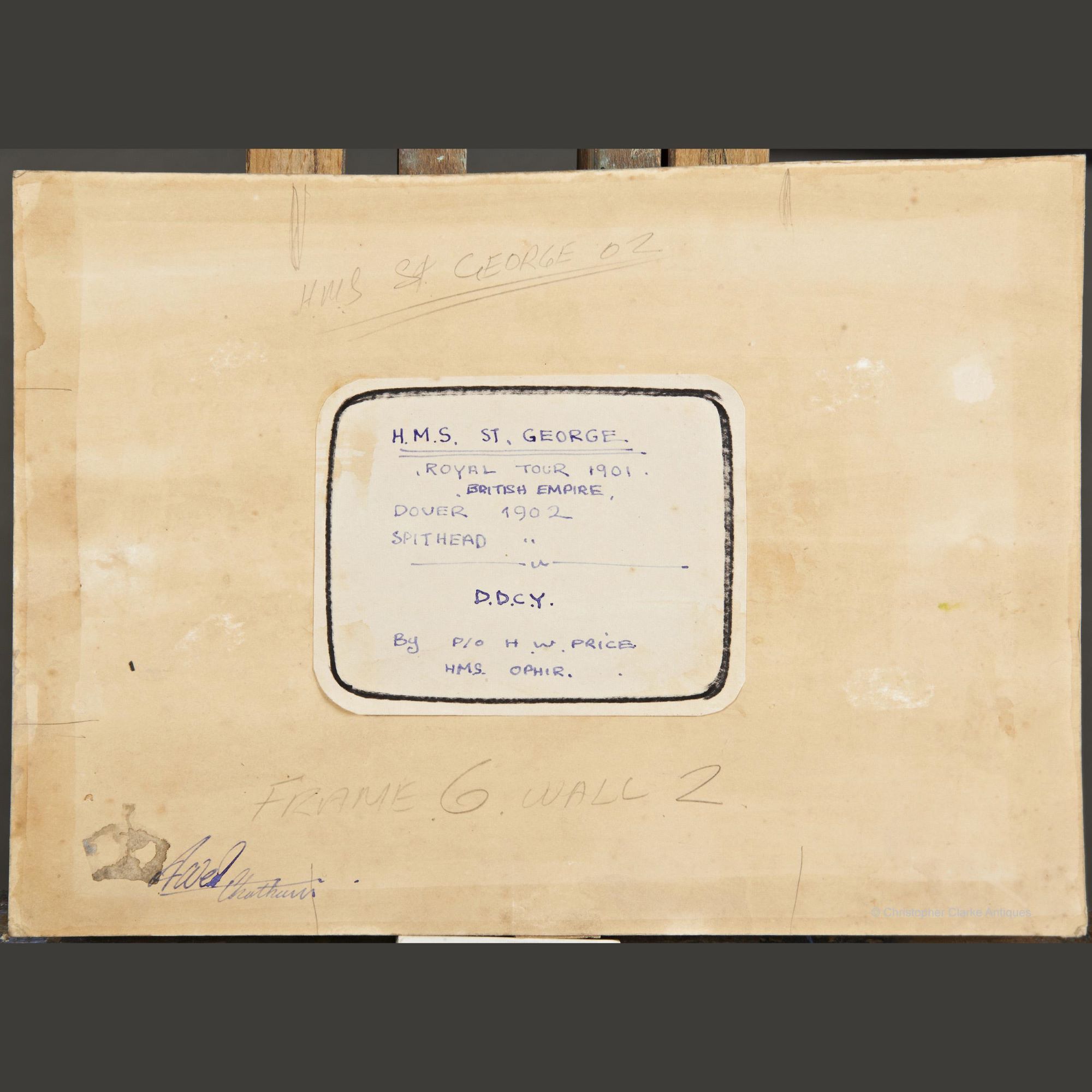 Harry Price was well familiar with HMS St. George as she was one of two escort ships for the HMRY Ophir's Royal Tour of the British Empire in 1901. The St. George features a number of times in Price's illustrated diary of the tour. This painting was done by Price at the end of the tour, whilst still serving on Ophir. The painting is initialled 'H.W.P. HMS Ophir' towards the bottom right with the 'HMS. St. George Dover 1902' to the bottom edge. The back of the board has a label stating, 'H.M.S. St. George, Royal Tour 1901., British Empire, Dover 1902, Spithead ", D.D.C.Y. By P/O H.W. Price, HMS. Ophir.'. Written in pencil directly to the board is 'HMS St. George 02' and Frame .6. Wall 2'. Also to the back, in ink, is a signature which might to be 'Awel Chathum'.