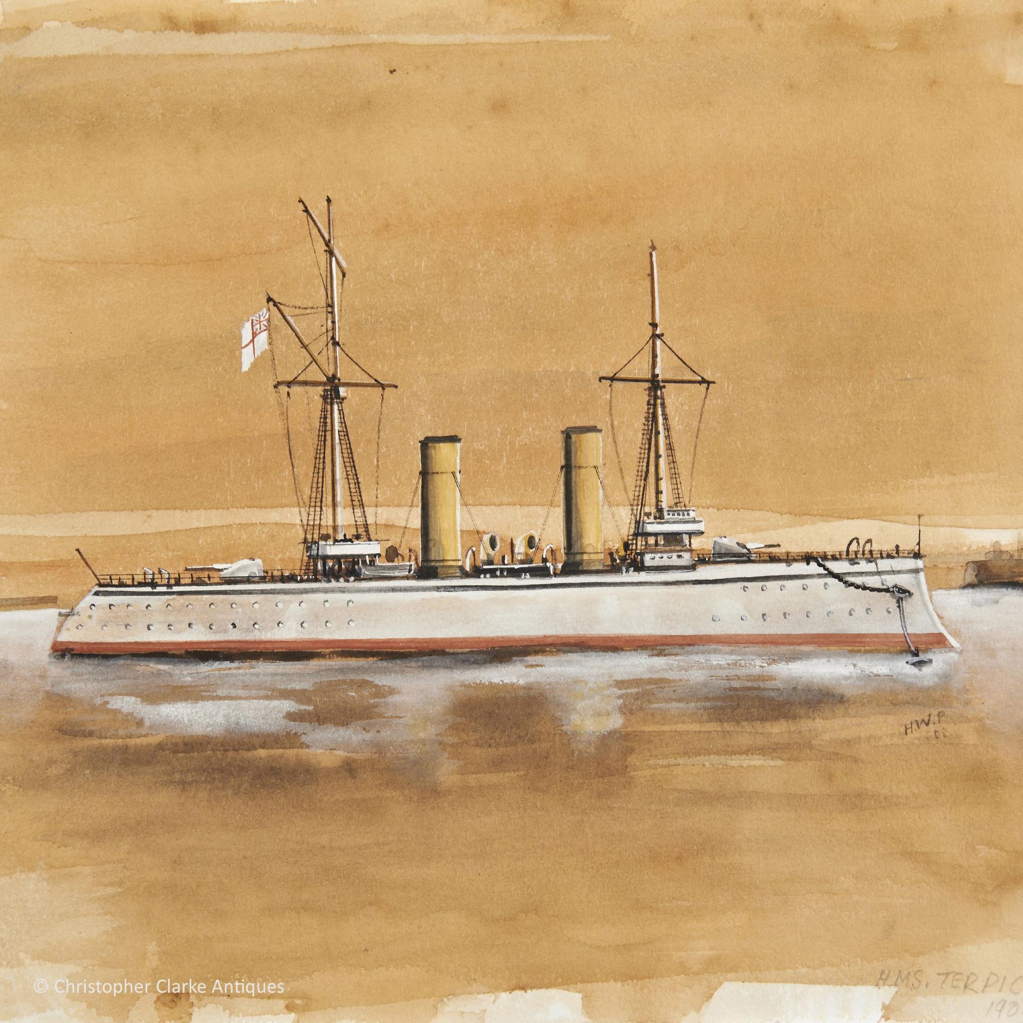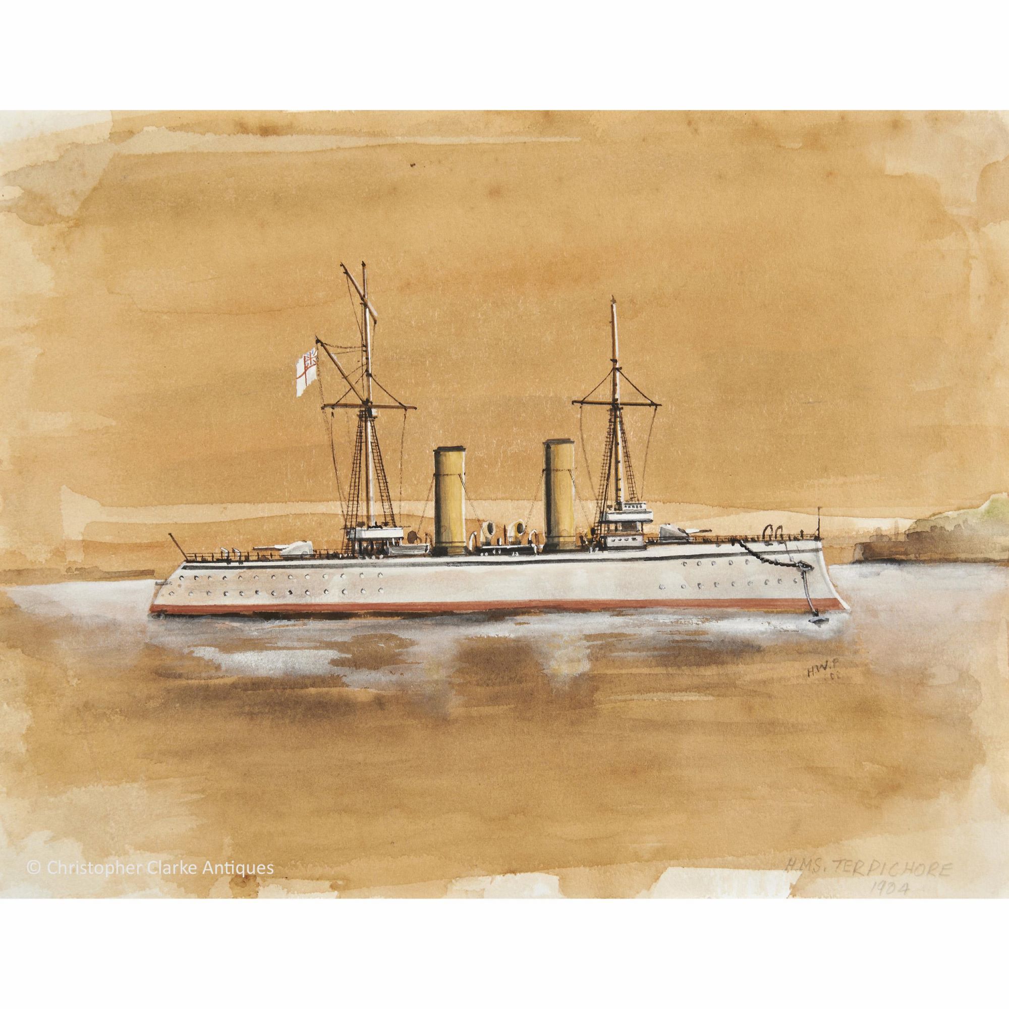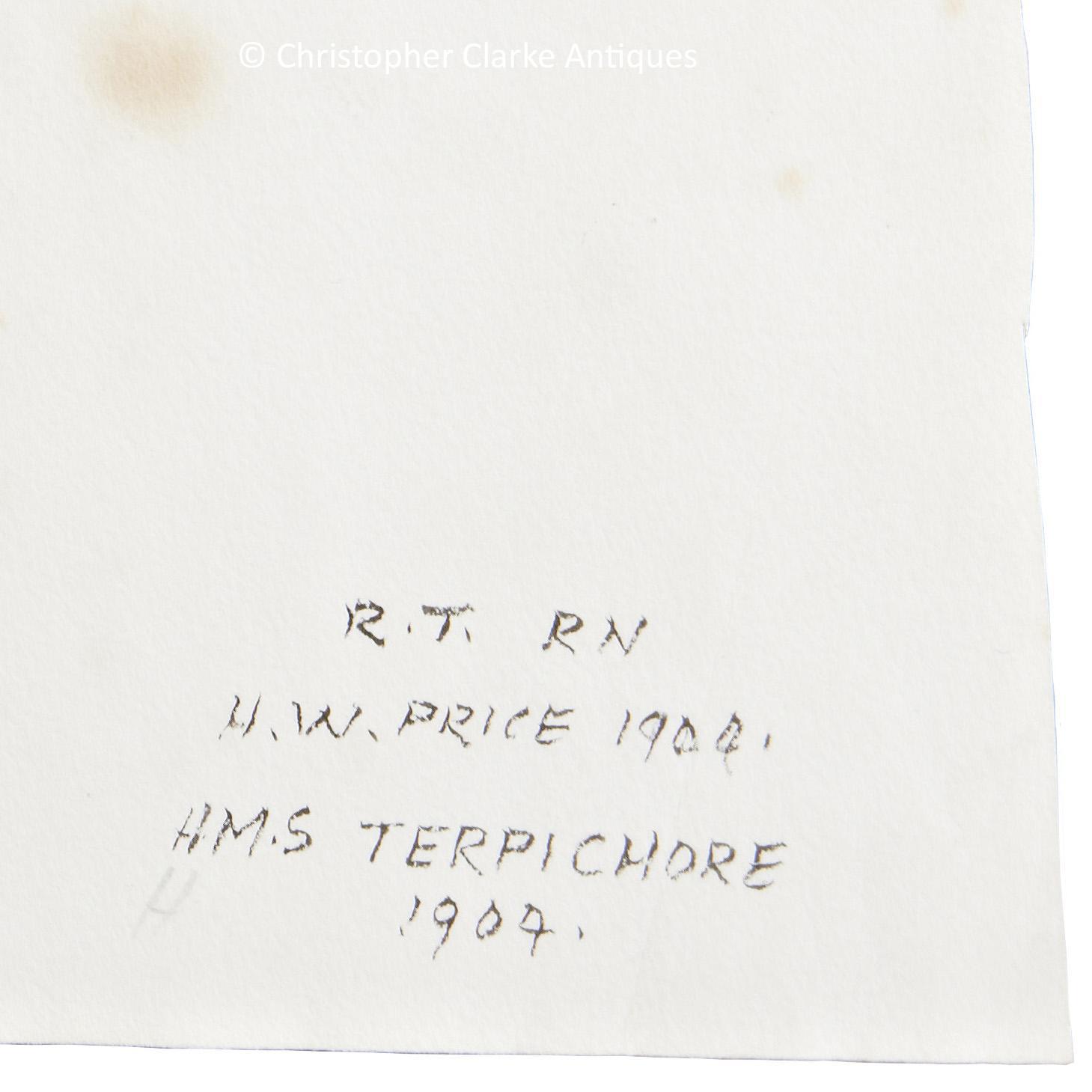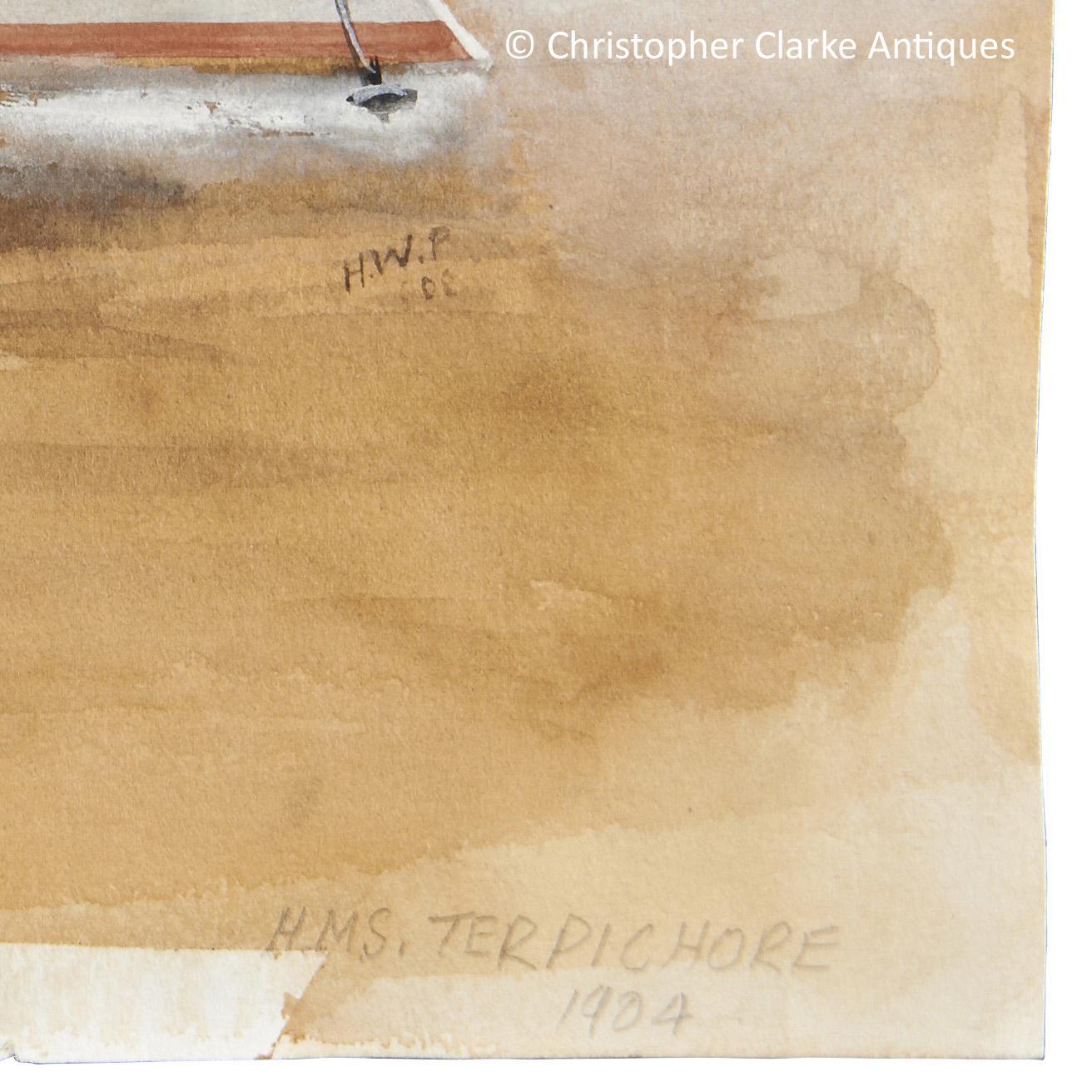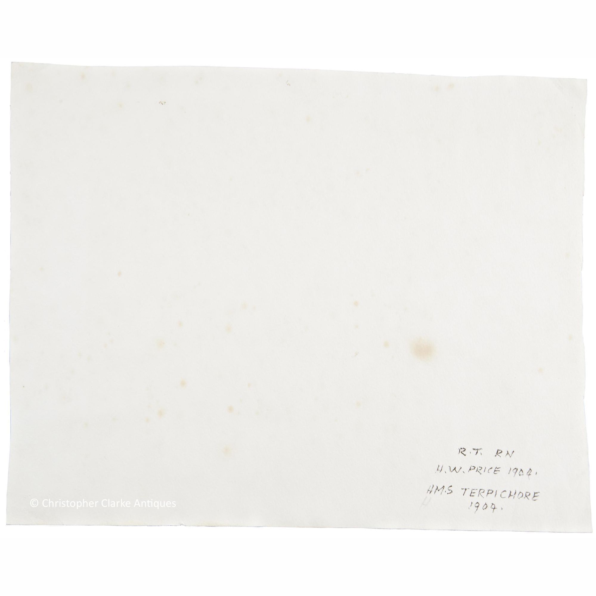 The painting is initialled 'H.W.P' to the lower right with a washed out date below. Written in pencil to the bottom edge is 'H.M.S. Terpsichore 1904.' To the back of the paper, to the bottom right is written 'RT RN, H.W. Price 1904. H.M.S. Terpichore 1904.', with the spelling mistake forgivable. RT RN might be the abbreviation for - Radio Technician Royal Navy.