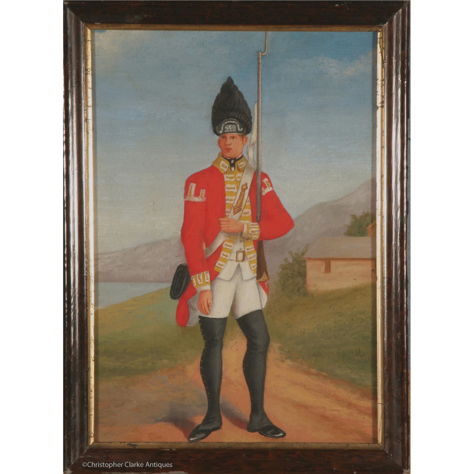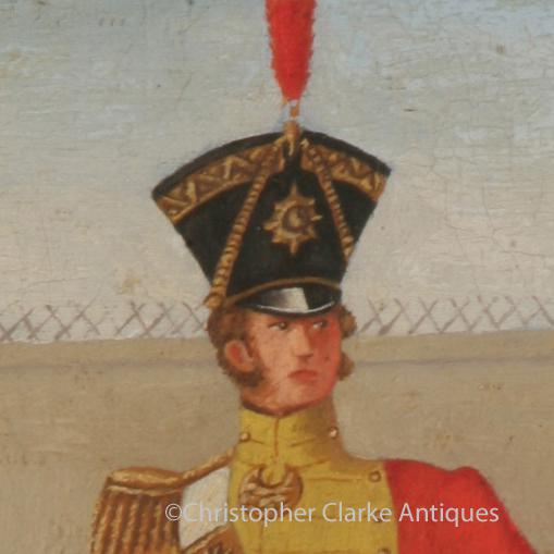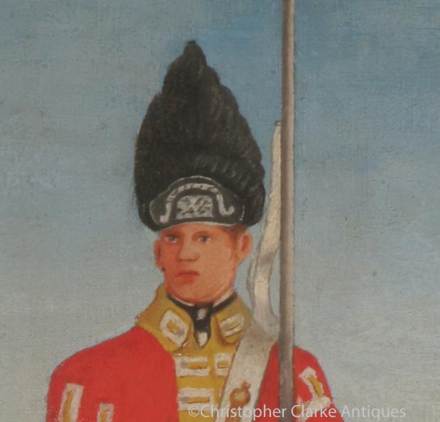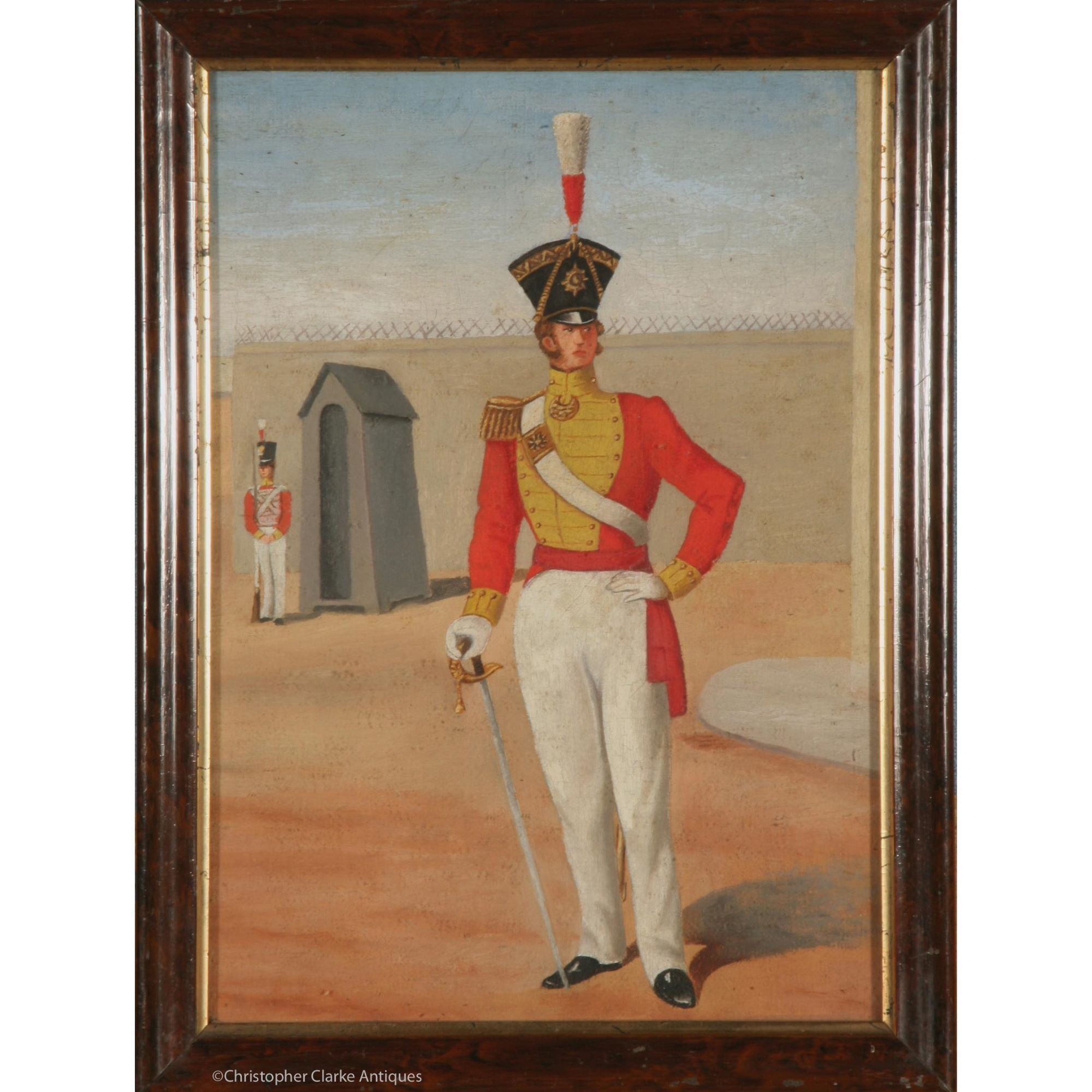 This pair of oil on canvas pictures show a mid to late 18th and an early 19th century soldier and officer respectively. The officer is shown at a barracks with a sentry box to the background and the enlisted man is in a country setting. It is very possible that they were originally panels from a screen that may have shown British Army uniforms through the ages. This would explain the difference in period of the uniforms, the size of the painting etc.