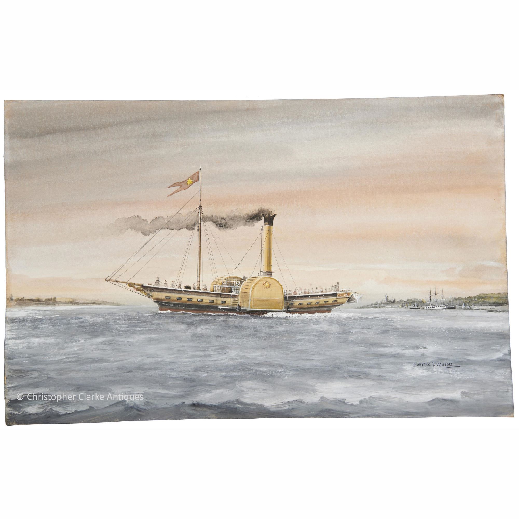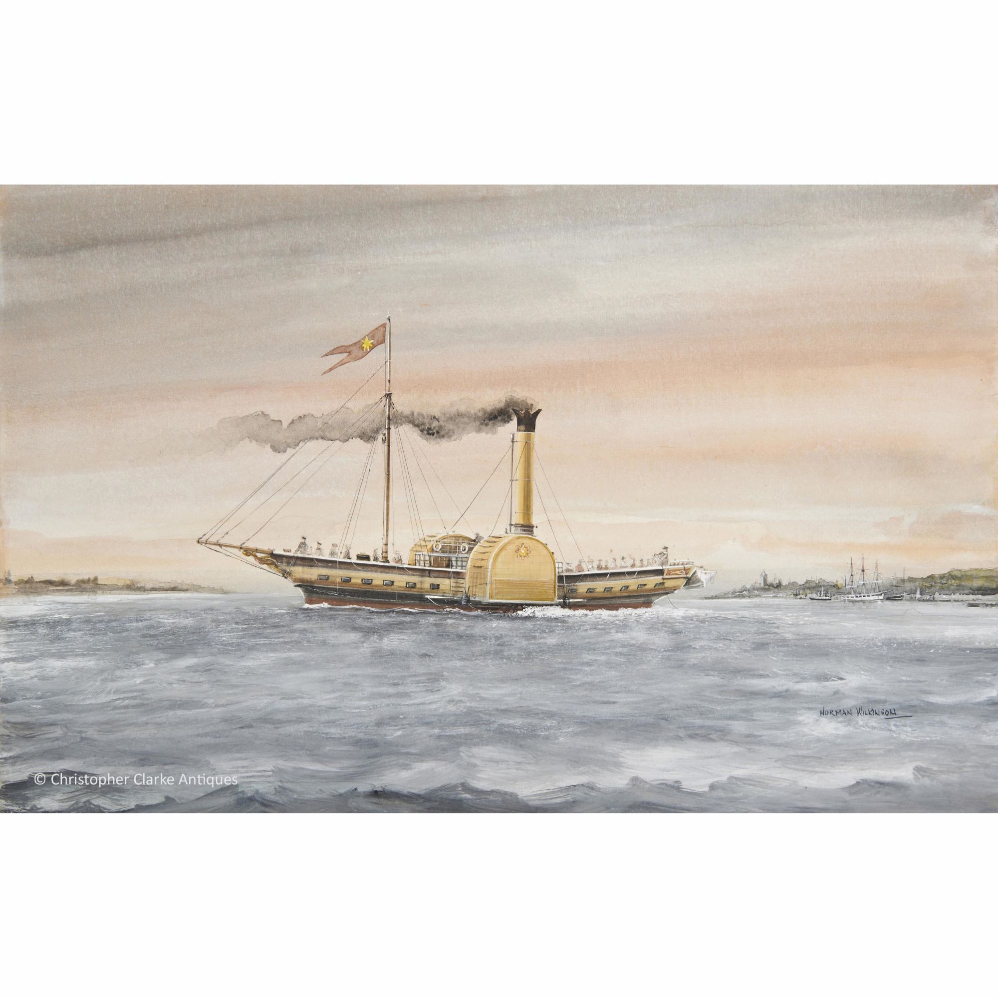 It is probable that this is a retrospective illustration by Wilkinson, perhaps done for a cigarette card or book. As such he may have been either confused in his research of the Vesper and its ownership or amalgamated the information for the purpose of the picture. It is a fine painting and Wilkinson has captured the busy life of a Victorian Steam Packet on the Thames. Circa 1930.
