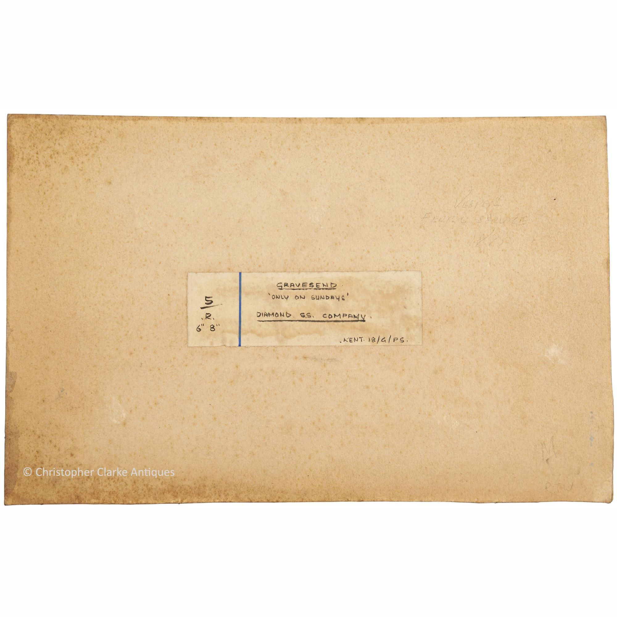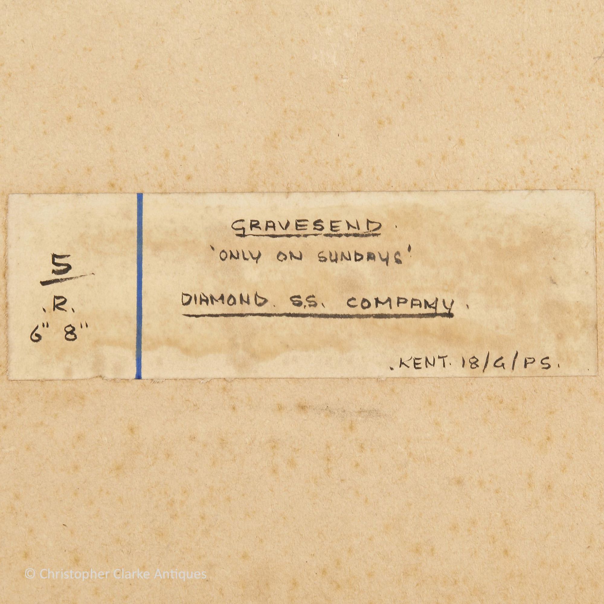 The back of the board has a label with a blue vertical line separating the notes '5 .R. 6" 8"' and 'Gravesend, 'Only On Sundays', Diamond. S.S. Company. .Kent.18/G/PS.'. The front of the picture is signed 'Norman Wilkinson' on the right towards the bottom corner. Written in pencil directly to the back of the board is 'Vesper, Ferry Service, 18##'. The Star Steam Packet Company, founded in 1833, had a wooden Paddle Steamship called Vesper. They were in direct competition with the Diamond Steam Packet Company.