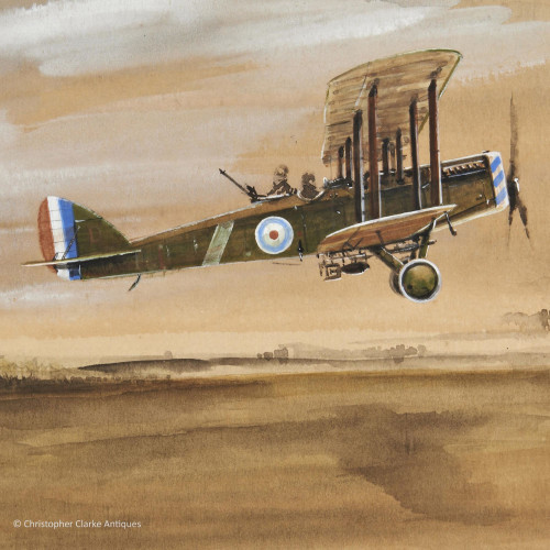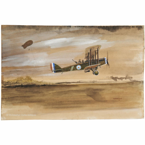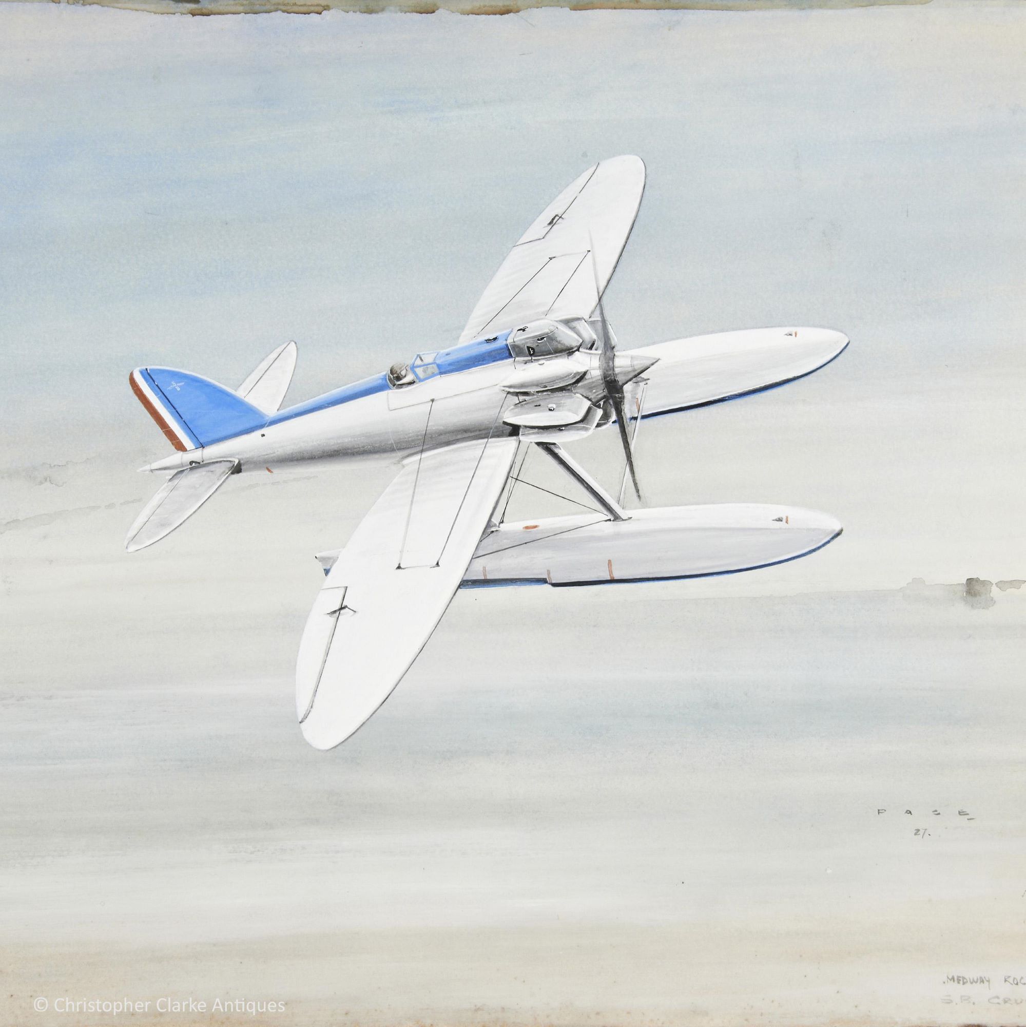 Page's painting accurately depicts an aircraft built for speed and is redolent of an innovative time in airplane manufacture, when several countries were in competition with each other to produce the fastest and the best. Dated 1927.