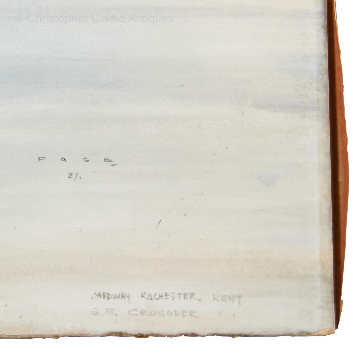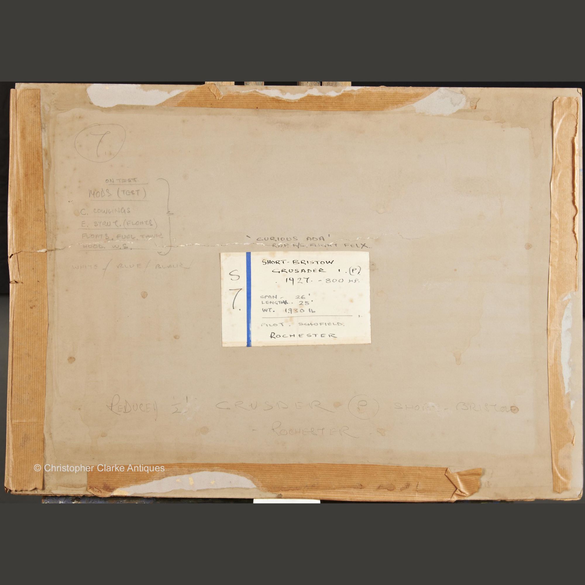 The detail of the plane in flight is shown with a simple, hazy background of the sea merging into the sky on the horizon. It is signed 'Page 27' with 'Medway, Rochester, Kent' and then 'SB Crusader' below. The back has a label noting 'Short-Bristow, Crusader 1. (P) 1927 - 800 H.P., Span - 26', Length - 25', Wt. 1.930lb, Pilot. Schofield. Rochester'. Above the label is written 'Curious Ada' 'RAF H/S. Flight Felx.' Written in pencil to the top left on the back is '7, On Test. MODS (Test), C. Cowlings, E. Strut. (Floats), Floats, Fuel Tank, Hood. W.S., White / Blue / Black'. Again, in pencil along the bottom of the board is written 'Reduced 1/2, Crusader P Short - Bristow - Rochester.'