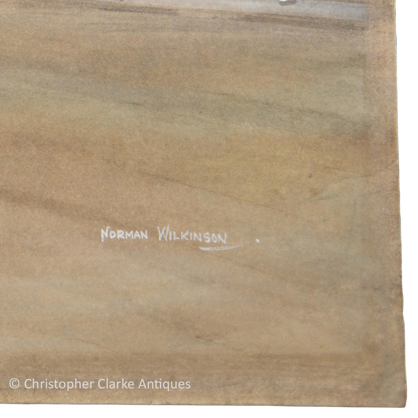 The plane is shown in the middle of the day with its shadow on the ground below. Some aircraft sheds are shown to the right of the picture to the middle, with two planes in front of them. The painting is signed in white 'Norman Wilkinson' below the sheds.