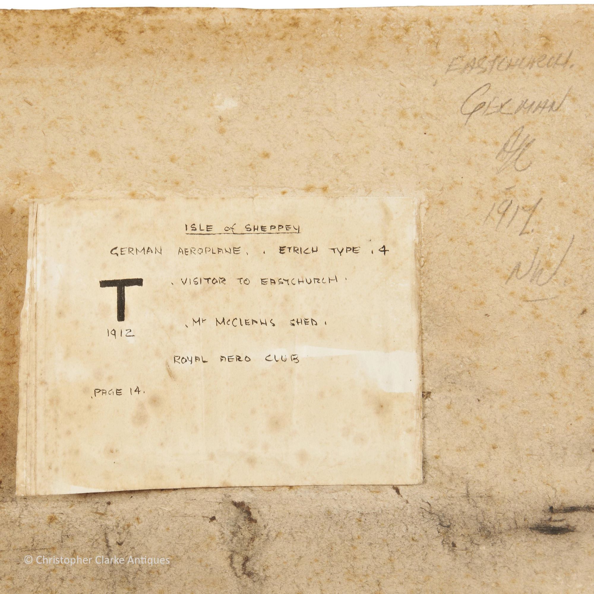 The back of the illustration has a paper label giving the details of 'Isle of Sheppey, German Aeroplane, Etrich Type 4, Visitor To Eastchurch. Mr McCleans Shed. Royal Aero Club, Page 14' with a large T and the date 1912. Written in pencil to the board is 'Eastchurch. German AIC - 1912 NW'. It's possible that this picture was made for The Royal Aero Club's weekly Flight magazine.