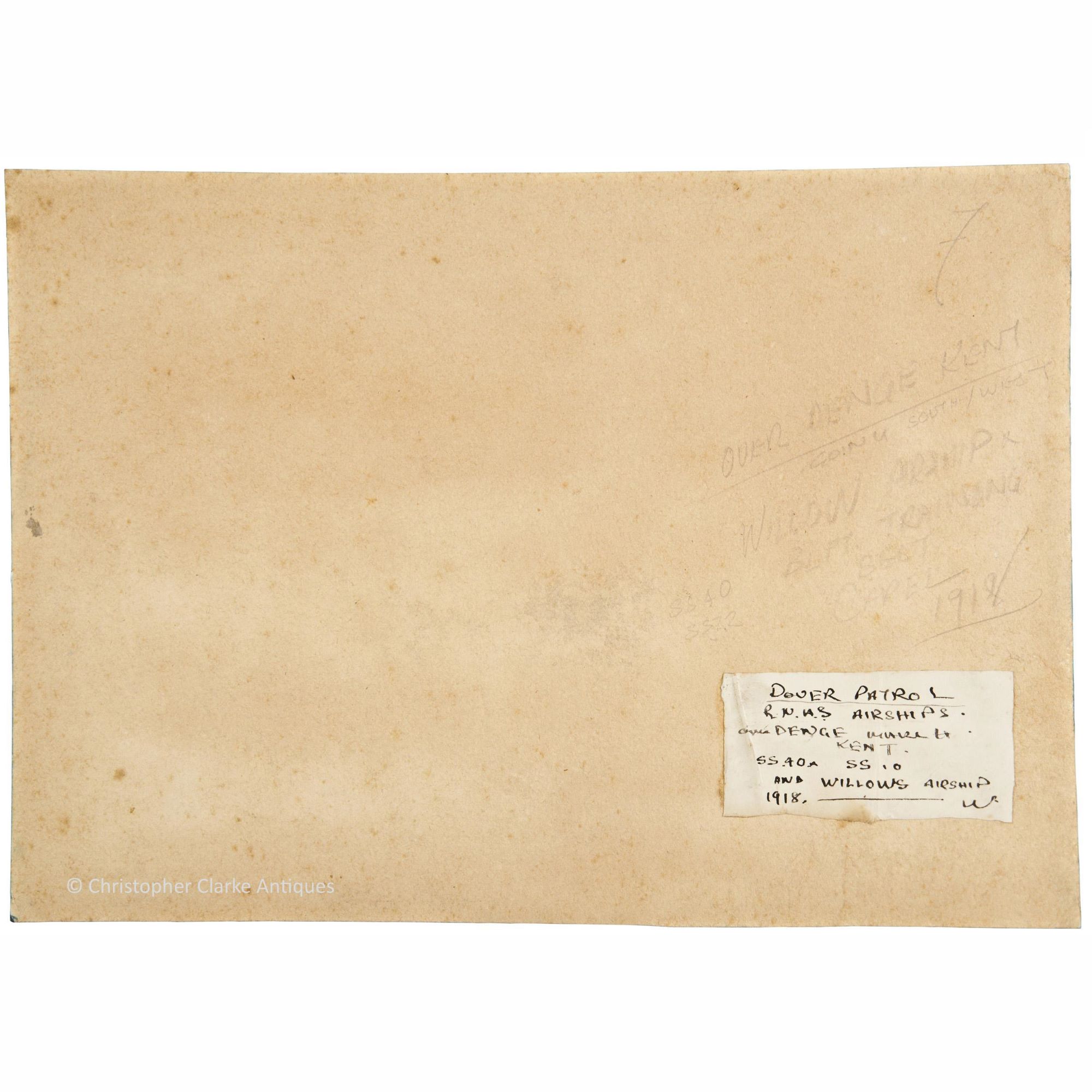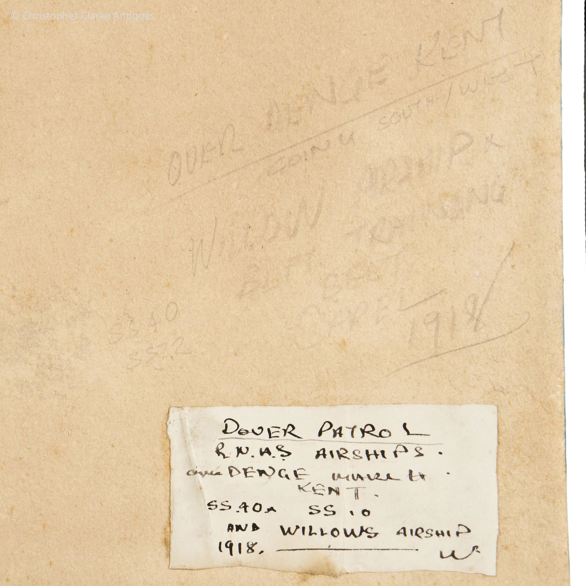 The painting is signed 'Norman Wilkinson 18' towards the bottom left corner and below, by the edge is written 'Denge Kent'. Further information is given to the back of the board, although some words are difficult to be sure of, indicated by (?). There is a label giving the details of the scene: 'Dover Patrol, R.N.A.S. Airships., over (?) Denge March 11(?), Kent, SS 40A, SS 10 and Willows Airship, 1918.' Written in pencil to the board is '7, Over Denge Kent, Going South / West, Willow Airship, SS40, SS12, BLFT (?) Training, Belt (?), Capel, 1918'.