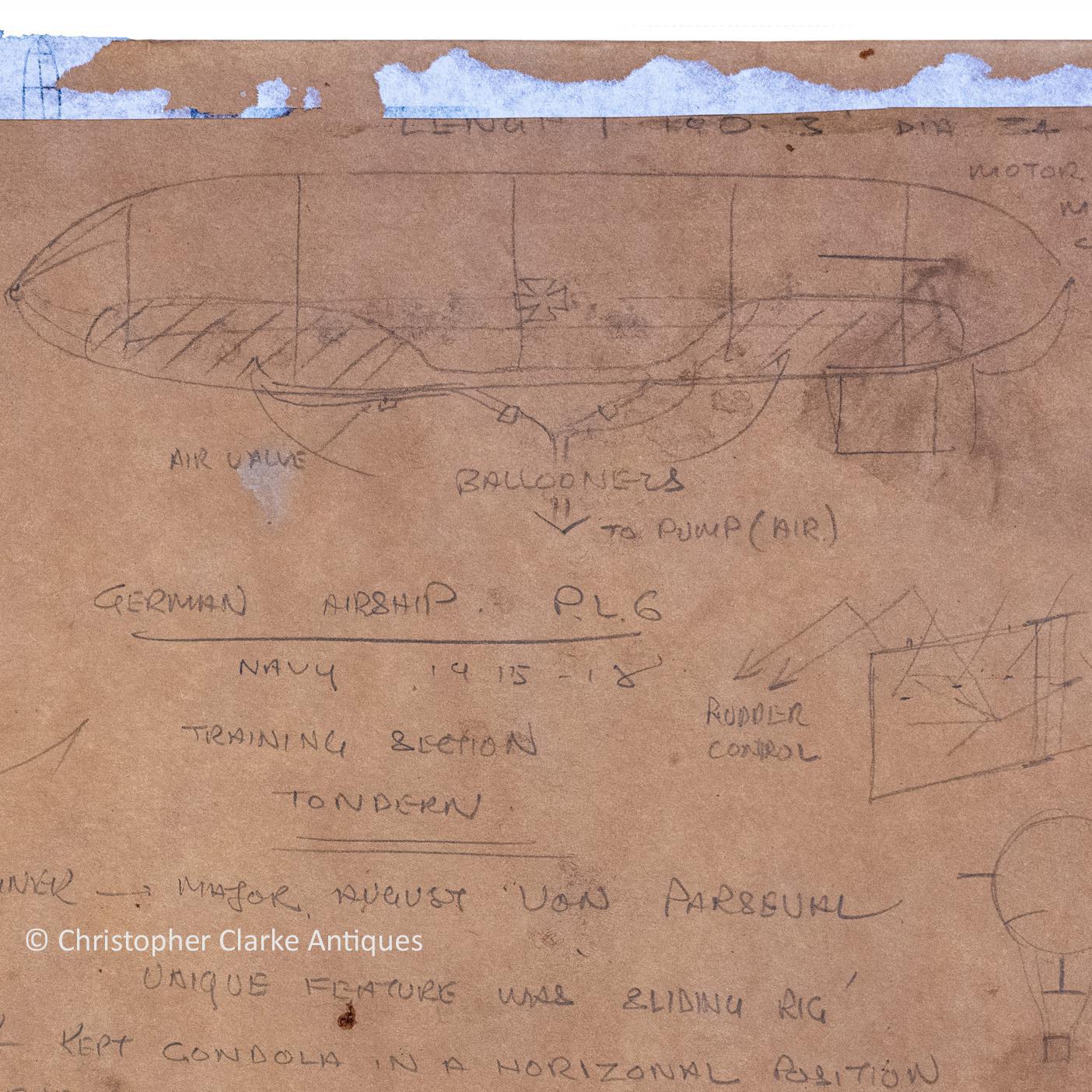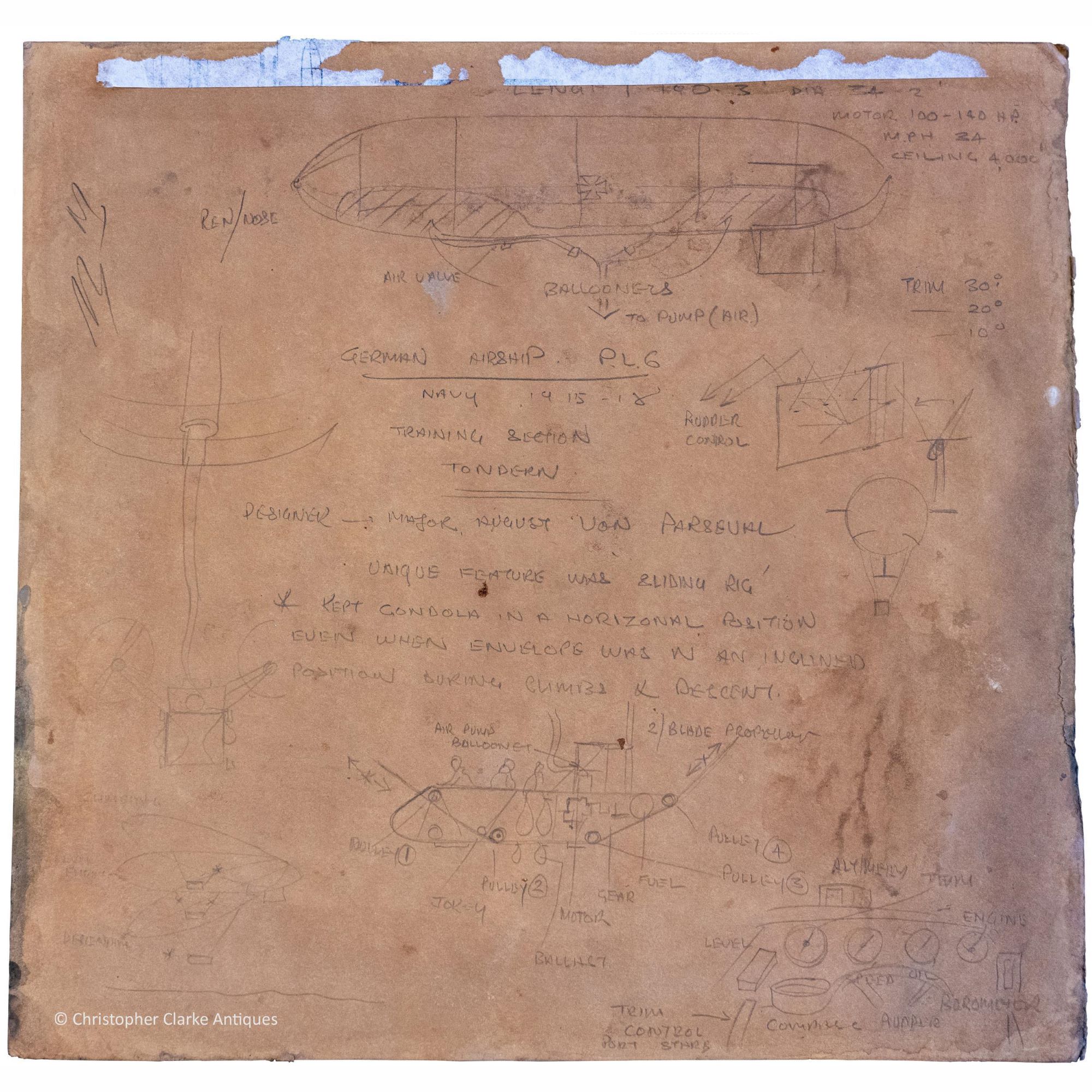 The whole of the back of the board is covered with pencil notes and drawings by Arnold, giving detail on the PL6. This suggests that the illustration was done for intelligence purposes on enemy aircraft. The linear drawing to the top indicates the positions of the air valve, air balloonets etc. Other drawings show the different parts of the gondola from the propellor and motor to the ballast bags and pulleys. The motor of 100-140 HP, speed of M.P.H. 34 and ceiling of 4000 feet are noted. is given and that the 'Unique Feature Was Sliding Rig' with an illustration showing the nose in 3 different positions whilst the gondola remains horizontal. There is even a drawing of the pilots instruments on the dashboard. The title of 'German Airship P.L.6., Navy .9.5 - 18, Training Section Tondern' along with 'Designer 'Major August Von Parseval' are written to the centre of the back of the board. In July 1918, 7 Sopwith Camels launched from HMS Furious attacked and destroyed the German's main airship base at Tondern (now Tonder, Denmark).