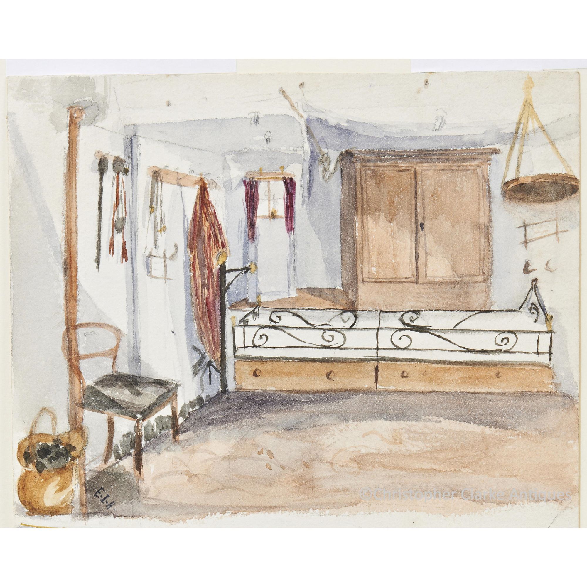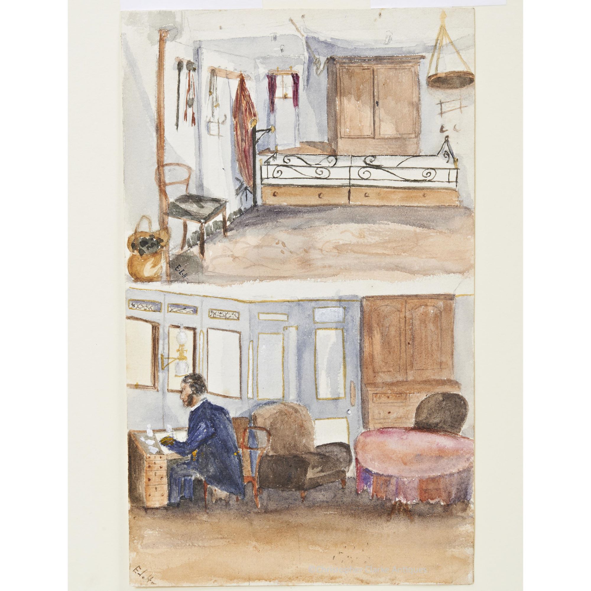 To the front they are both initialled 'E.I.H.' to the bottom left-hand corner. The artist is likely to be Emily Isabel Hood, the daughter of HMS Monarch's Captain. Emily would have been 15 years old at the time and perhaps painted the pictures to occupy herself whilst her father, who is pictured at his desk, was busy with paperwork.