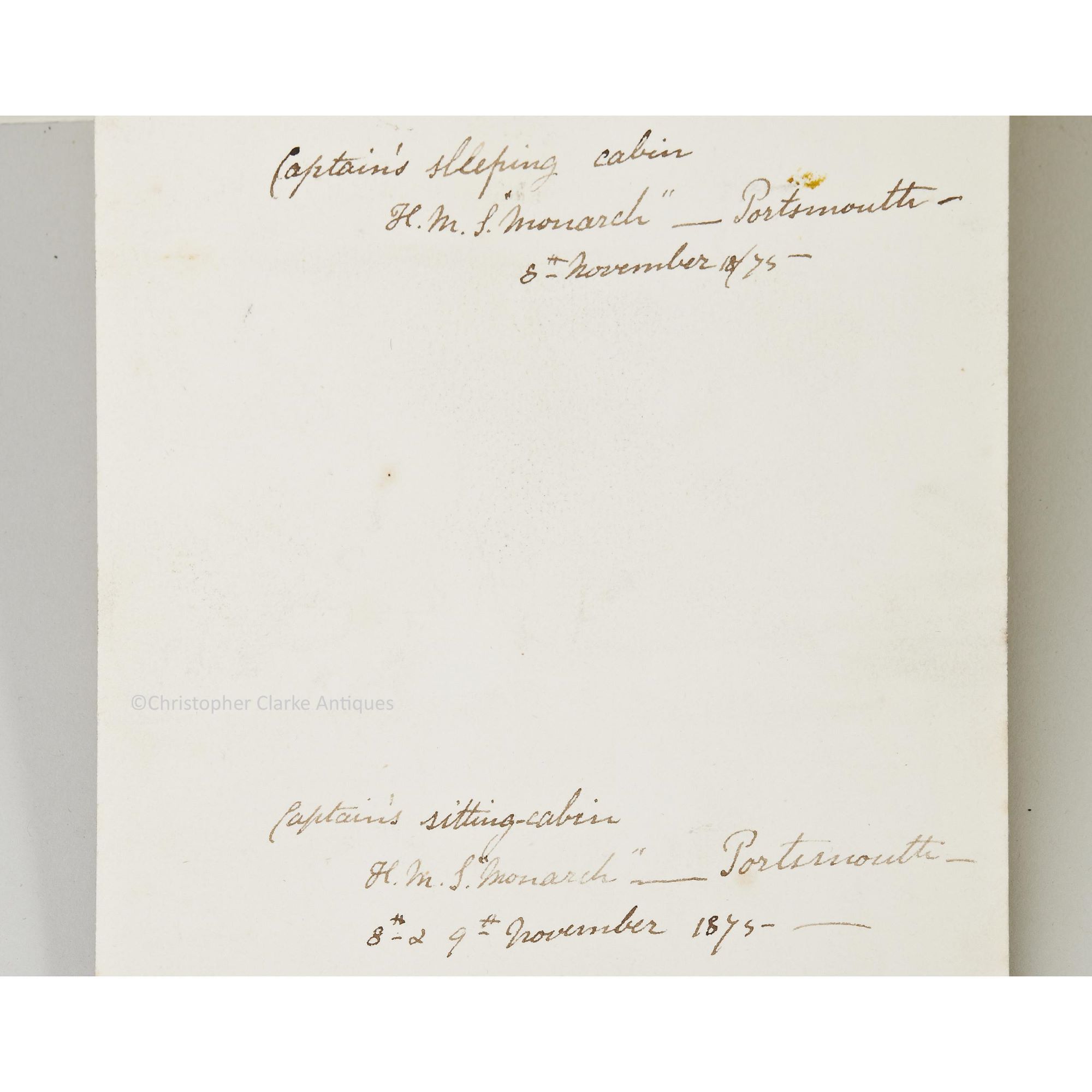 A pair of small, amateur watercolours on one piece of paper annotated to the reverse in pencil with 'Captain's Sleeping Cabin H.M.S. Monarch - Portsmouth - 8th November 1875' and 'Captain's Sitting Cabin H.M.S. Monarch - Portsmouth - 8th & 9th November 1875'.
