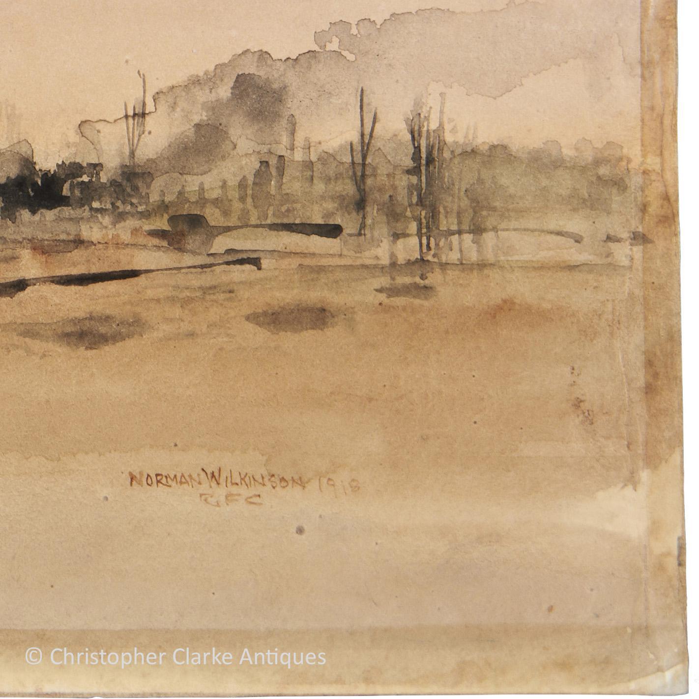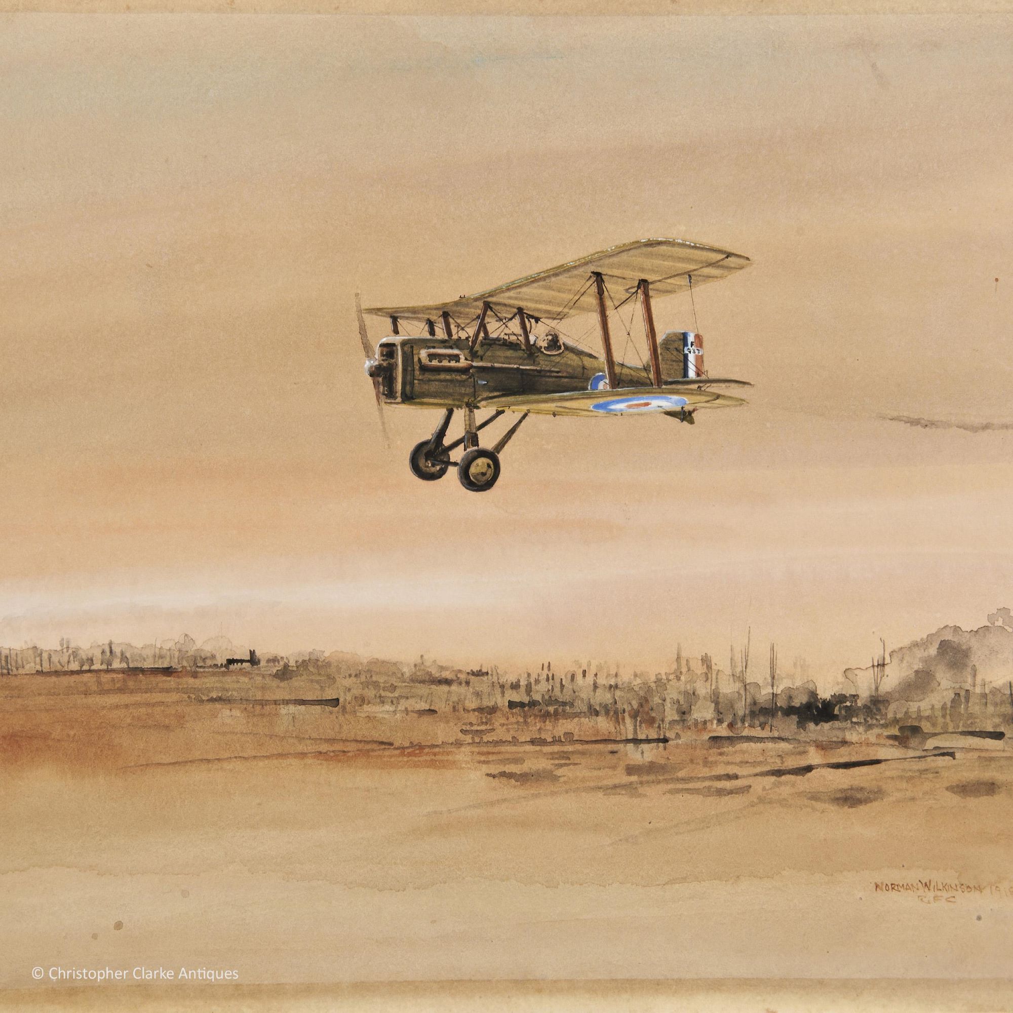 The image is a classic and evocative WWI scene of a lone biplane over no man's land with the desolate ground and burnt trees in the background. The painting is signed Norman Wilkinson 1918 RFC.
