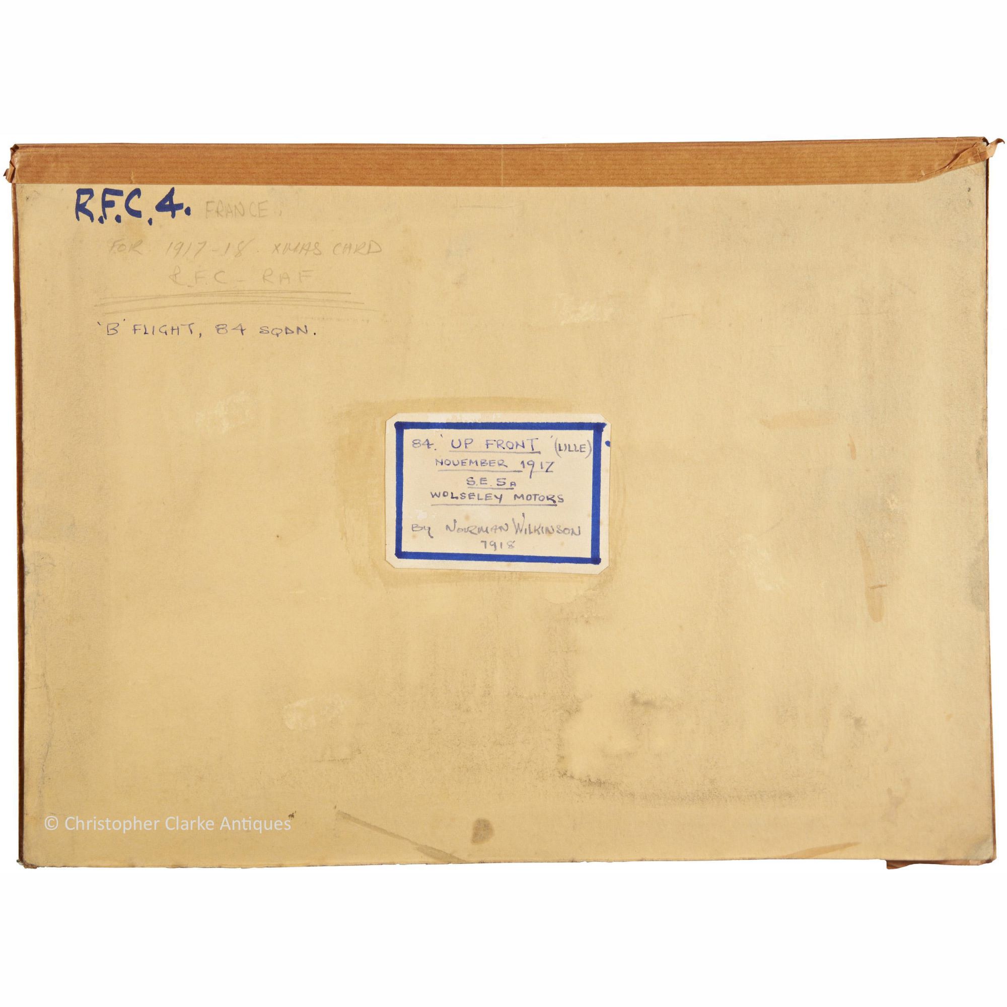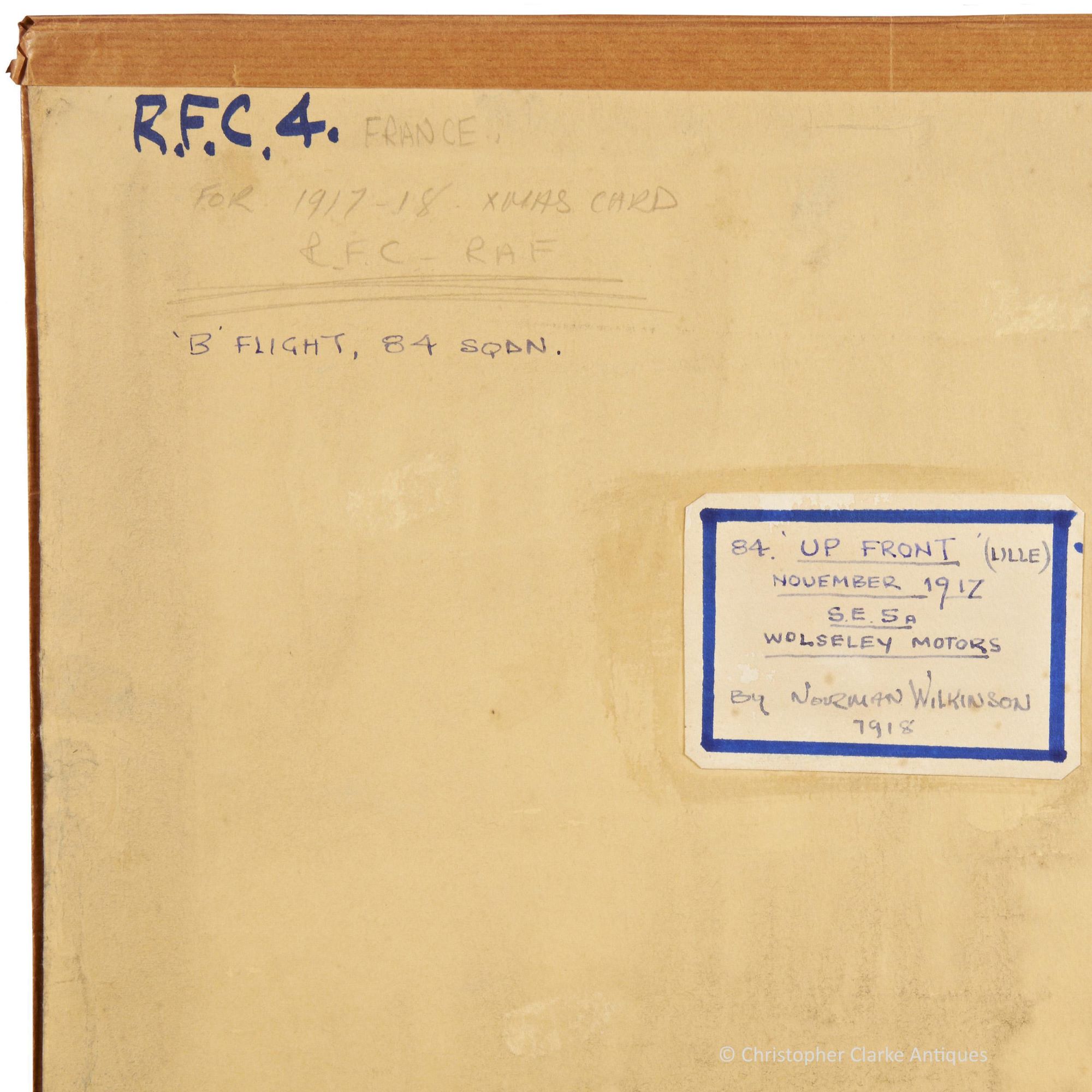 The label to the back of the board states '84. Up Front (Lille) November 1917, S.E.5A, Wolseley Motors, By Norman Wilkinson 1918'. Also written, direct to the board is 'R.F.C.4. France For 1917-18 Xmas Card, R.F.C.- RAF, B Flight, 84 SQDN.' The contradiction in date to that on the image is probably due to Wilkinson later painting the picture from earlier sketches or photographs.