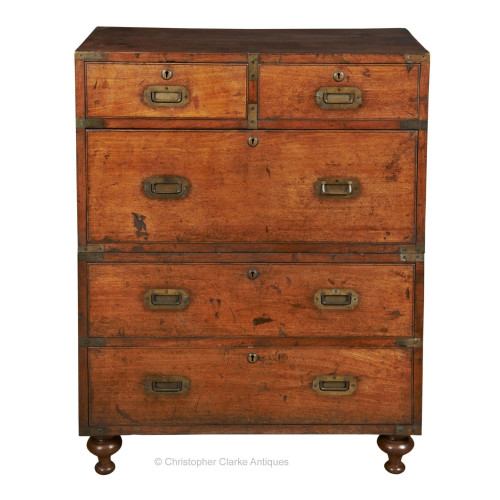 The flush brass drawers handles are common to many Chinese Export campaign chests. The drawers fronts have inlaid horn line decoration, another feature known to Chinese campaign furniture. The chest has raised round escutcheons and pseudo Bramah locks. The cabinet maker has also written 'Up' in Mandarin to the inside of the backboards, further confirming its origin. The brass drawer handles are typical of Chinese Export chests as are the brass carrying handles to the sides, which you are unlikely to find on an English campaign chest. The chest stands on bracket feet.