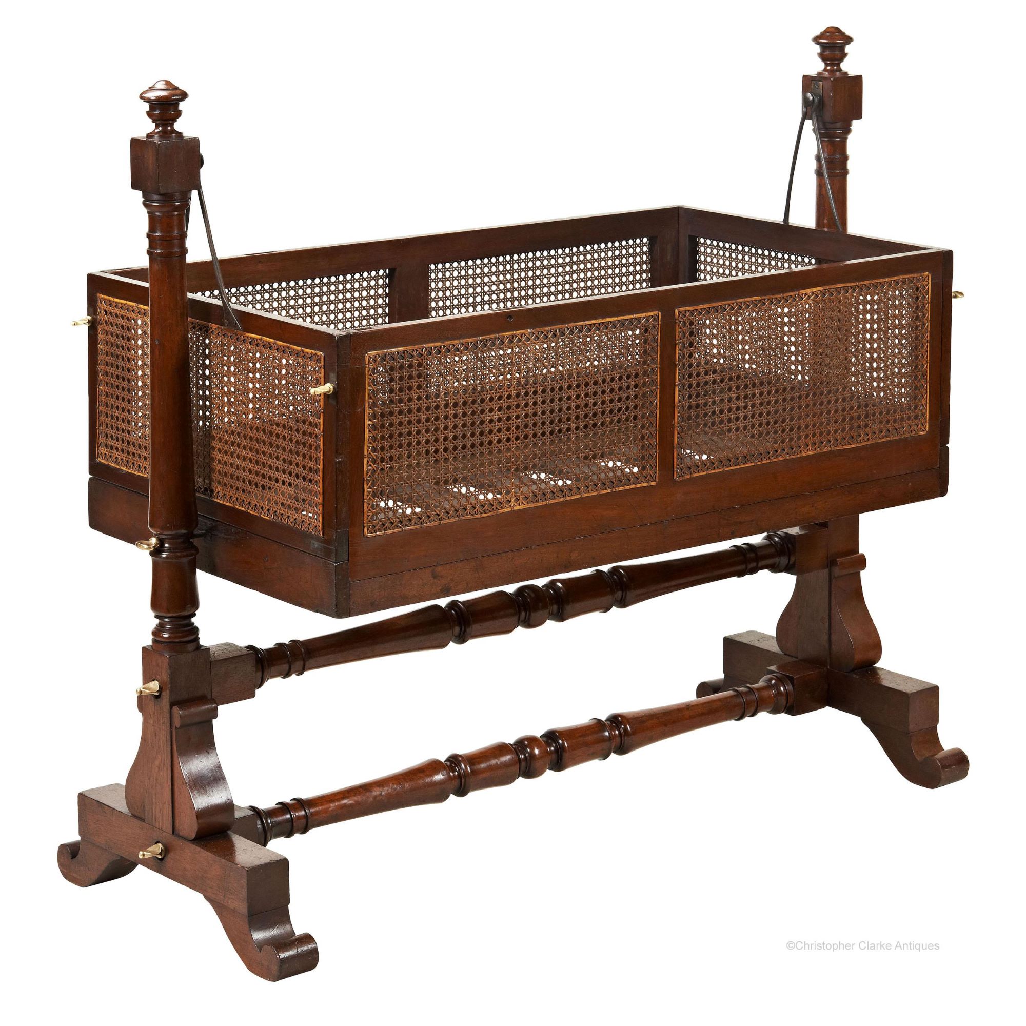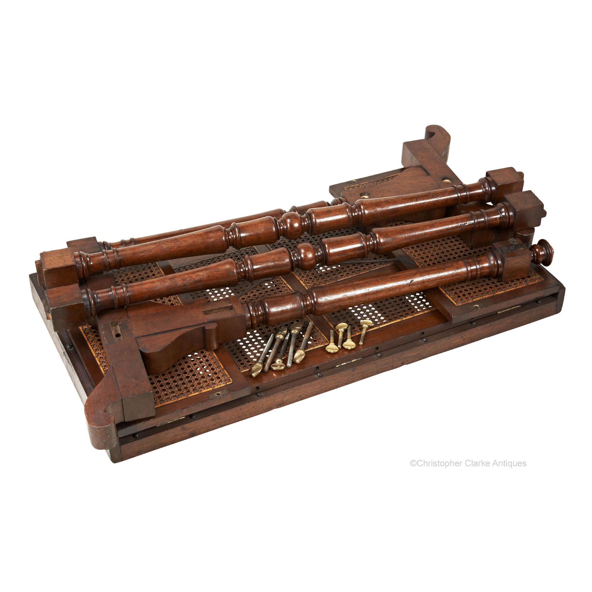This campaign Cot is fixed with brass bolts to dismantle the 2 end columns from the pair of turned stretchers that unite them. The cot has an iron fitting to each end so that it can swing on the end posts. It also has a bolt to prevent it from swinging, if desired. The cot has caned sides for the air to circulate easily and a slatted pine base to take a mattress. The sides are all hinged to the base but fixed to the top corners by bolts so that it can be flat packed. There is evidence that it once had a removable hood. The cot is made with bold turnings and wide feet to give it rigidity and is a well-made piece of antique travel furniture. Circa 1830.