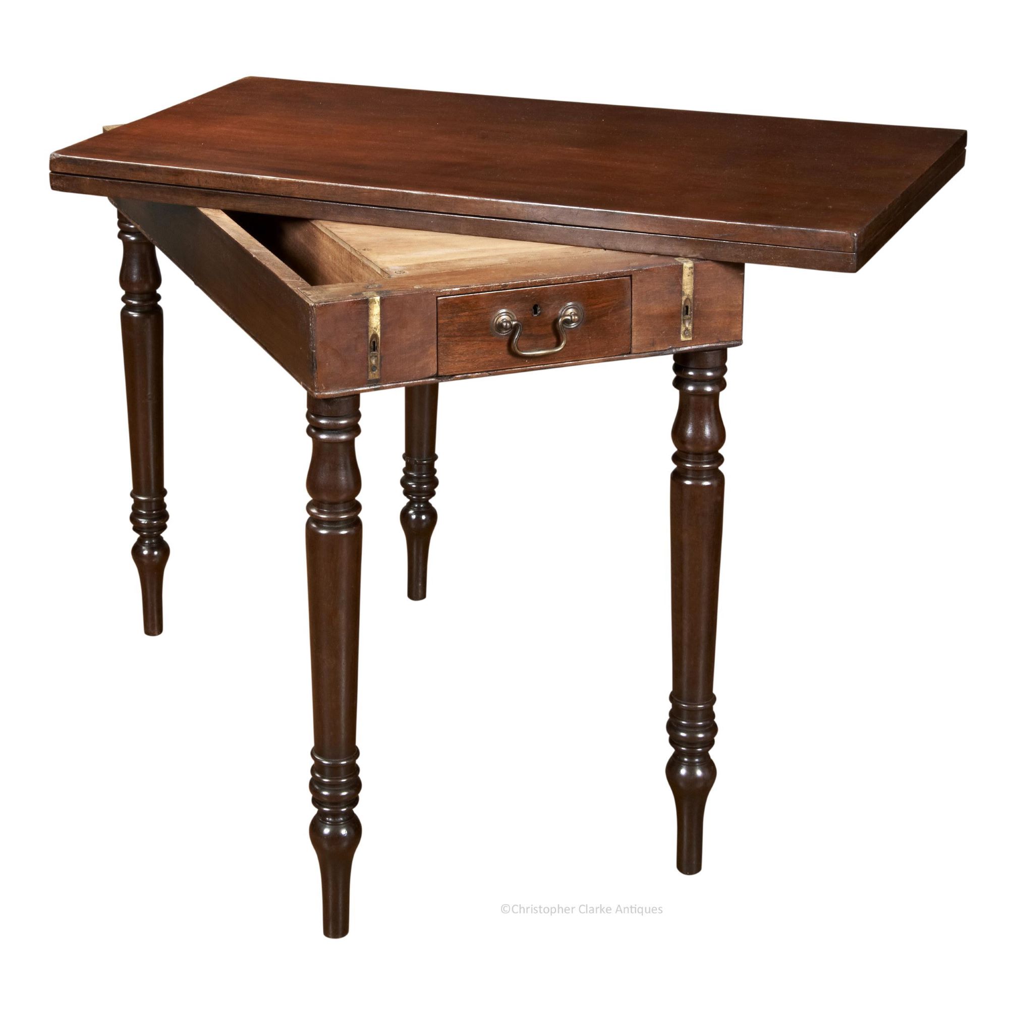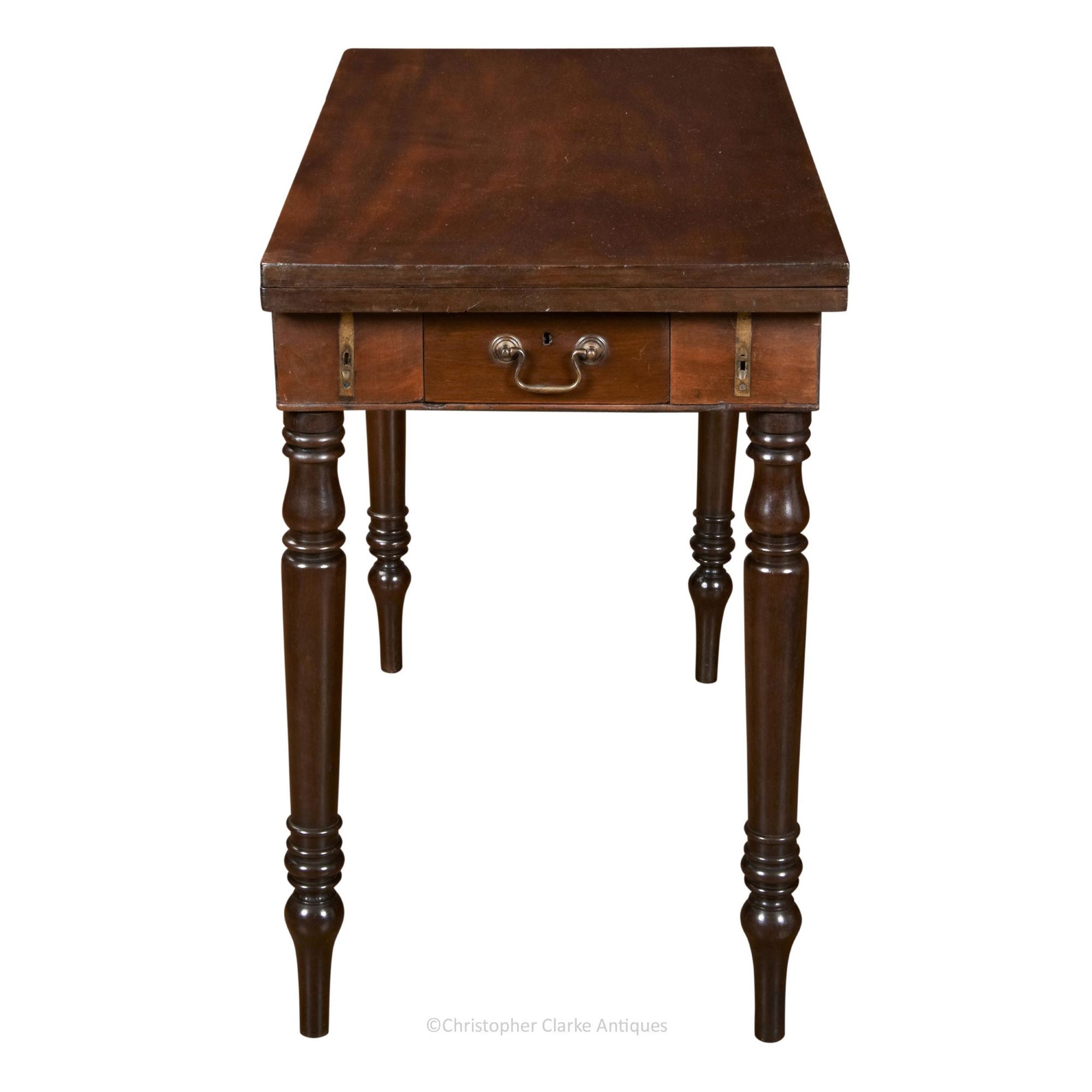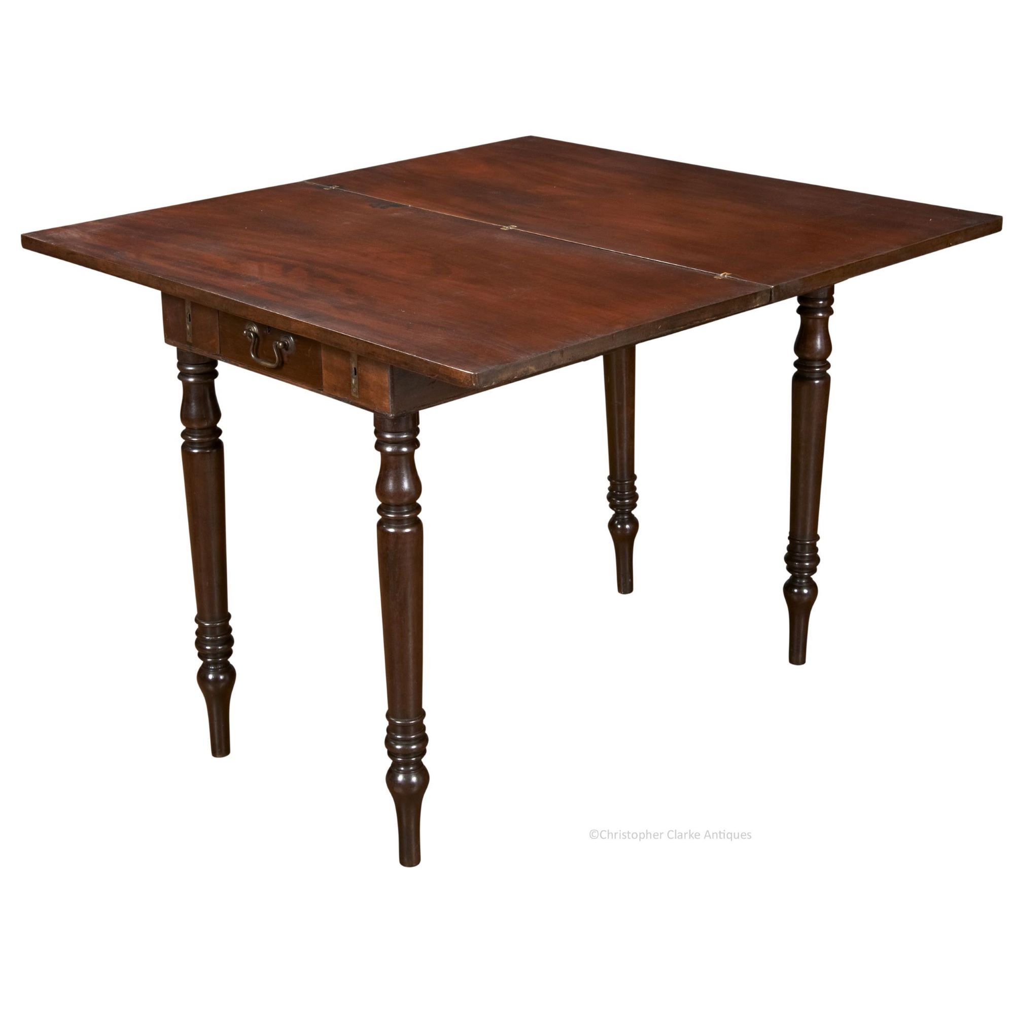 The turned legs are fitted with long steel bolts to fix them securely to the top. When the table is used with the top folded, two brass slide bolts either side of one drawer, lock the top to hold its position. This is a design of portable table that seems to have been made by a few different workshops and its practicality as a side, work and dining table shows why it would have been a popular piece of furniture. Early 19th Century.