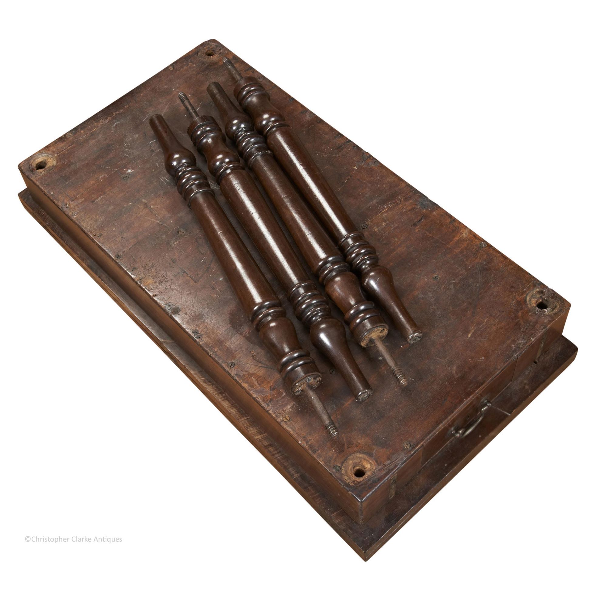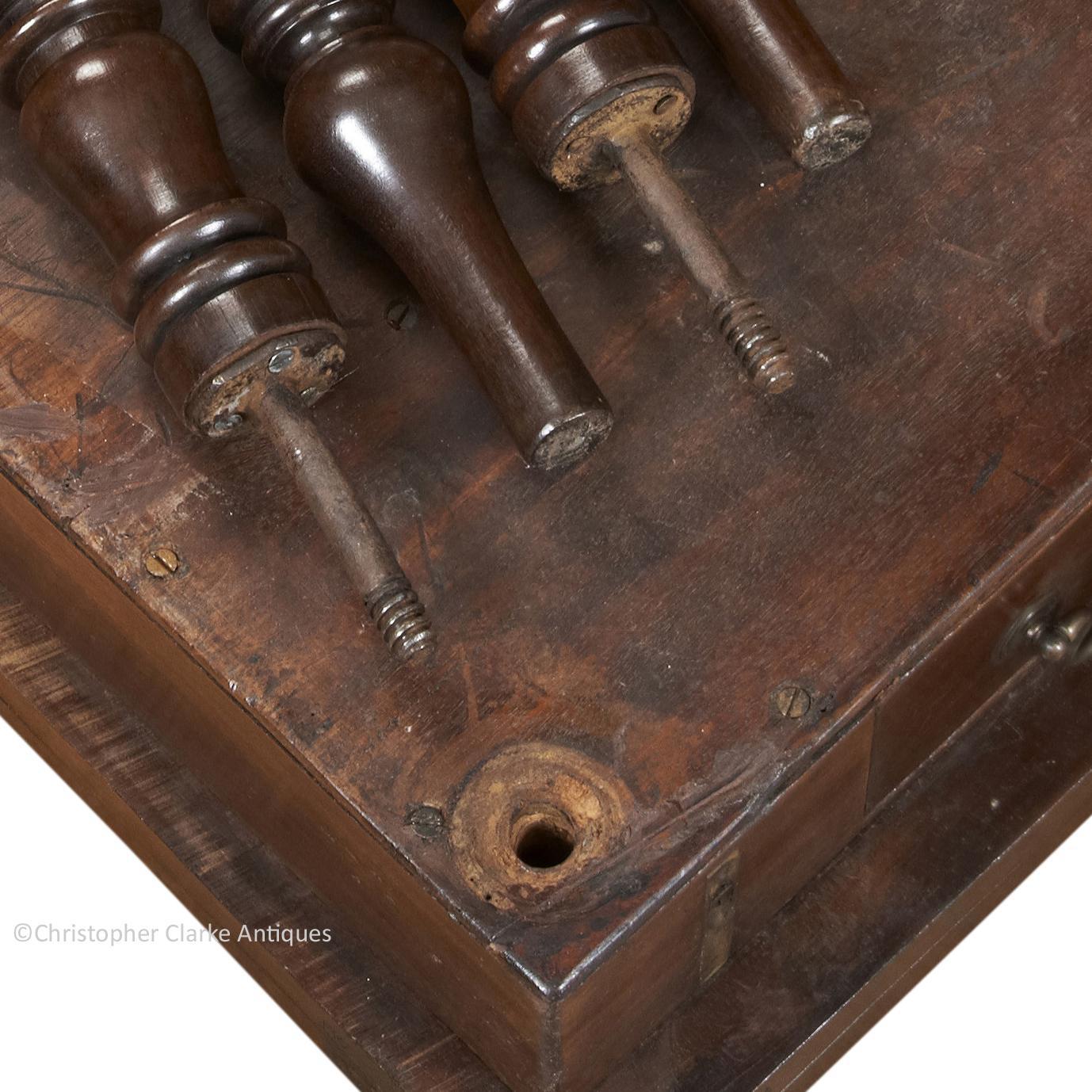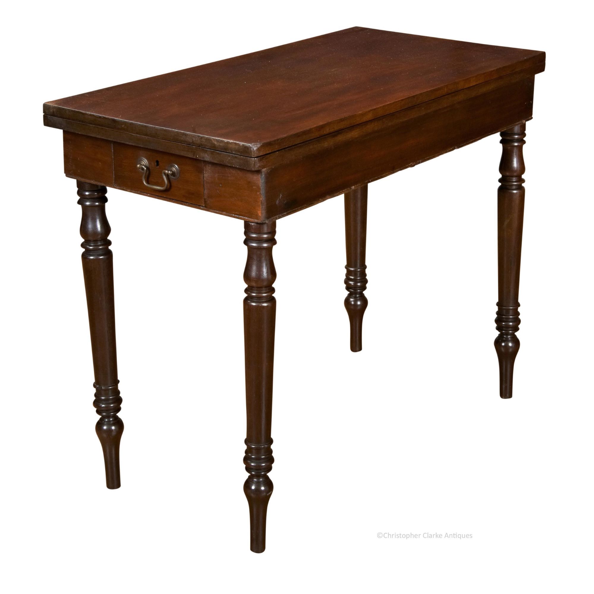 The turned legs are fitted with long steel bolts to fix them securely to the top. When the table is used with the top folded, two brass slide bolts either side of one drawer, lock the top to hold its position. This is a design of portable table that seems to have been made by a few different workshops and its practicality as a side, work and dining table shows why it would have been a popular piece of furniture. Early 19th Century.