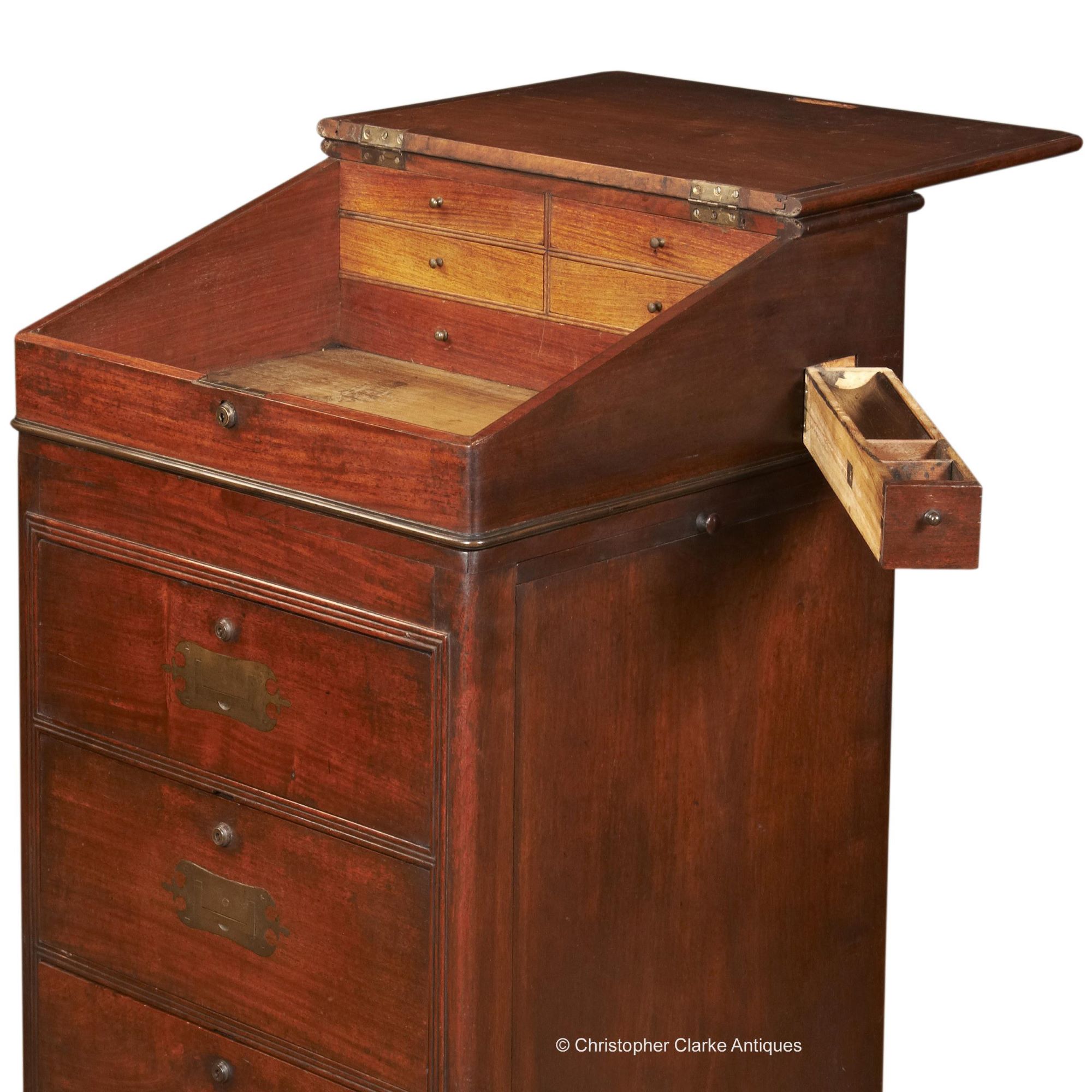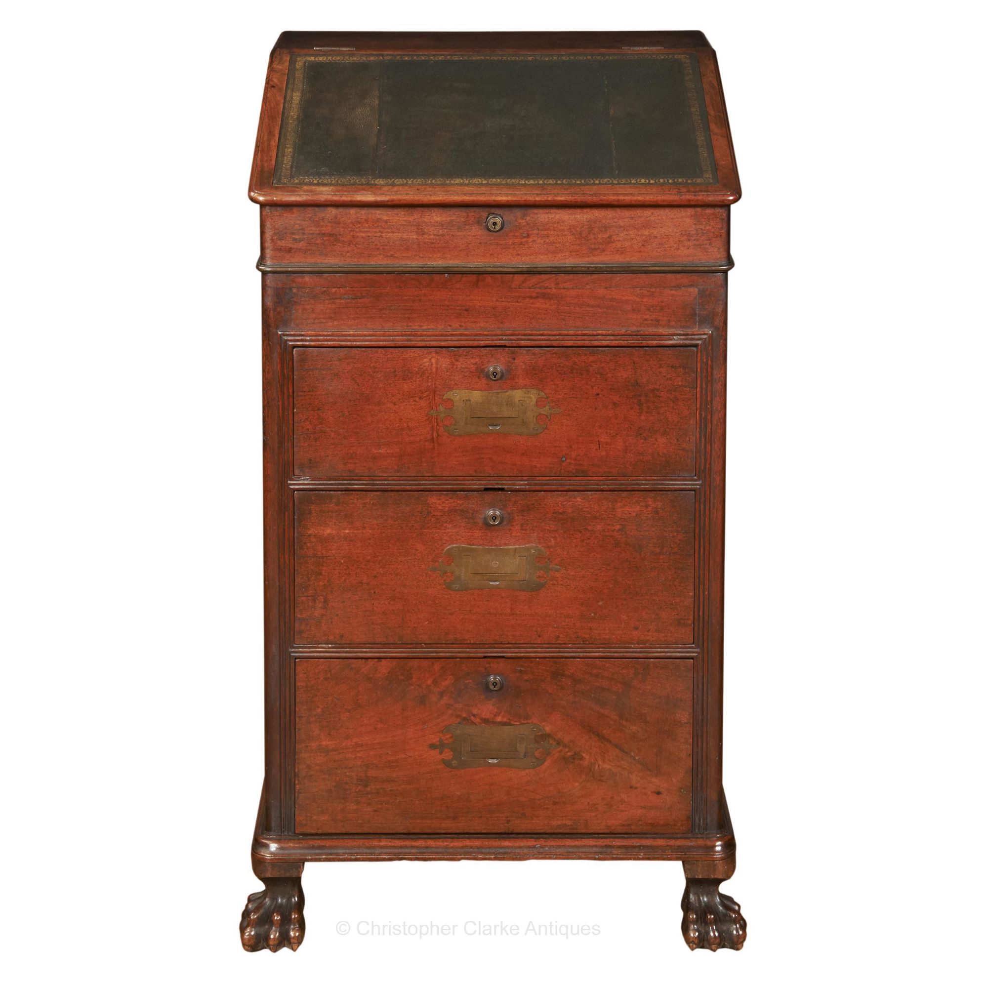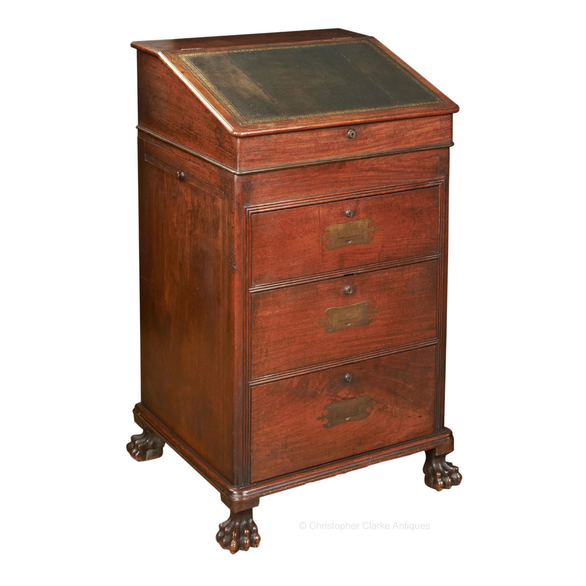 This camphor wood Davenport is typical of many made in the eastern ports by Chinese cabinet makers for the Western market. However, it stands out for being much taller than most others, set at a height to stand at rather than sit. Its approximately 6 inches taller than most Davenports. The ornate shape of the flush campaign handles, the reeded moulding around the drawers and the lion's paw feet are all clues to its origin. The design follows that of an English Davenport but the hand is very much Chinese. The lock is marked Bramah and there is a key which works on one of the large side drawers.