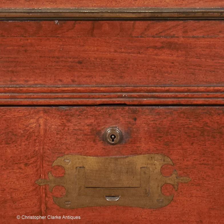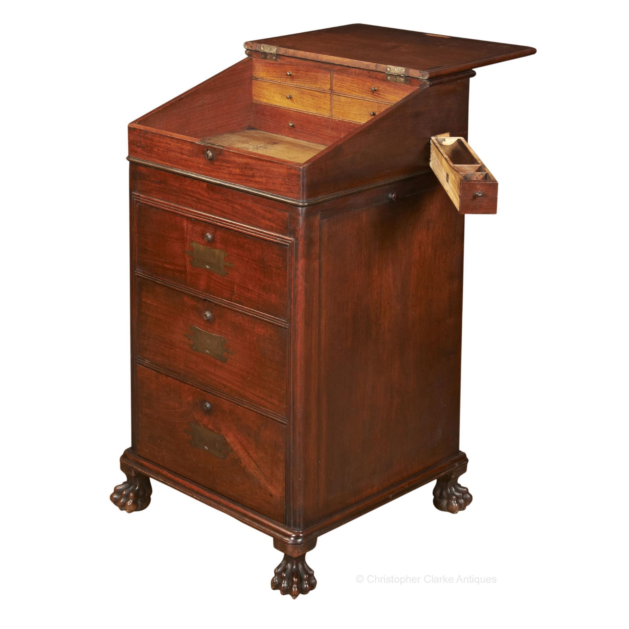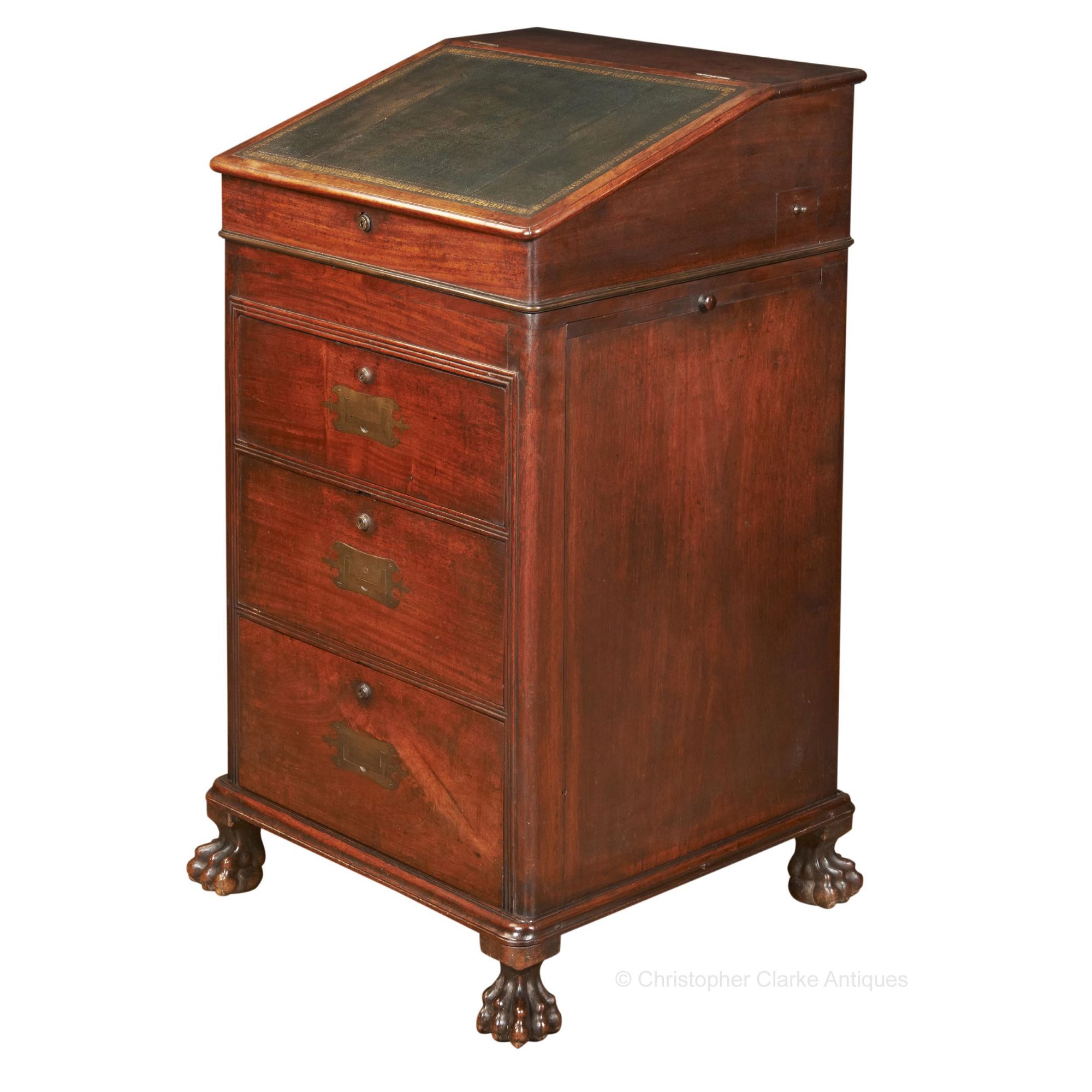 This camphor wood Davenport is typical of many made in the eastern ports by Chinese cabinet makers for the Western market. However, it stands out for being much taller than most others, set at a height to stand at rather than sit. Its approximately 6 inches taller than most Davenports. The ornate shape of the flush campaign handles, the reeded moulding around the drawers and the lion's paw feet are all clues to its origin. The design follows that of an English Davenport but the hand is very much Chinese. The lock is marked Bramah and there is a key which works on one of the large side drawers.