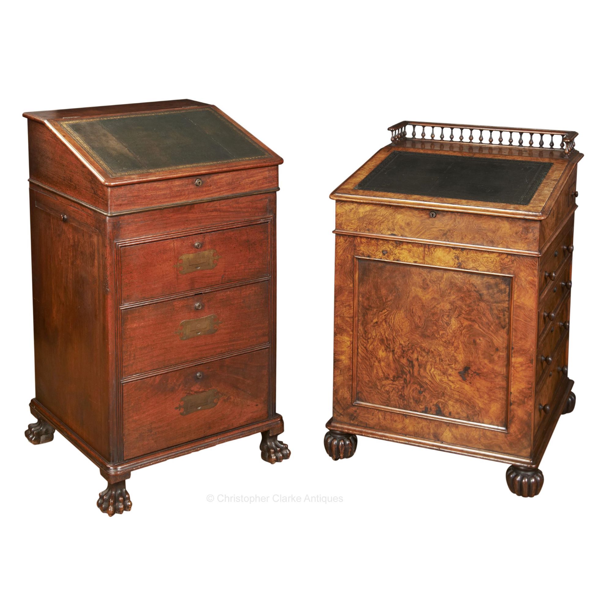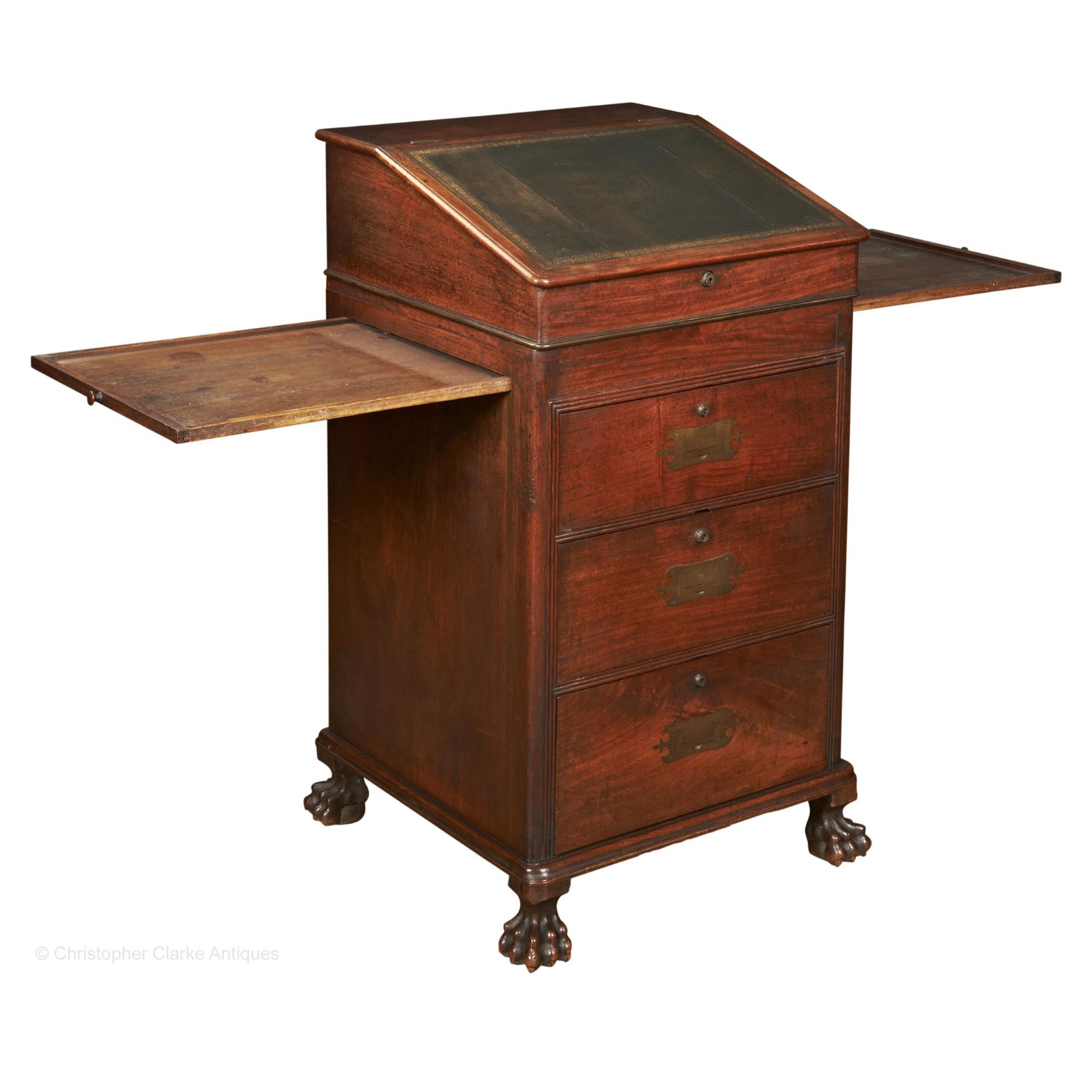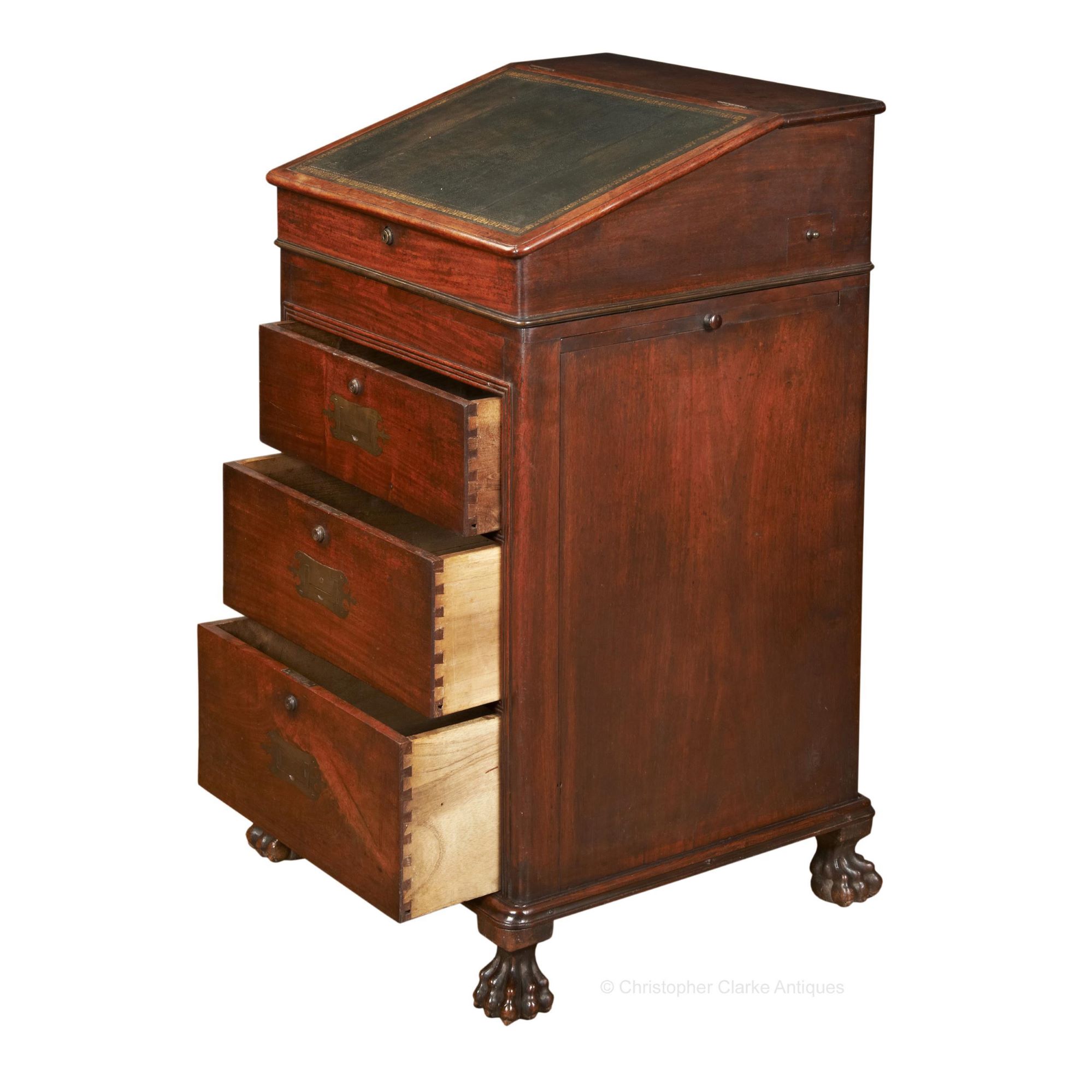 It has a tray with a low gallery to each side, pulled out by a wooden knob. The drawers are to the front of the desk as opposed to the side, as they normally would be on an English example. Under the dark green, gilt tooled leather, sloped writing surface is a well with 3 rows of small drawers, the bottom row of which is a dummy. On the right hand side of the desk it has an ink drawer, which is fairly normal for most Davenports. It is released by pulling the brass knob handle to the bottom right internal drawer. The Davenport sits well on lion paw feet.