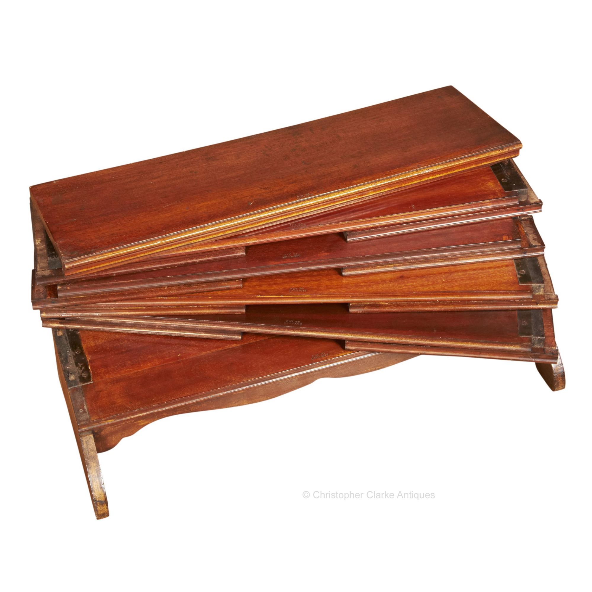 The base, with its shaped feet joined by the bottom shelf, has a plate with cut outs to receive the end boards from the shelf above. The bookcase is finished off by sitting a simple cornice board on to the top shelf. Each shelf is stamped with 'Pat No. 25079/13'. Patents of this date are not easy to research but it may be American or New Zealand with the 13 referring to its year.