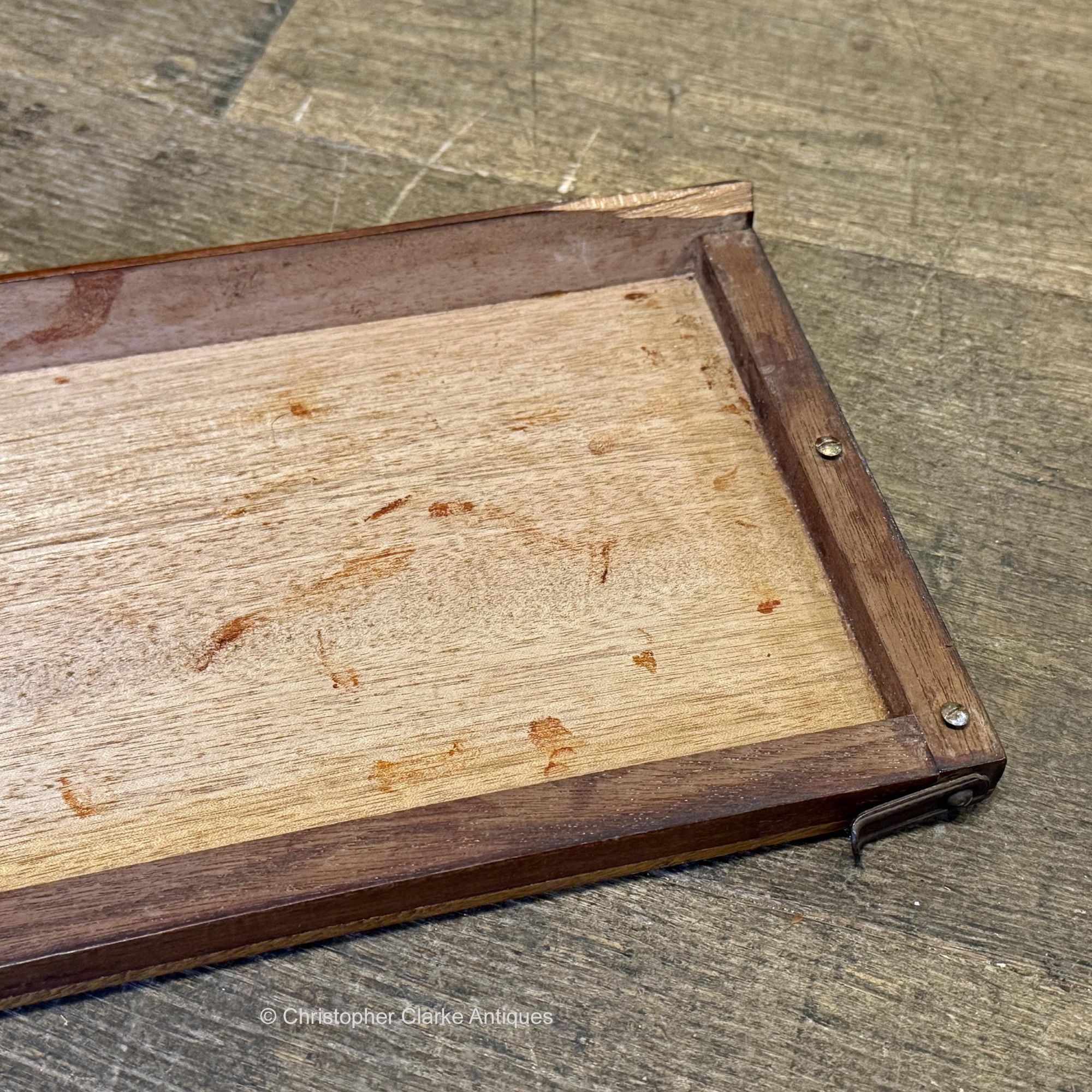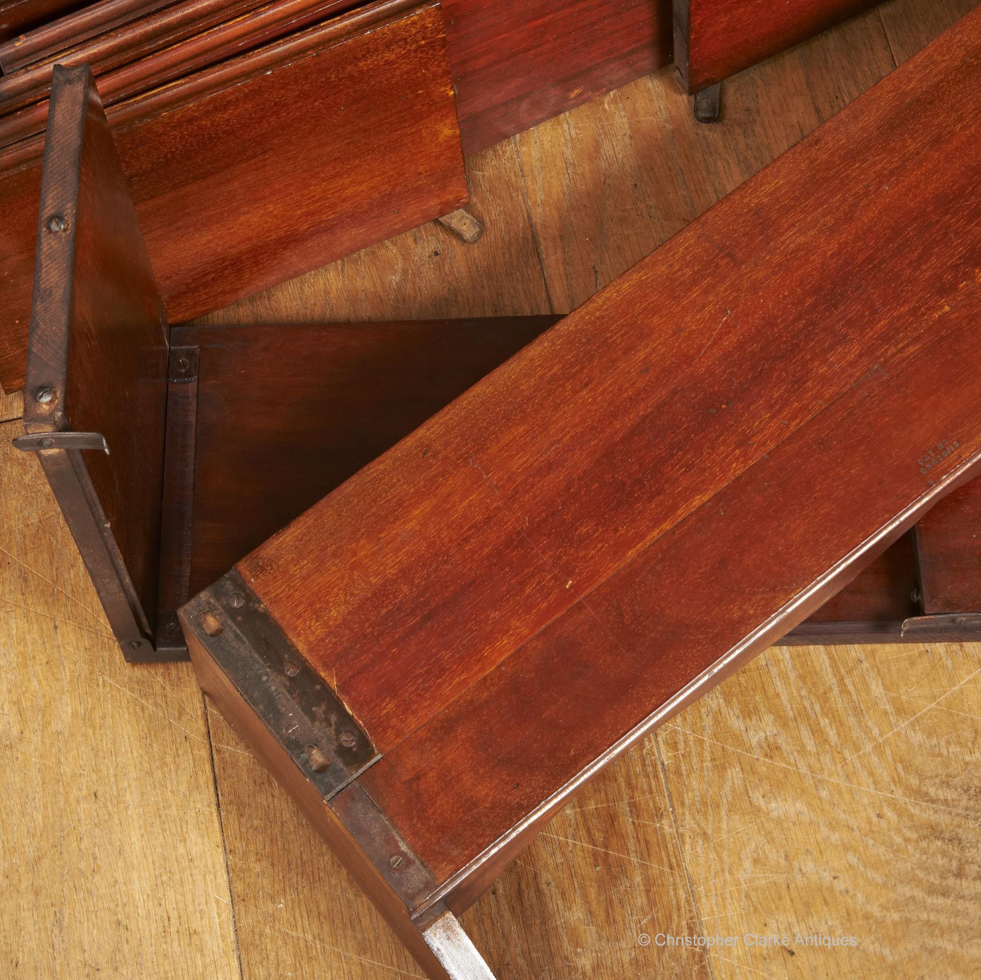 Each shelf is fixed to the end boards that separate them from the shelf below by pressed metal hinge fittings. The plate of these elaborate hinges sits on top of the edges of the shelf to be covered by the end boards of the shelf above, when they are unfolded to a form a right angle to their shelf. The plates have two pear shaped cut outs to receive two dome headed screws fitted to the bottom edge of the end boards. The screws slide backwards in the cutouts, and the end boards are then held in place by swing catches to their back.