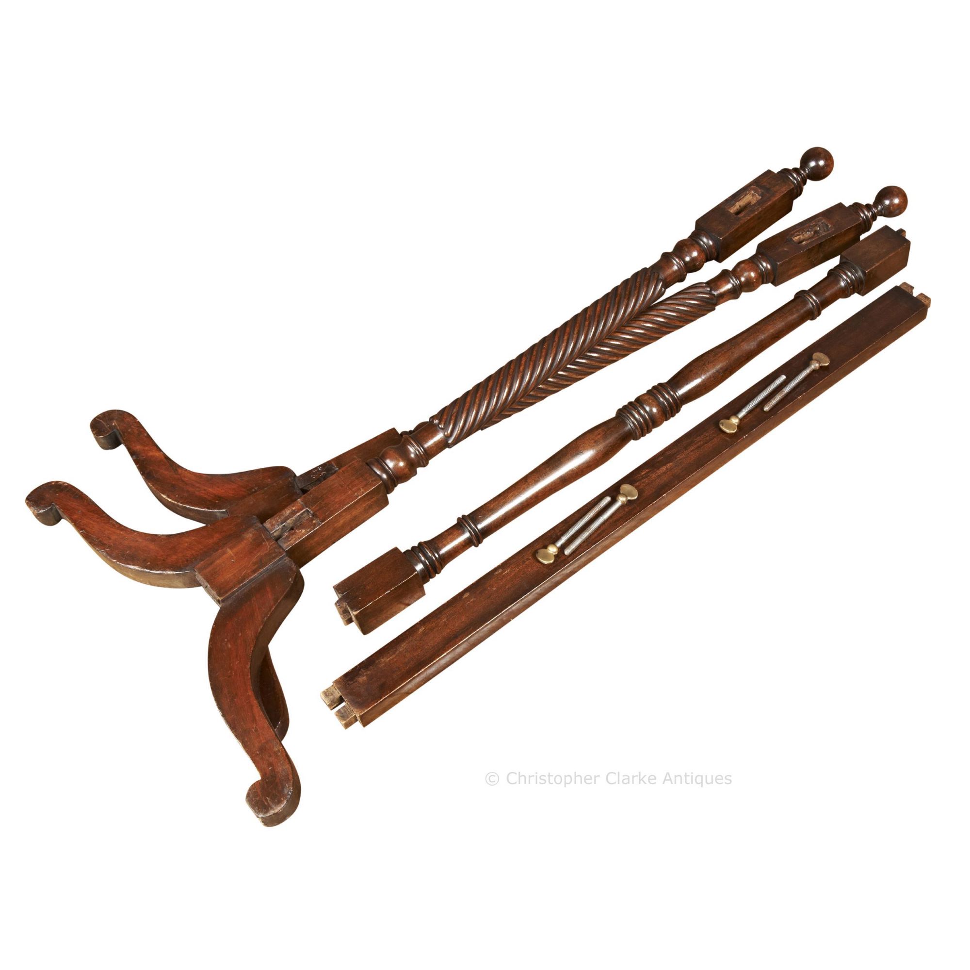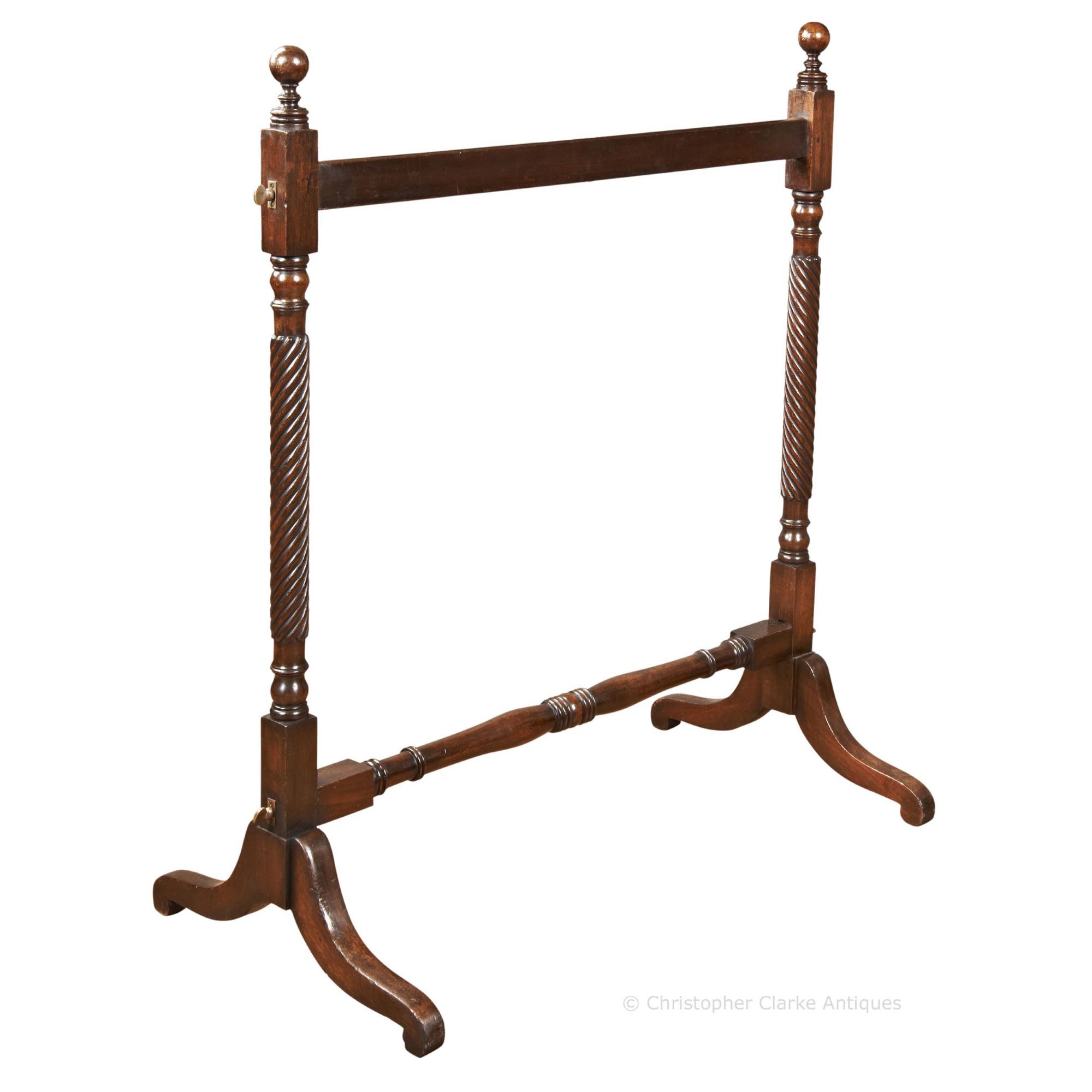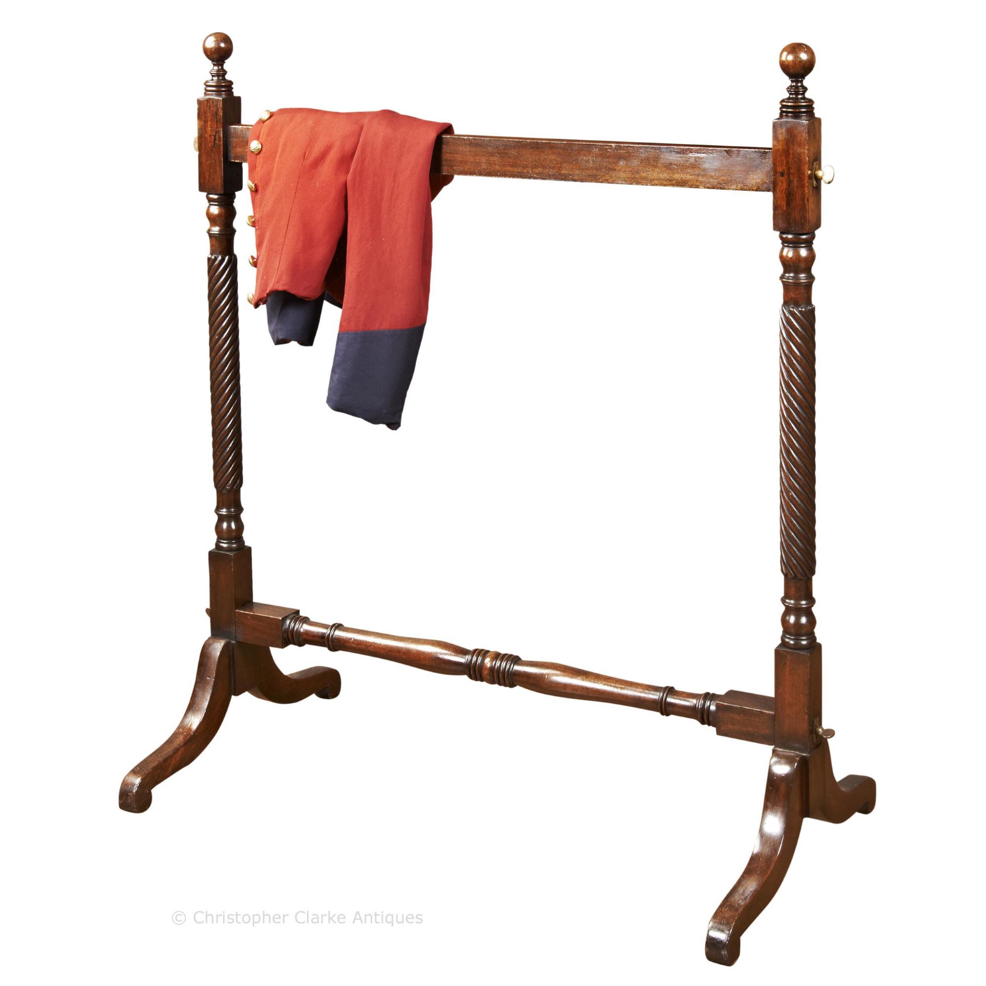 The Rail has shaped, down swept feet and a spiral twist to the columns to give an elegance that offsets the solid feel given by the thickness of timber used. The Rail is a good-sized piece of furniture and would have been useful for an officer to hang their uniforms. Early 19th Century.