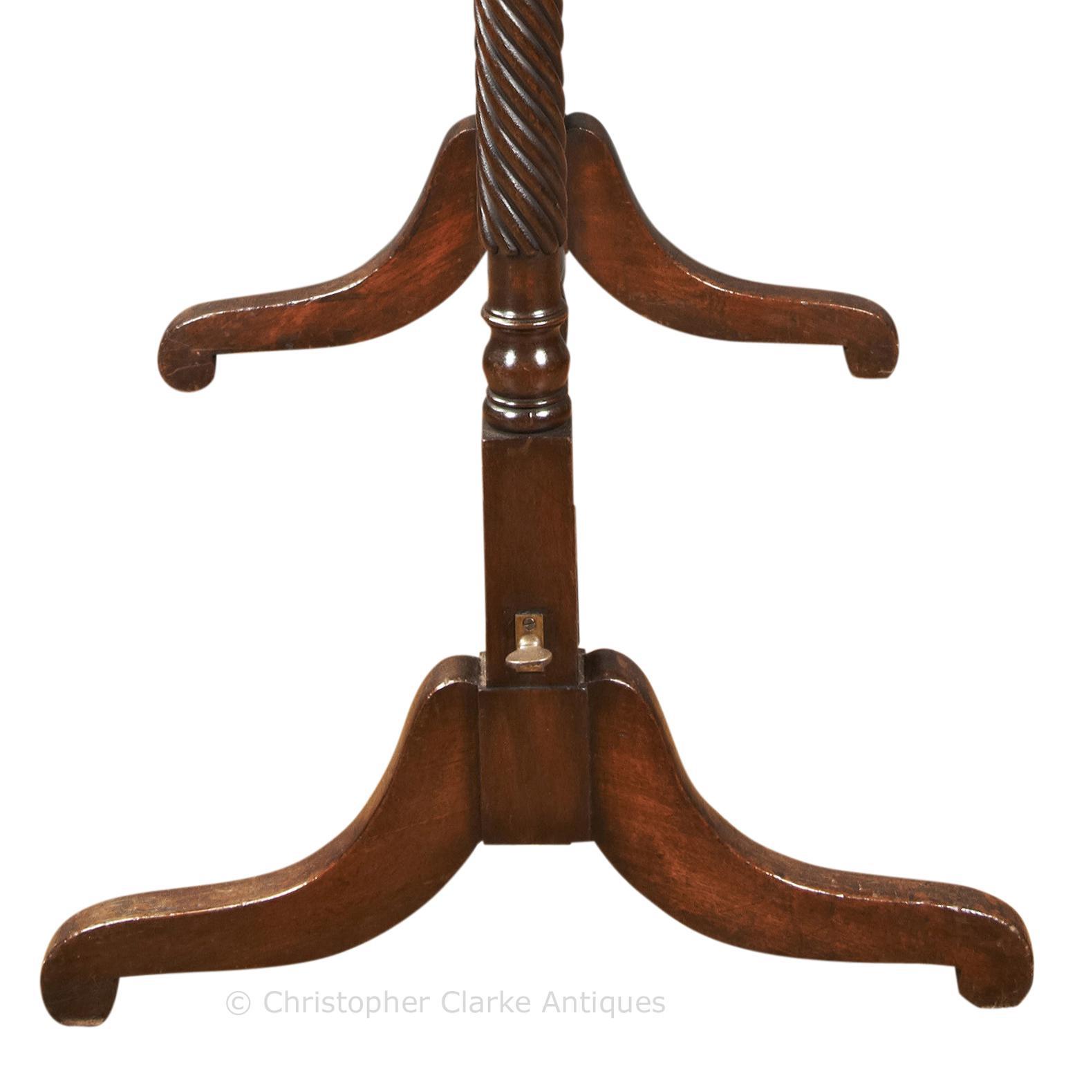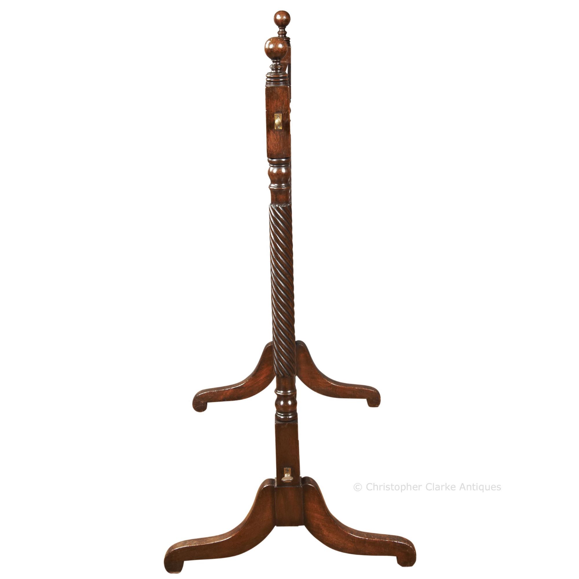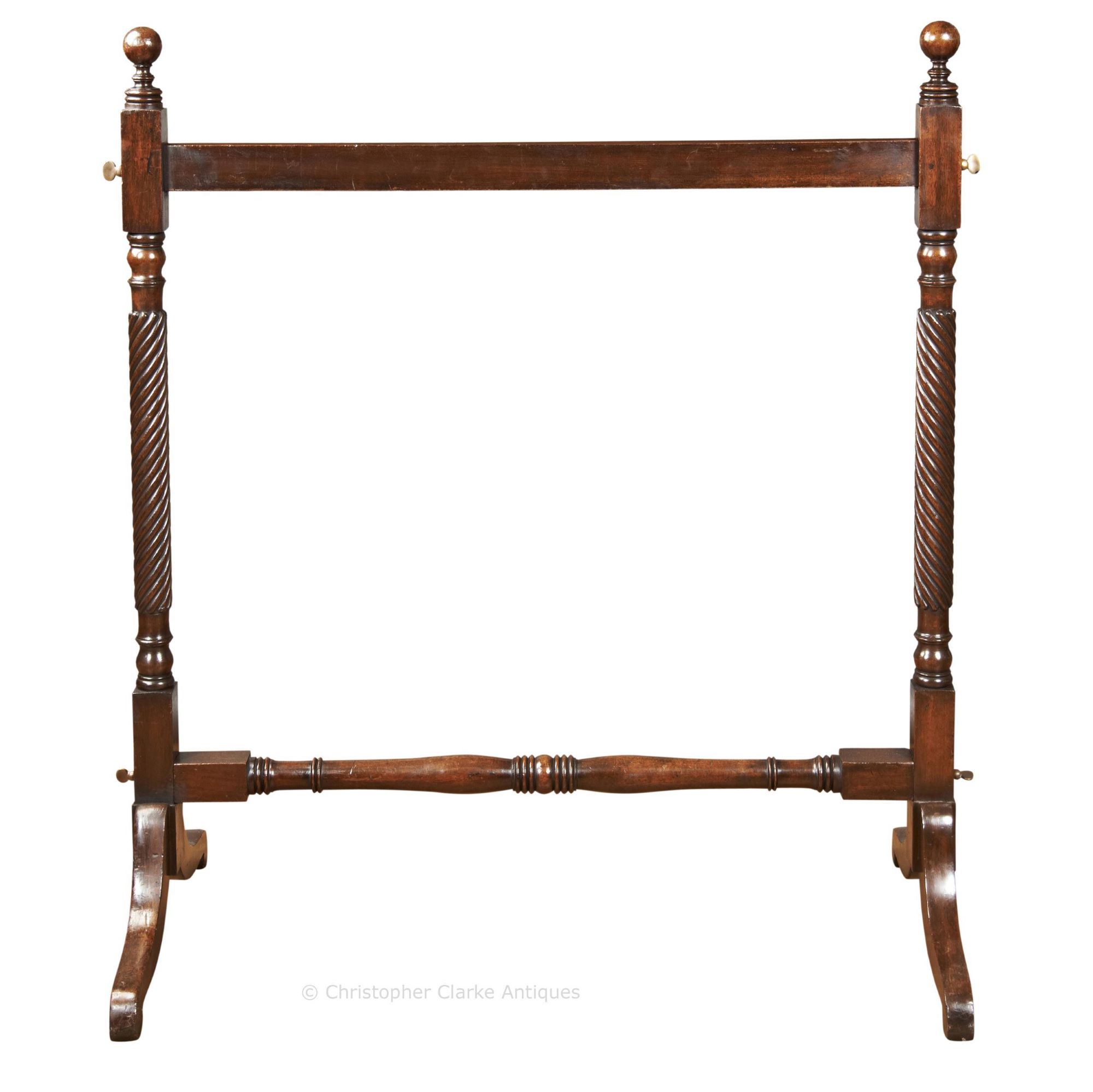 The Rail has shaped, down swept feet and a spiral twist to the columns to give an elegance that offsets the solid feel given by the thickness of timber used. The Rail is a good-sized piece of furniture and would have been useful for an officer to hang their uniforms. Early 19th Century.