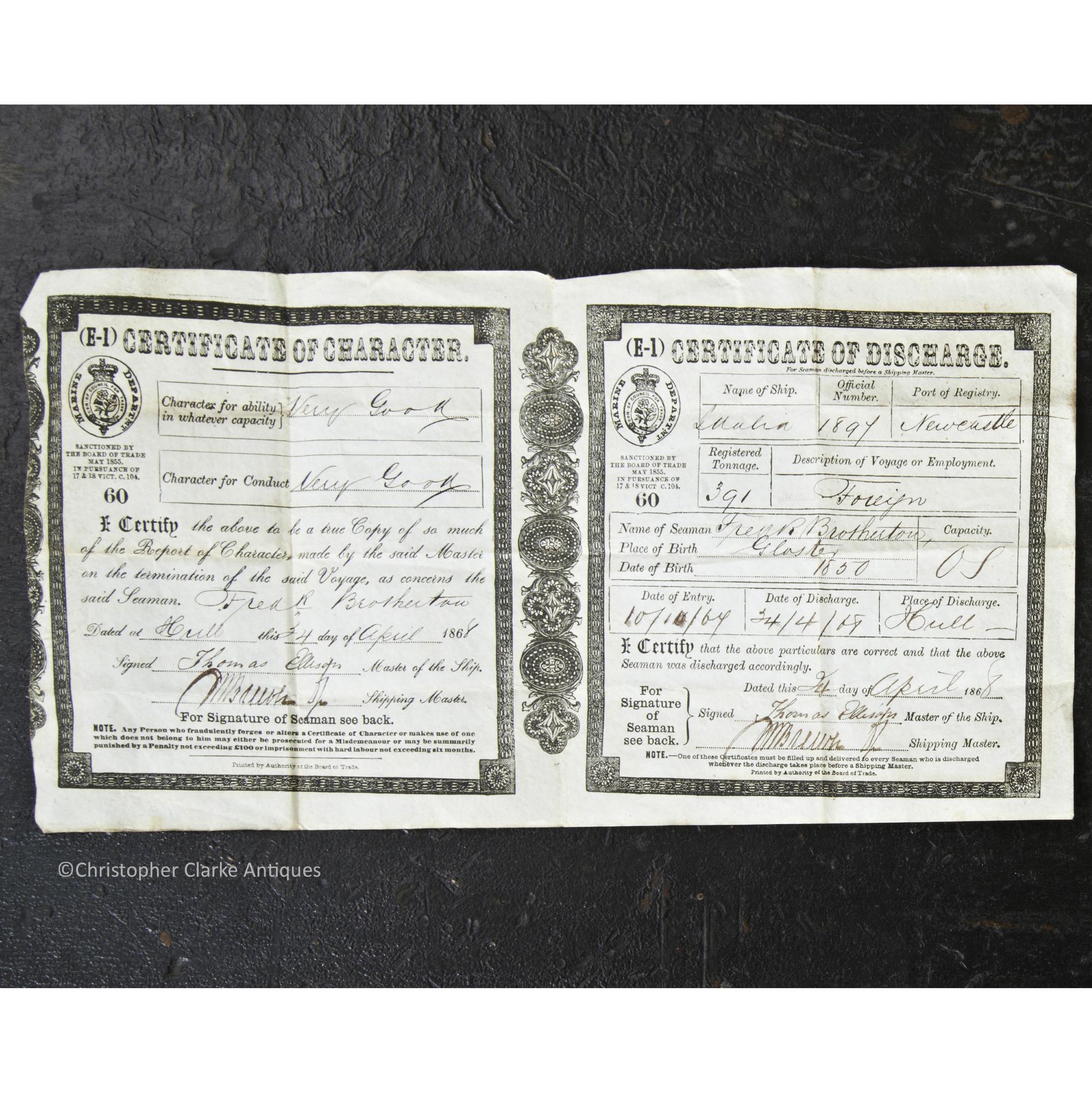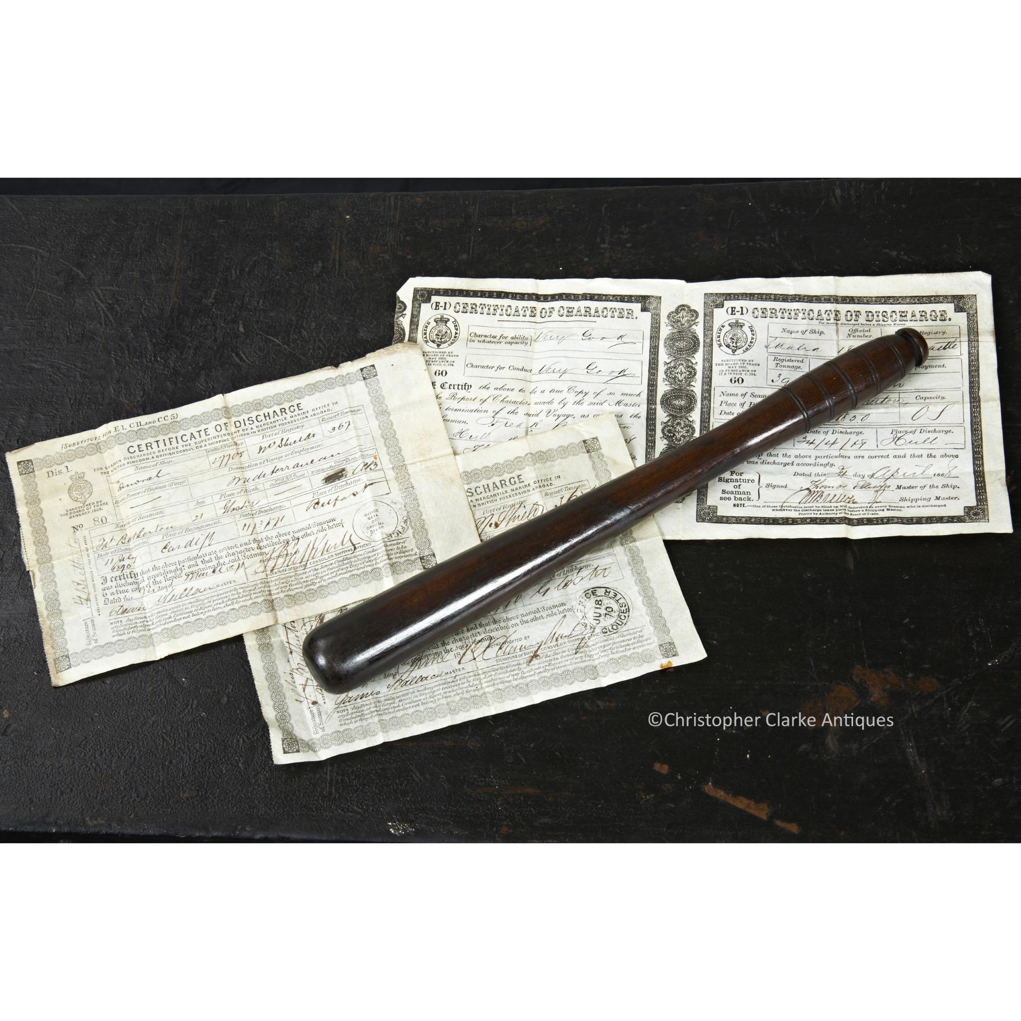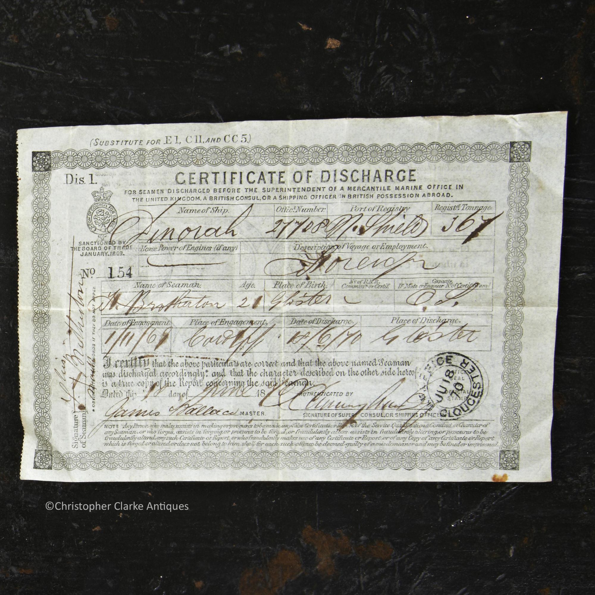 Brotherton was born in the port of Gloucester in 1850 and went to sea at the age of 17 as an Ordinary Seaman, becoming an Able Seaman a year later. His seven discharge papers from ships accompany the chest along with a mahogany truncheon. In 1867 he sailed on the Idalia for seven months overseas before being discharged at Hull. He re-joined the ship in June of 1868 for another seven months going to the Black Sea and for a third time in March of 1869, disembarking in September of the same year at London. In November 1869 he went to Cardiff to join the Dinorah for another seven month voyage, returning to his home port. He stayed with the ship and a month later, on the 11th of July 1870 sailed with her for seven months to the Mediterranean returning to Belfast. He then joined the Caroline at Gloucester at the end of March 1871 bound for Quebec returning to Gloucester in August of the same year. A month later he was on the Foam from Cardiff to the Mediterranean and back to London on the 31st July 1872. This was the final discharge paper in the trunk and its probable that, after six years at the age of 23, he had enough of the sea. All of his papers confirm his character as very good and perhaps it is because of this that he was always in work, with a maximum of three months in between ships. What he did afterwards is not known although a Frederick Brotherton is recorded as living in Kingsholm, Gloucester in 1918. Whether this is the same man or perhaps a relative, is not known.