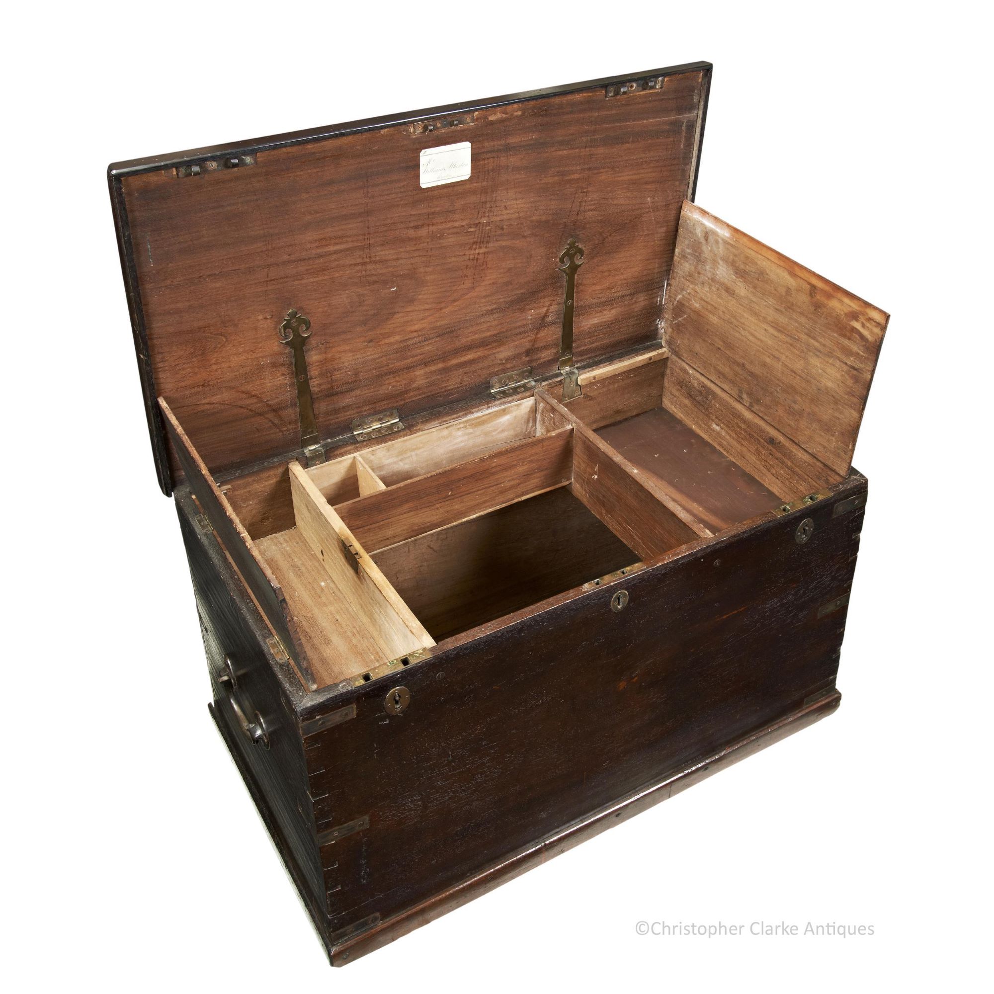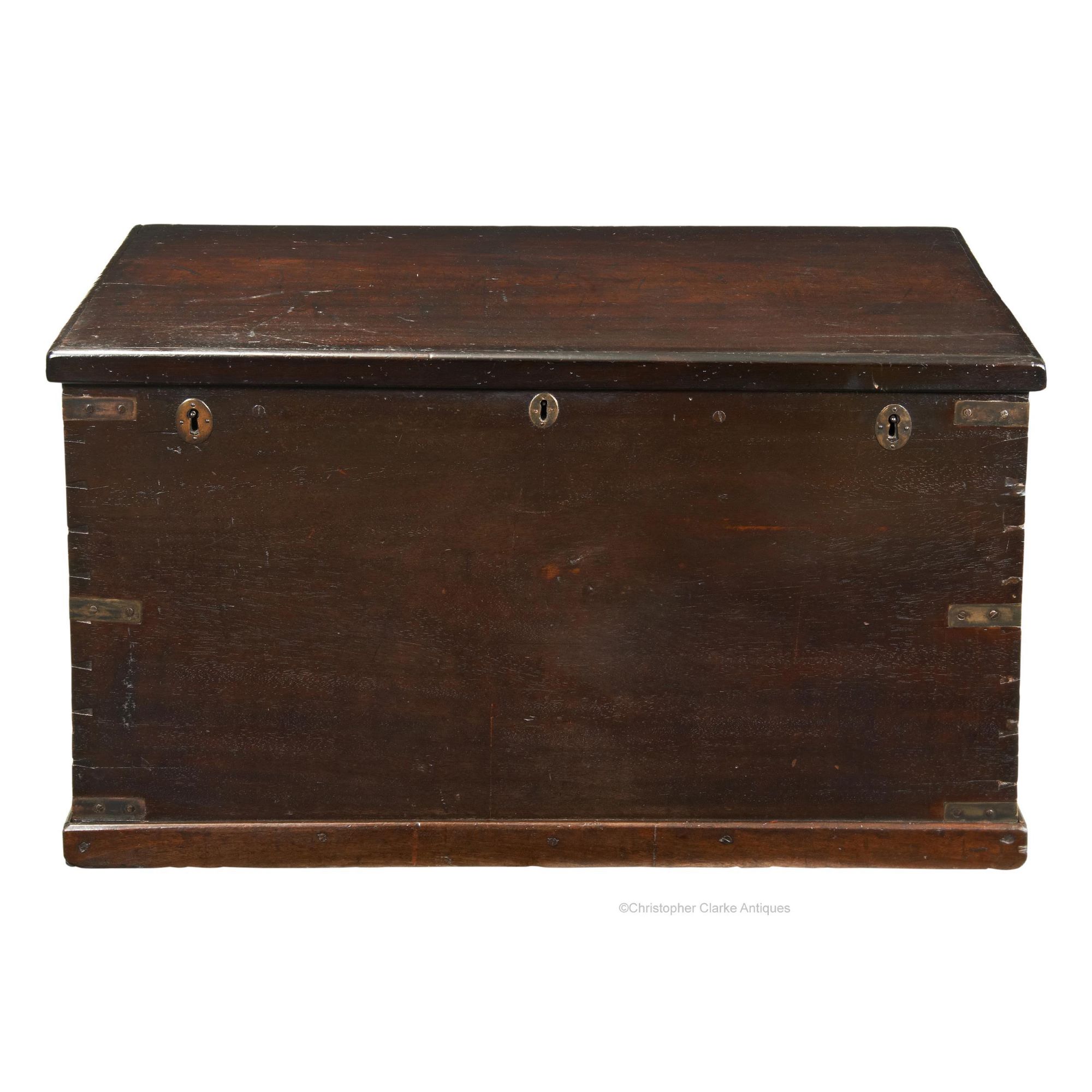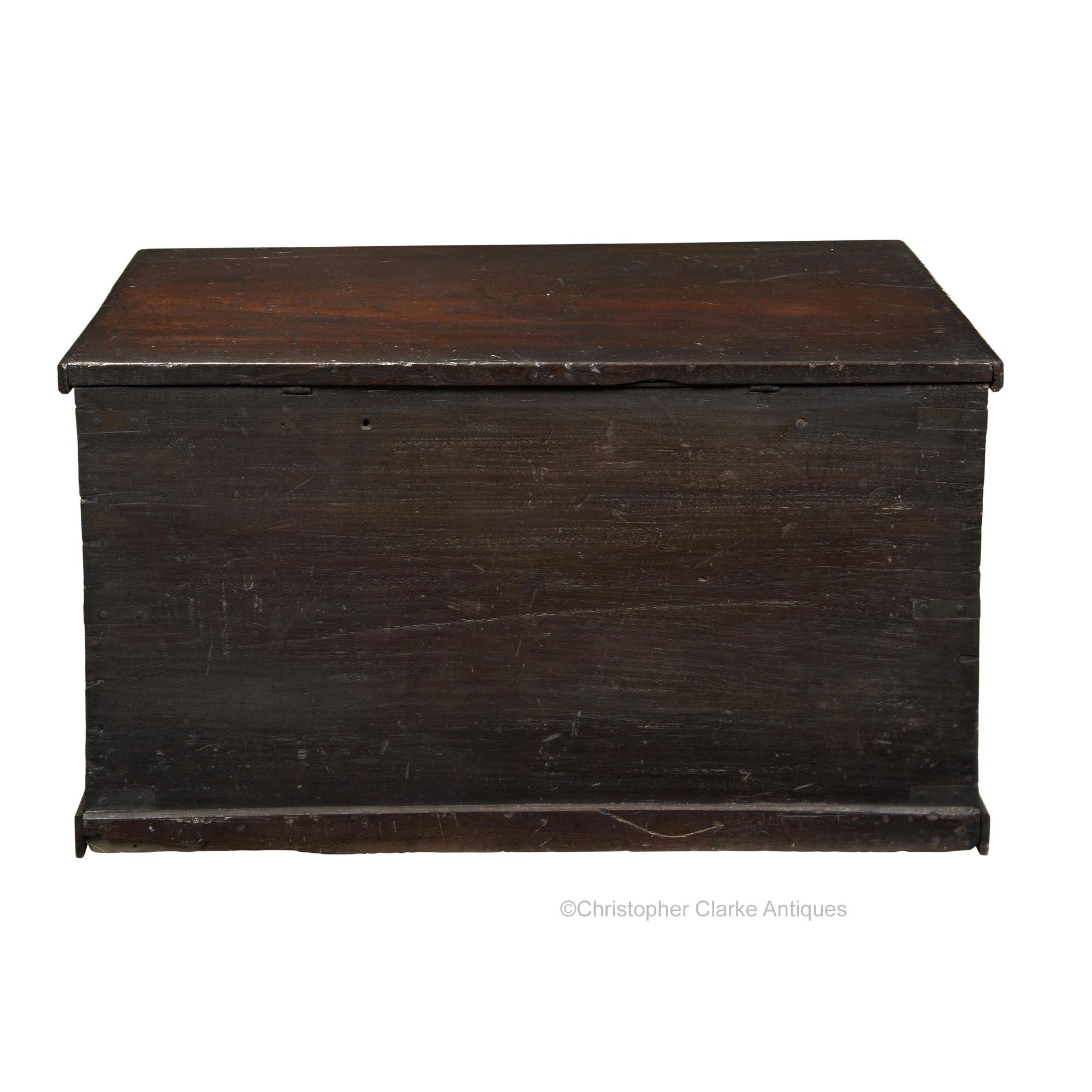 It has good, heavy brass or gun metal handles that are wider to the bale than most and have developed a lovely dark patina that makes it difficult to ascertain the alloy. The trunk is made with open dovetails with three brass straps to strengthen the joints to each upright corner. The lid has an applied thumbnail moulding to give it a comfortable fit to the base. It is supported by two wide brass hinges and two long hinges terminating with a fleur de lys. These long hinges hold the top open and also point to the trunk's earlier age.