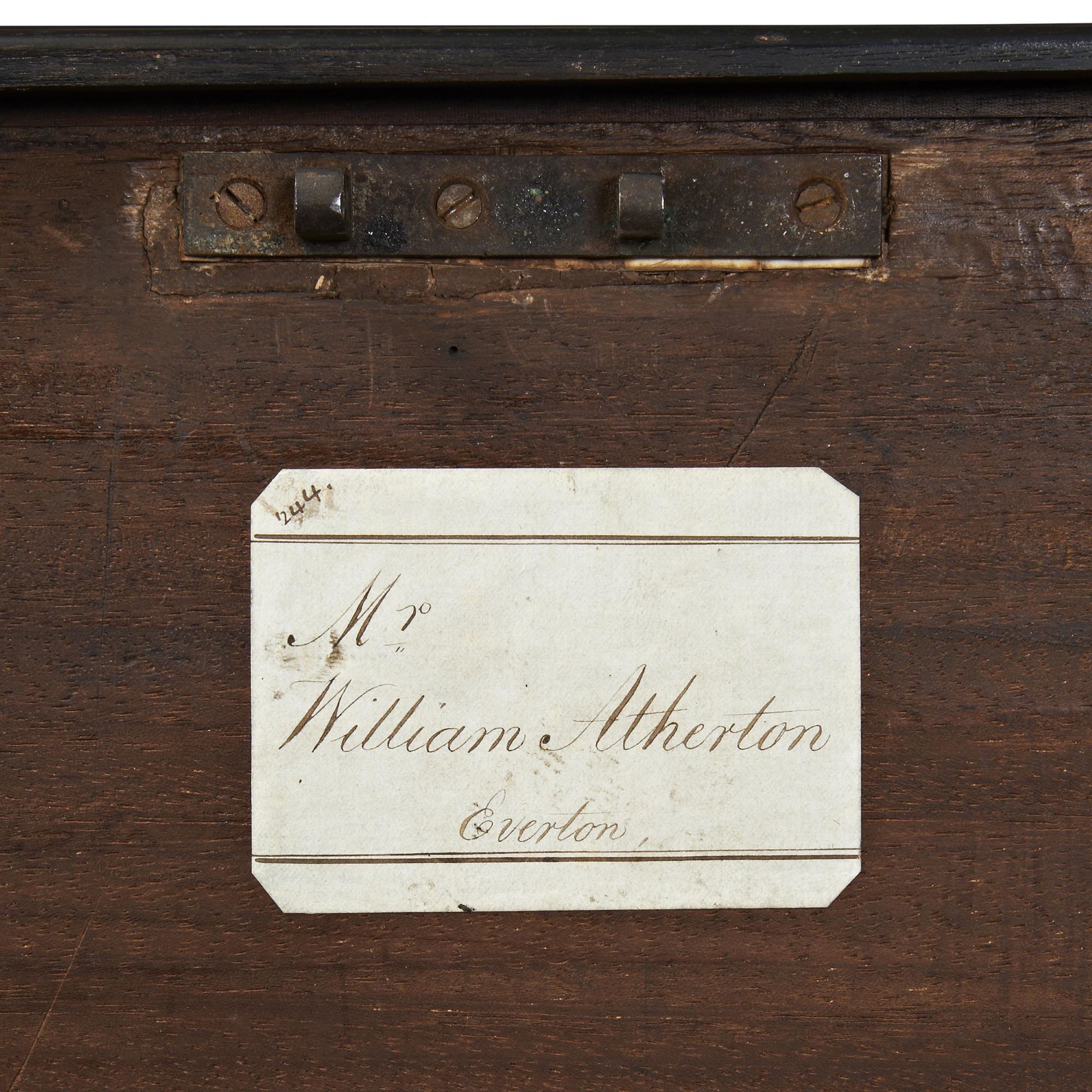 The lid has three locks, a smaller one to the centre and a larger one to either side. There is a handwritten paper label to the lid interior noting the owner 'Mr. William Atherton, Everton' and the number '1244'. We have found three generations of William Athertons from the same family and a fourth with the same name, all from Everton. It is probable that this trunk belonged to William Atherton, born in 1803 to James Atherton, the founder of New Brighton. He was a Liverpool merchant dealing as a middleman between manufacturers in England and the newly opening market of Peru that had declared independence from Spain in 1821. He formed a partnership with John Begg in Peru called Begg, Atherton and Company. Begg operated out of Lima whilst Atherton was based in Tacna. Their partner in Liverpool was James Brotherston. It maybe that the trunk's three large locks was a reflection of the partnership. Textiles were shipped from Liverpool to Peru with bullion, coin, bills of exchange and local produce returning to England. Begg had very good contacts in Peru and Chile and the merchants worked on a commission basis as well as owning ships.