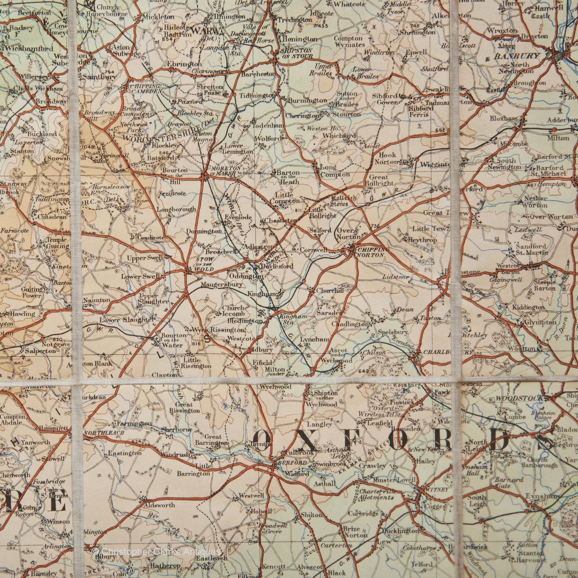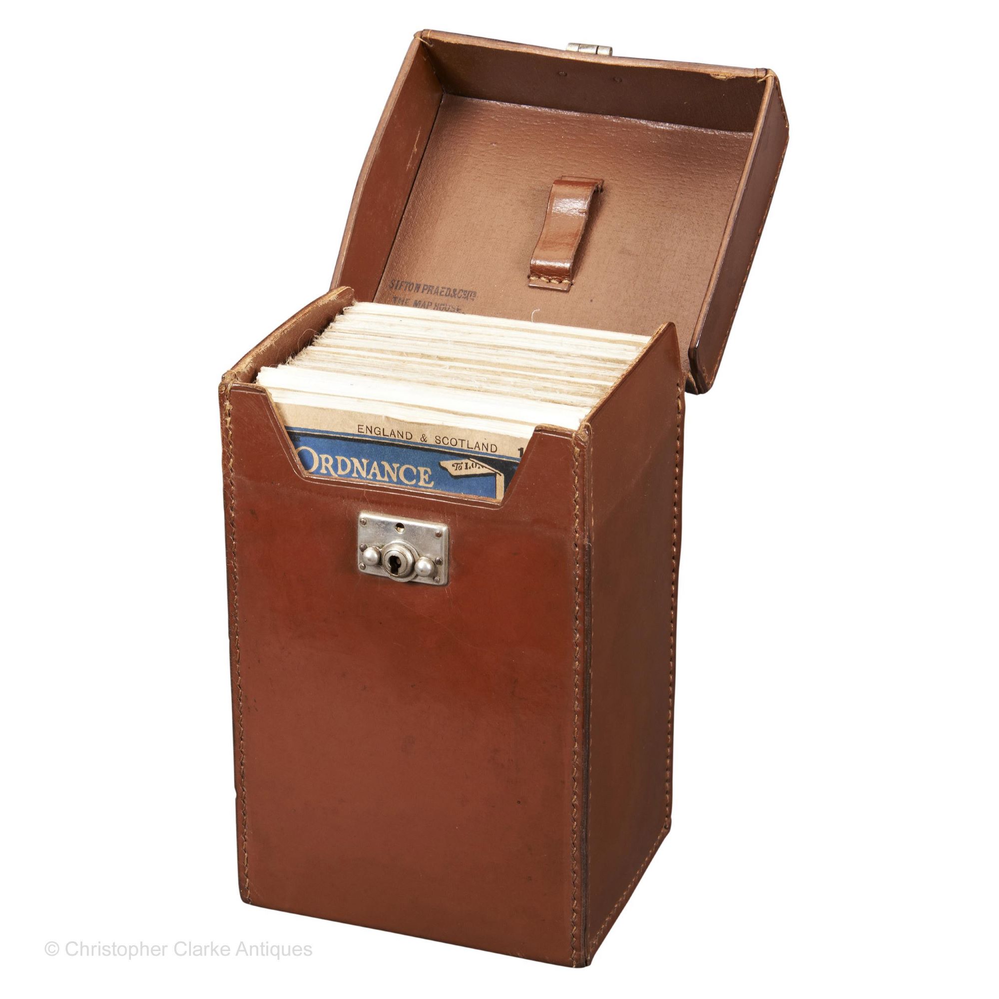 The 12 Ordnance Survey Maps were retailed by Sifton Praed, who stamped their details of 'Sidton Praid The Map House 37 St. James St. SW' to the lid interior. Originally a milometer would have been held in the lid but its not unusual for these to be missing. The scale, as noted to the bottom of each canvas backed map is '1/4 to One Mile' or '1 Centimetre to 2.5344 Kilometres'