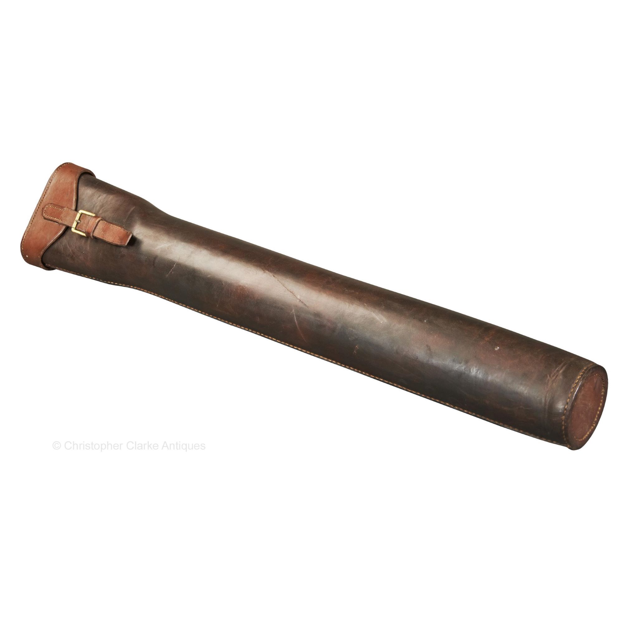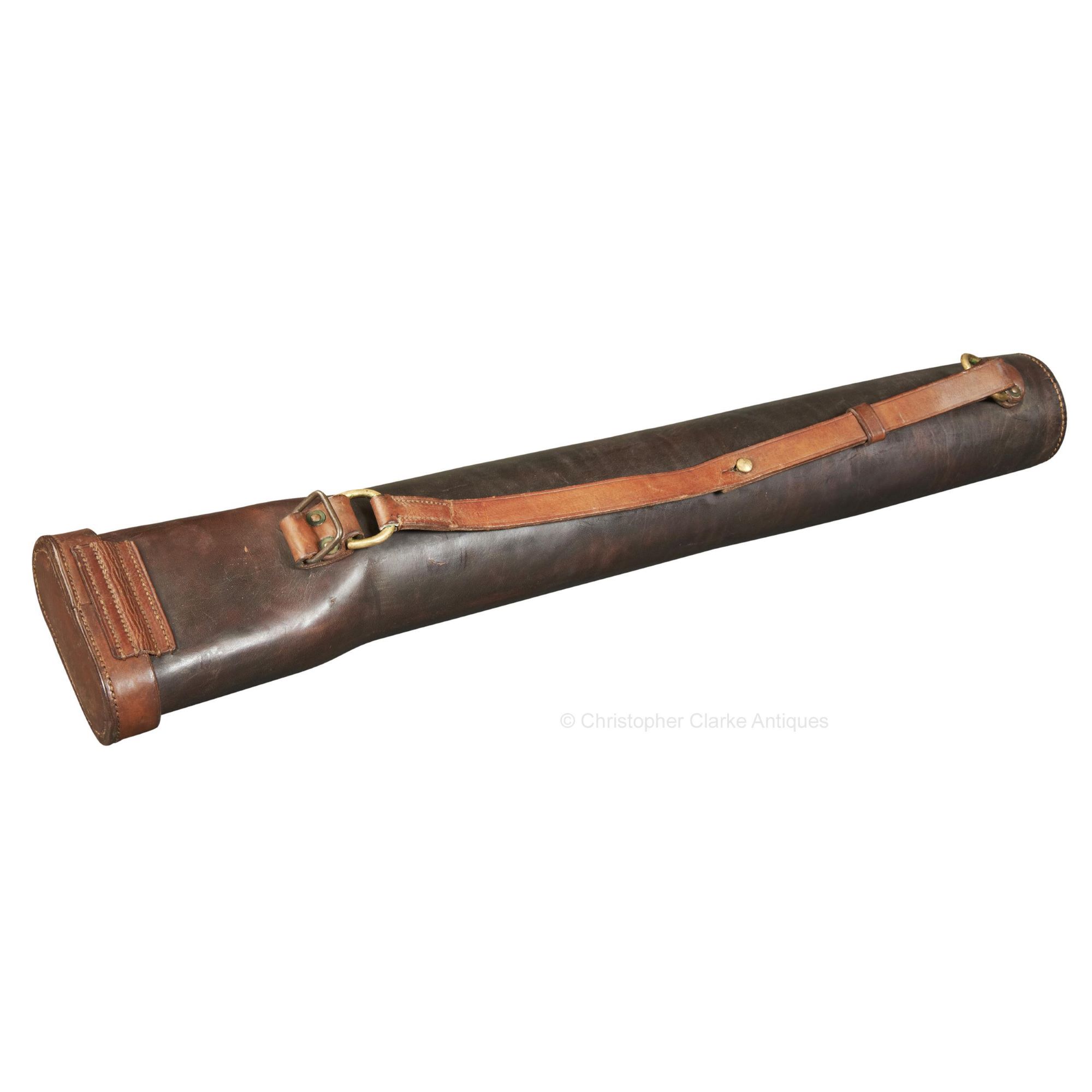 The case has been made to protect a gun barrel and so strength was a factor. Thick, rigid leather has been used and a brass buckle and D rings. The shoulder strap is adjustable and the leather hinged top has a belt strap with buckle to fix it. The case was well made has remained in good condition.