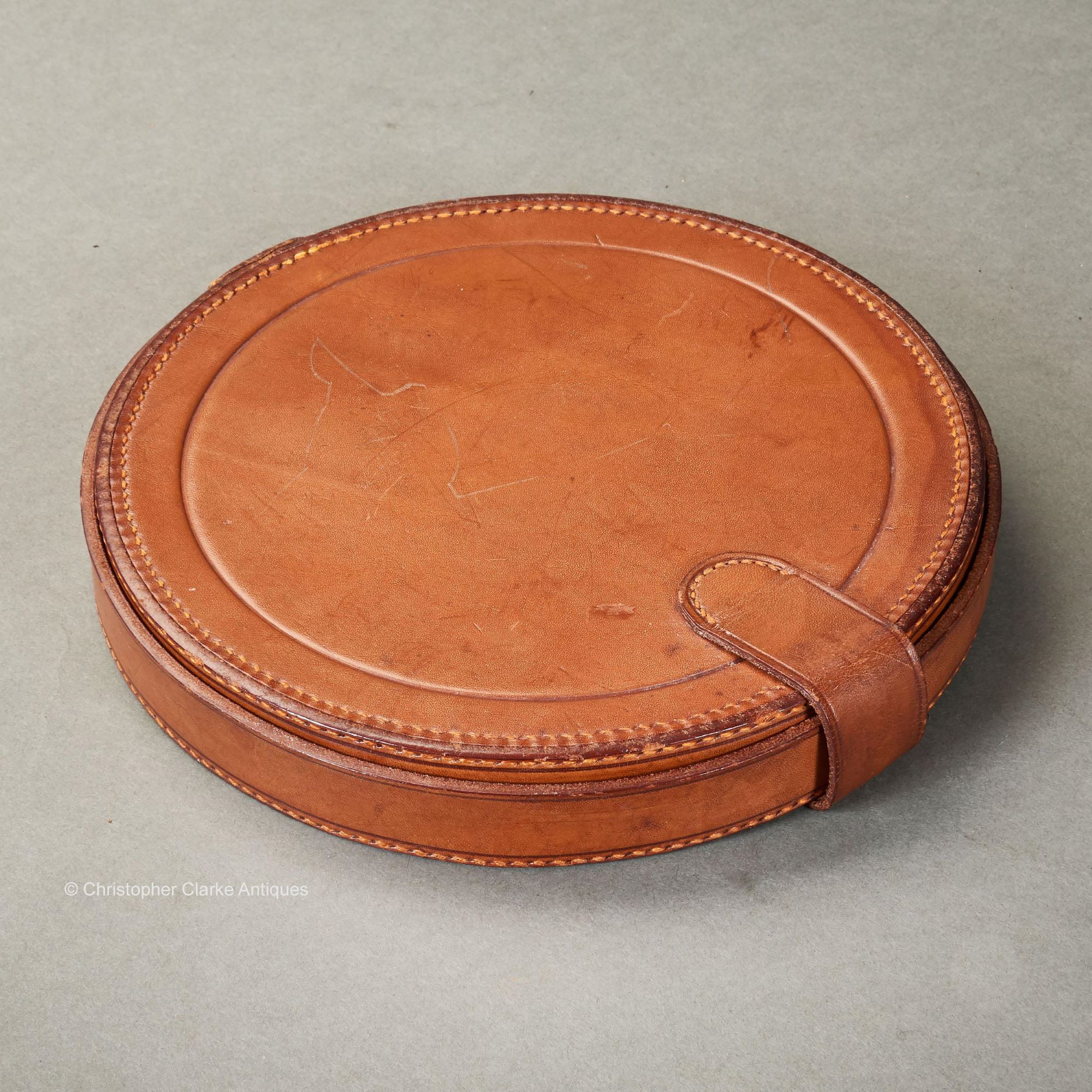 The case is well made, using thick leather hide and lined in a woollen cloth to cushion the contents. It has a leather hinge to the back and a tab to the front with a popper button to secure the two halves. The top and bottom have a tooled circular line set one inch in and following the box's edge. It has the initials 'M.E.J.' stamped in gilt to the centre of the top.