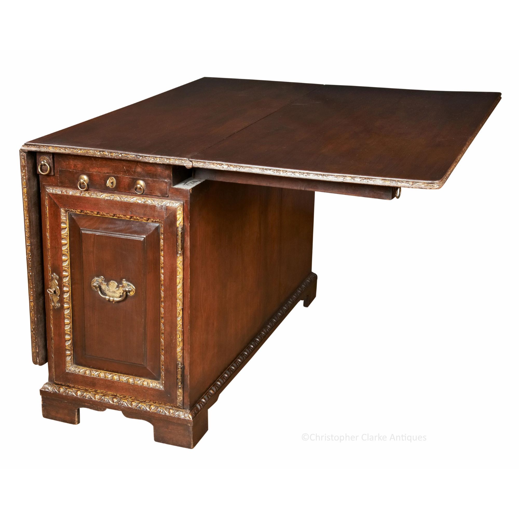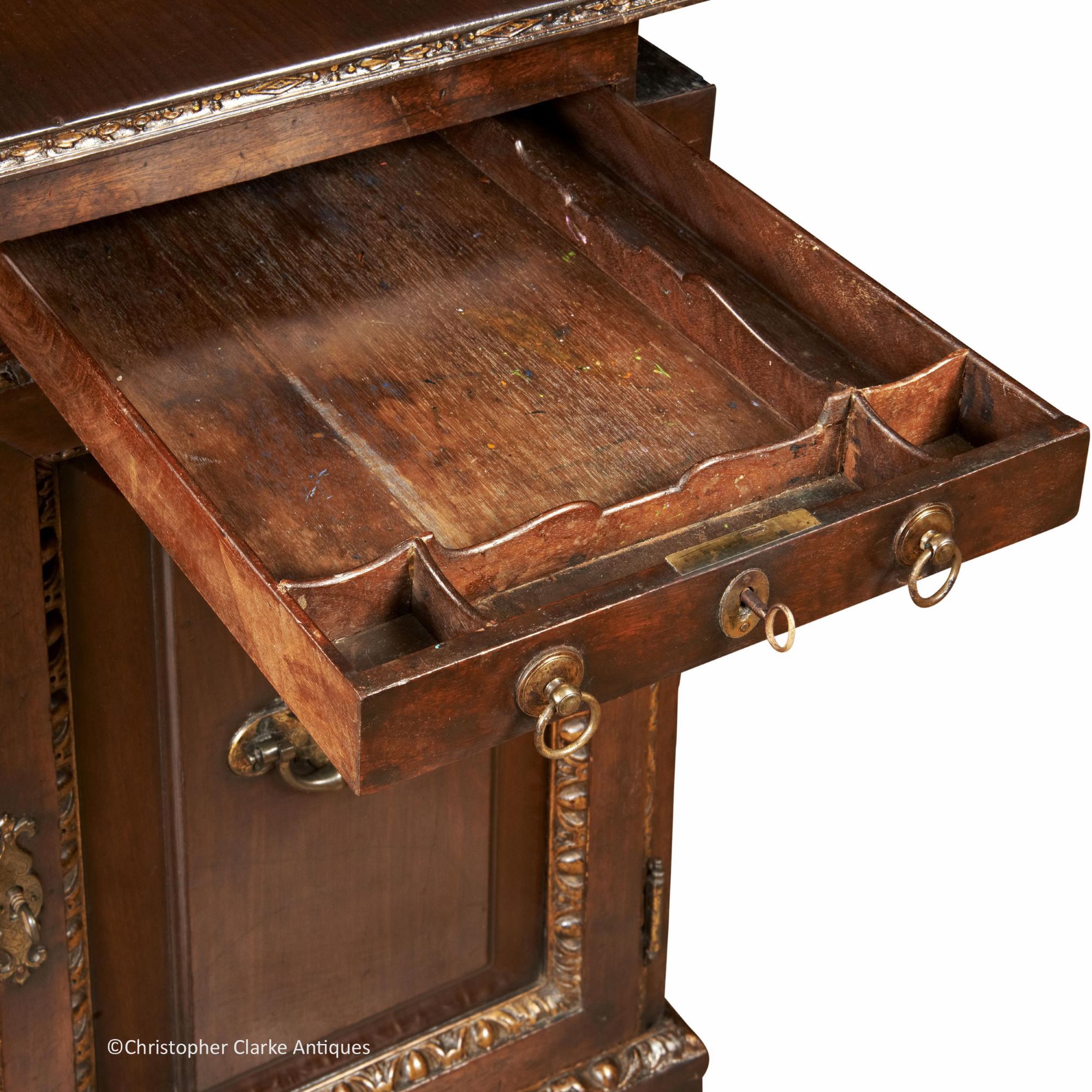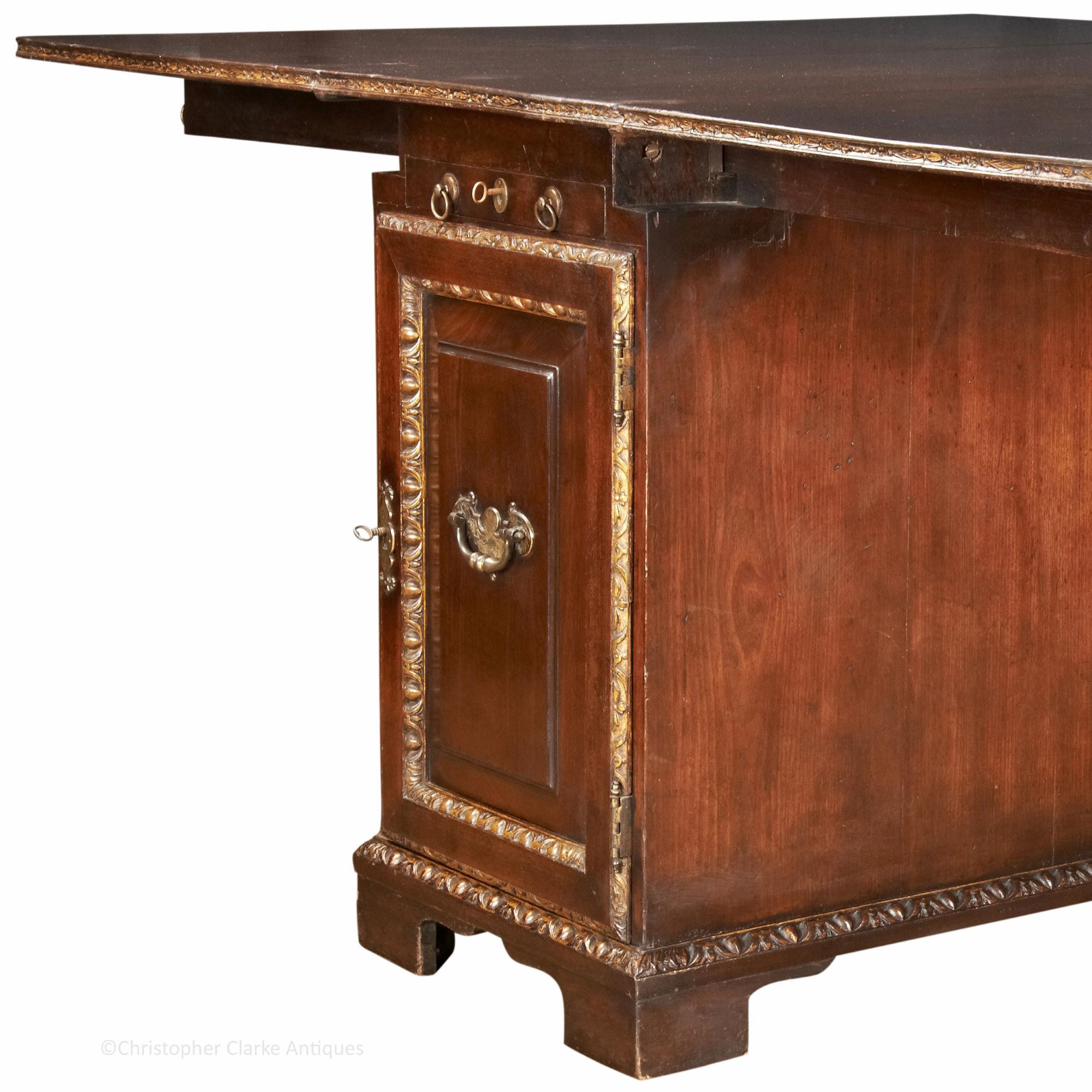 The desk sits on a plinth base with bracket feet that hide the castors. The gilt, carved moulding decoration to the edges of the top, to the cupboard doors and the egg and dart moulding to the top of plinth base are in the manner of William Kent.