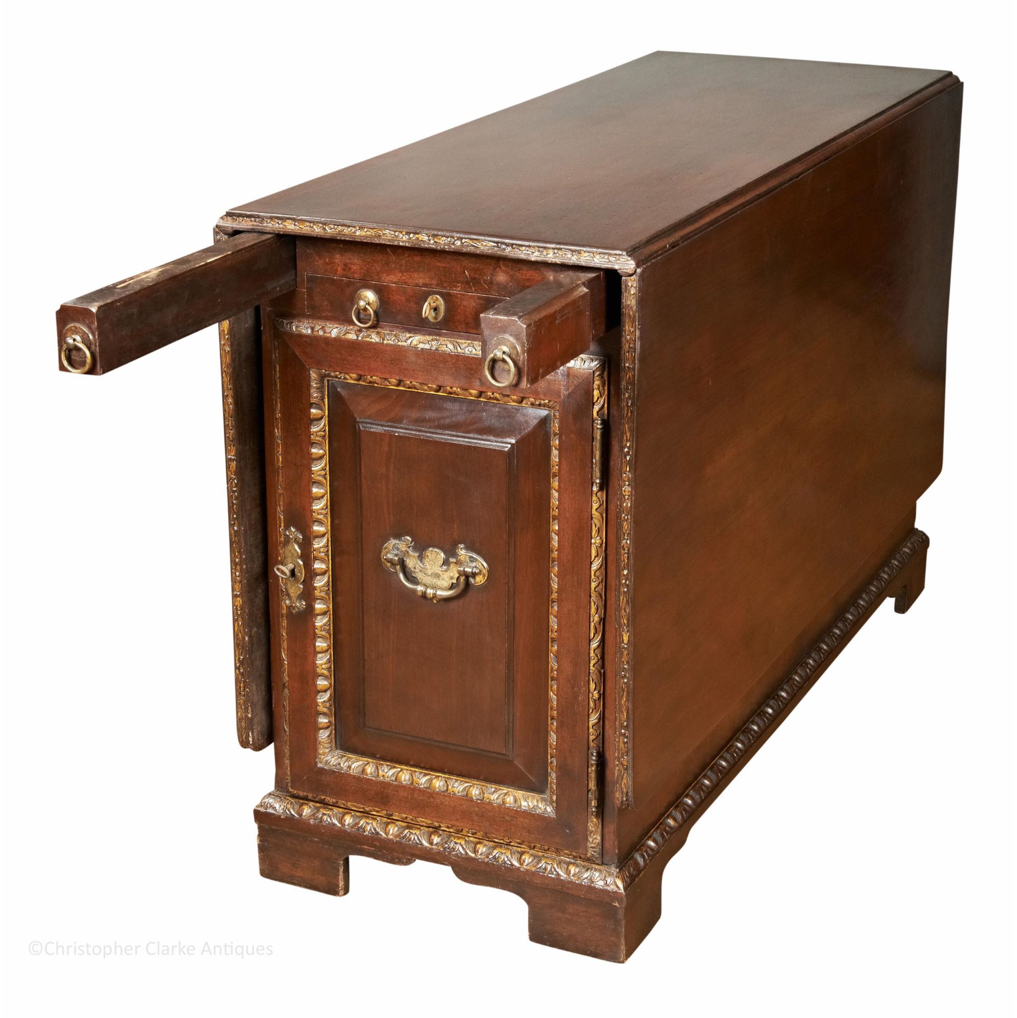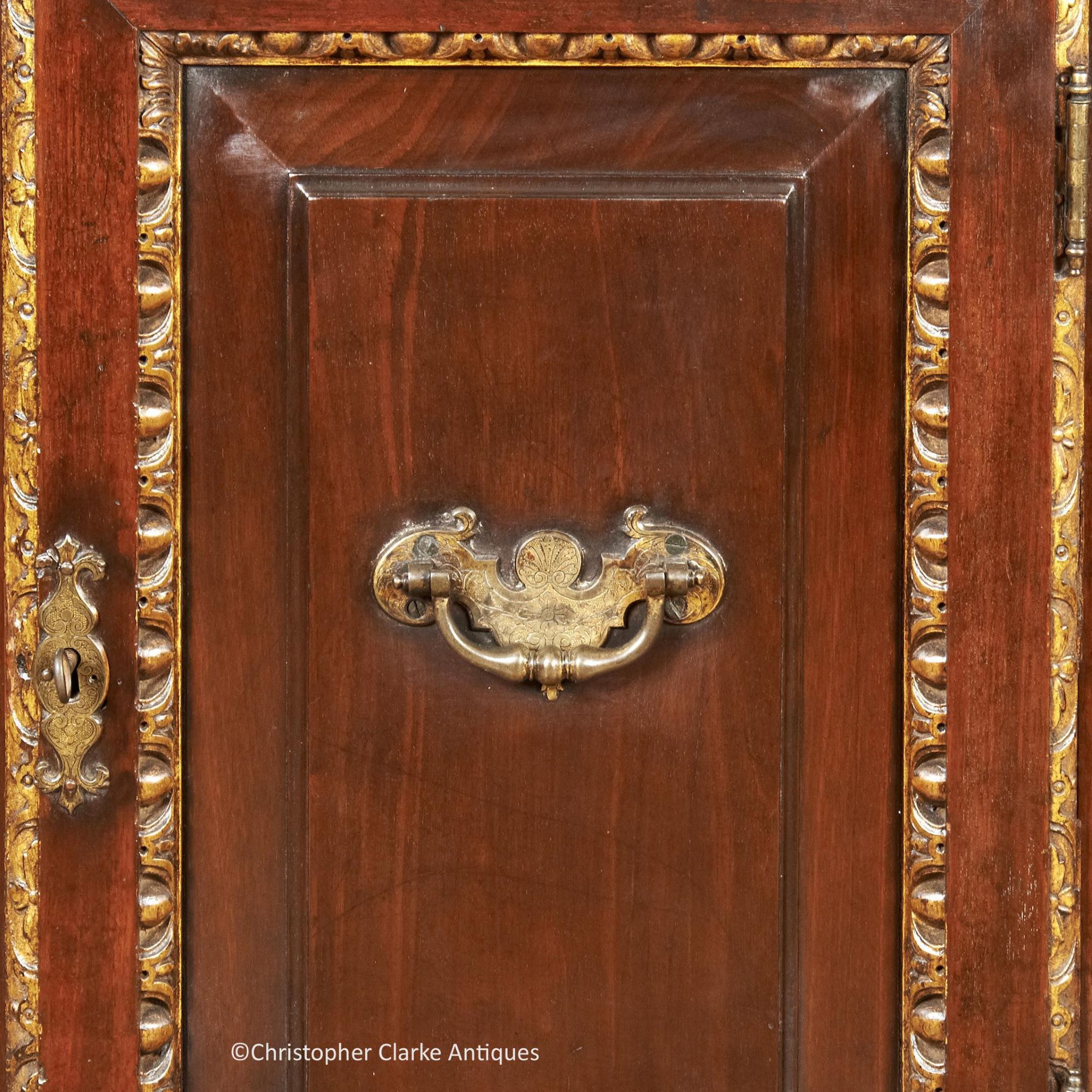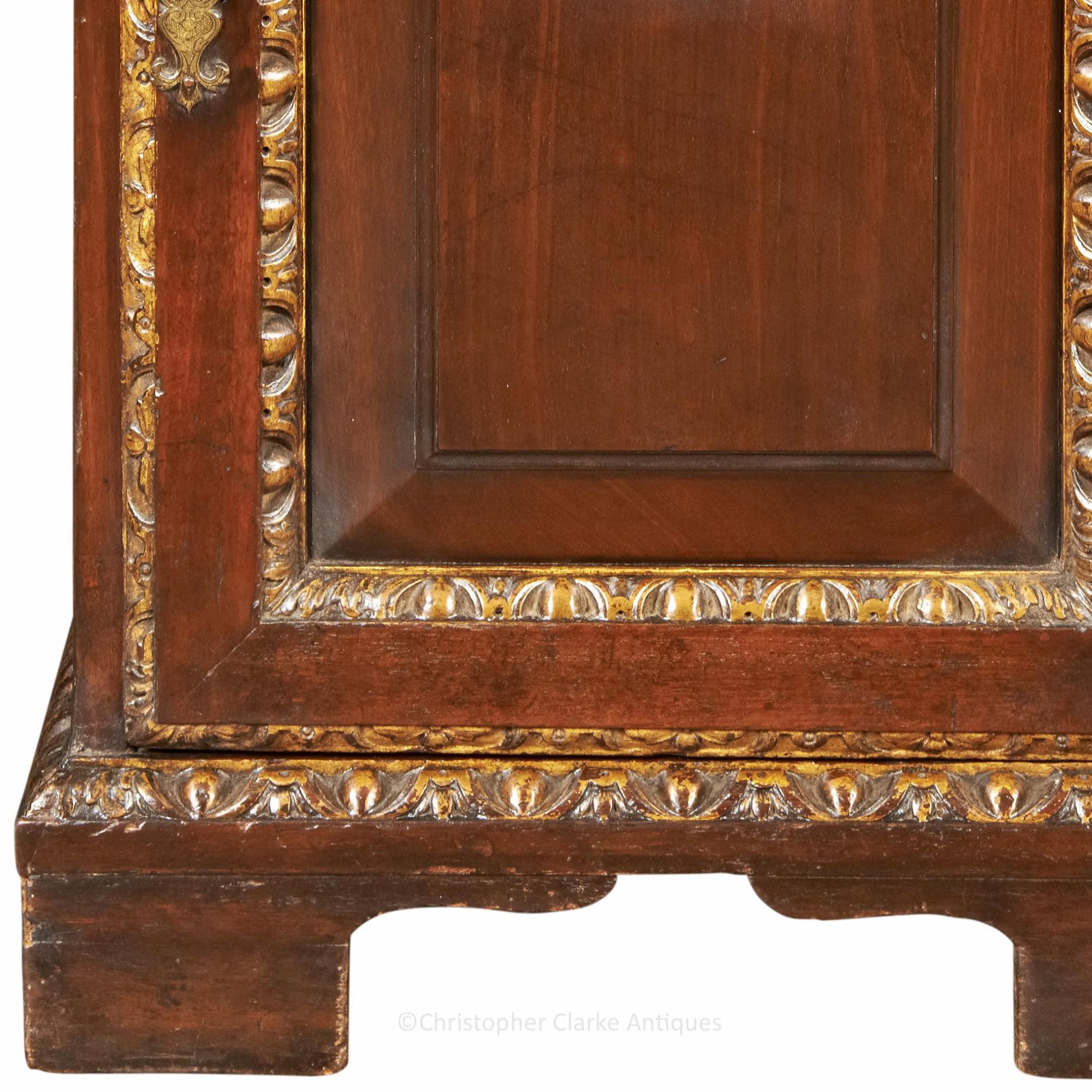The desk sits on a plinth base with bracket feet that hide the castors. The gilt, carved moulding decoration to the edges of the top, to the cupboard doors and the egg and dart moulding to the top of plinth base are in the manner of William Kent.