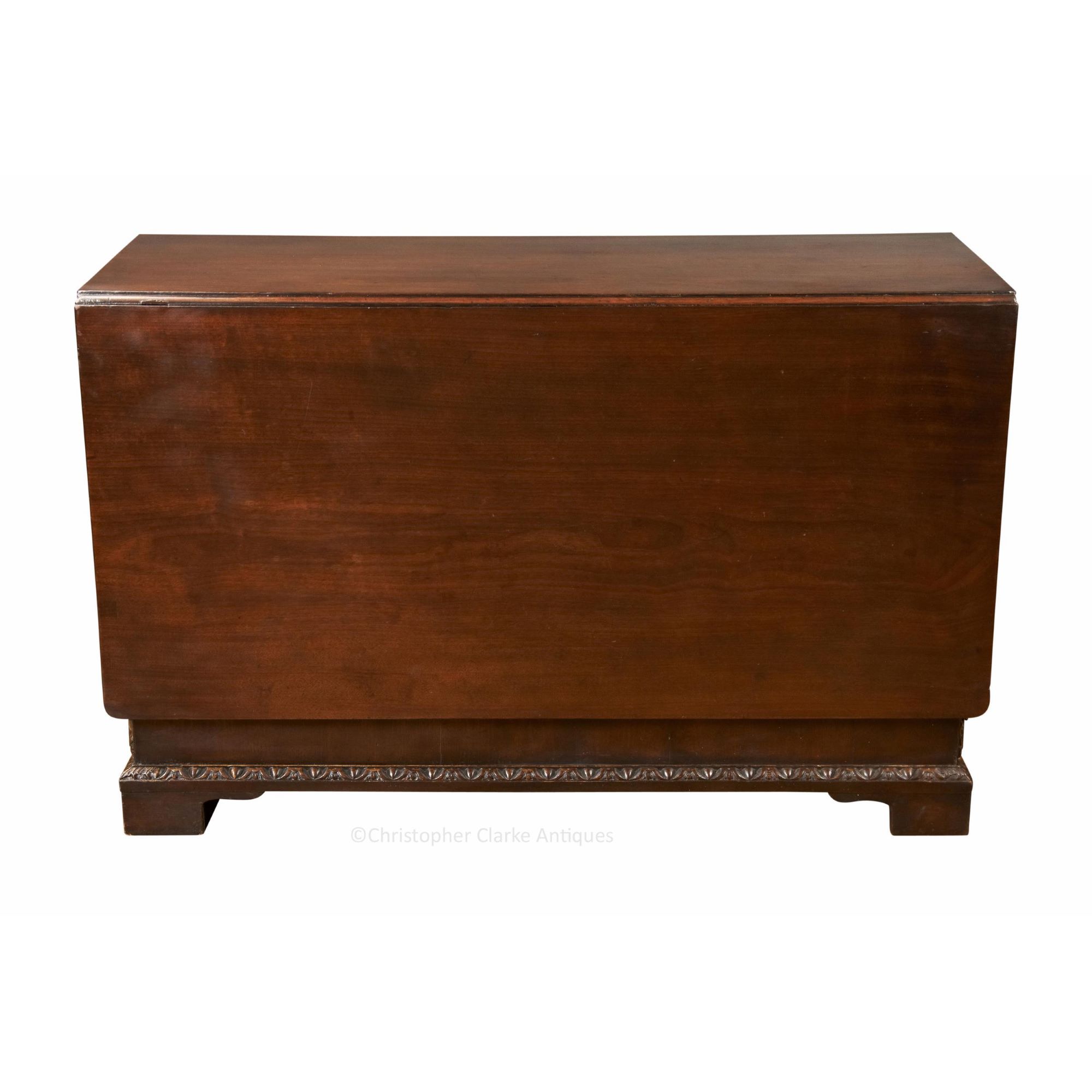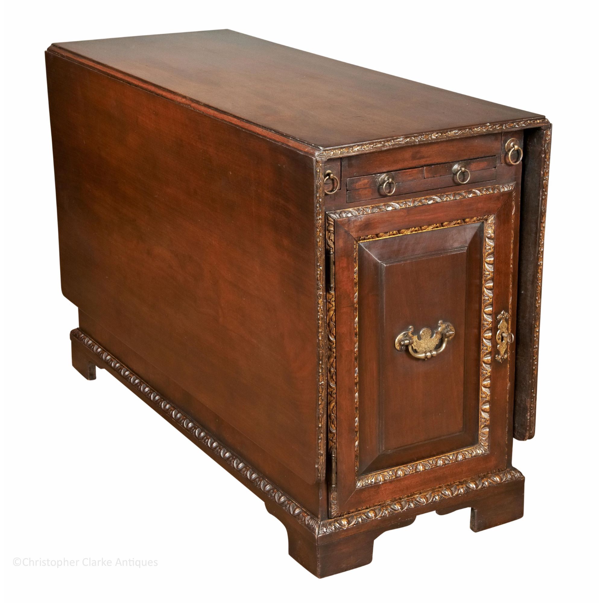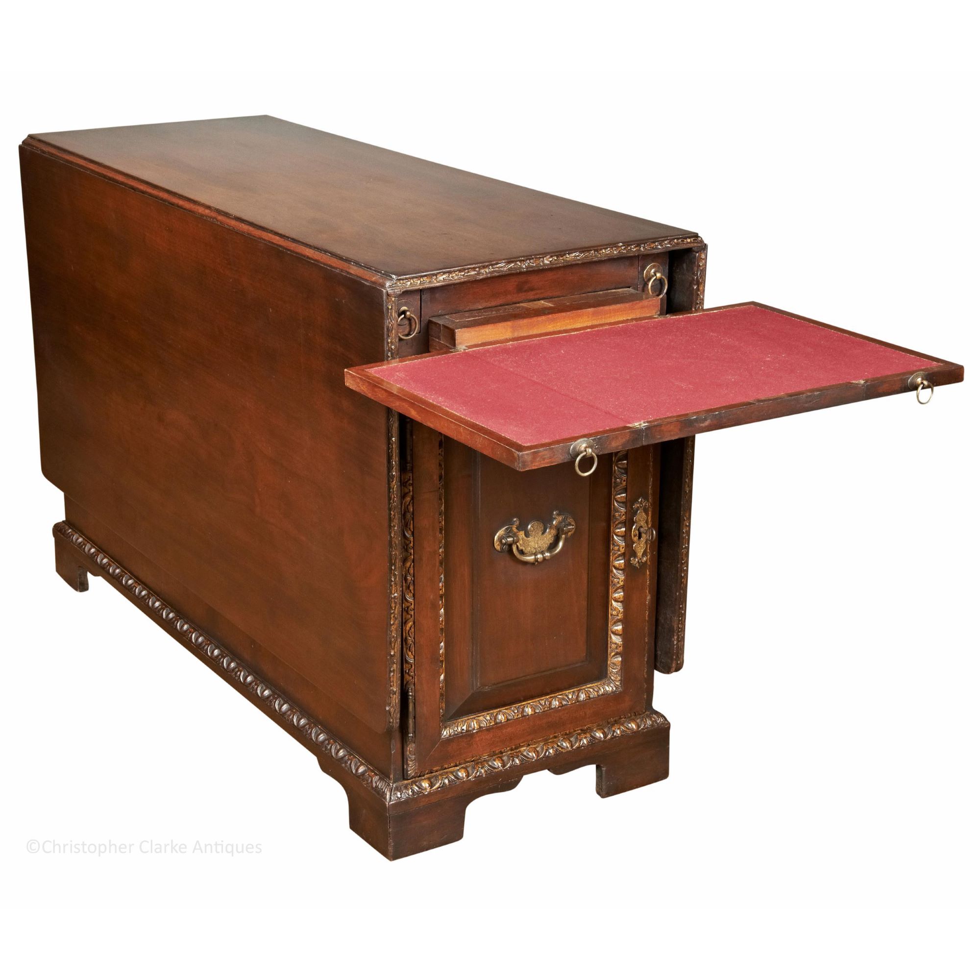 It is likely that this piece of furniture was made for use on board ship, its multi-purpose being ideal for the quarters of a cabin that would also have housed cannon. It is a good-sized dining table that could also be used for laying out charts or maps; it has storage space; there is an area for writing and a drawer for taking writing equipment and papers etc. These attributes would, of course, also be useful in a domestic setting and it is possible that it may have been made for a gentleman's library. However, you might expect a library or office to also have a desk and so not need provision on such a piece of furniture.