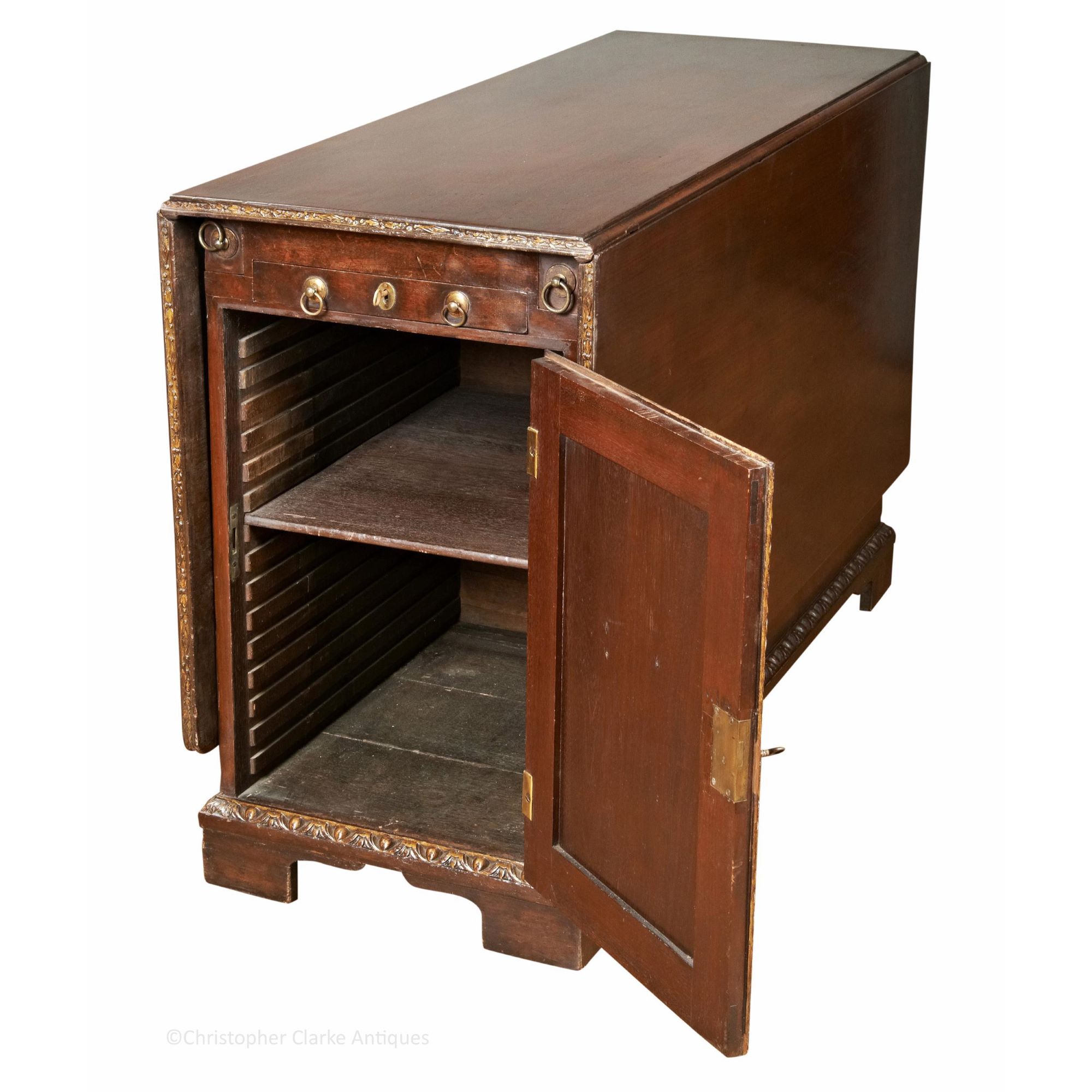The 4 lopers for the table flaps are unusual, mahogany bars with ring pull handles. They pull out from the top sides of the cupboard to a length of 13 inches and are hinged so that they will fold at a right angle once fully extended, to support the leaves. The full size of the table top is 63 inches (160 cm) with both flaps up.