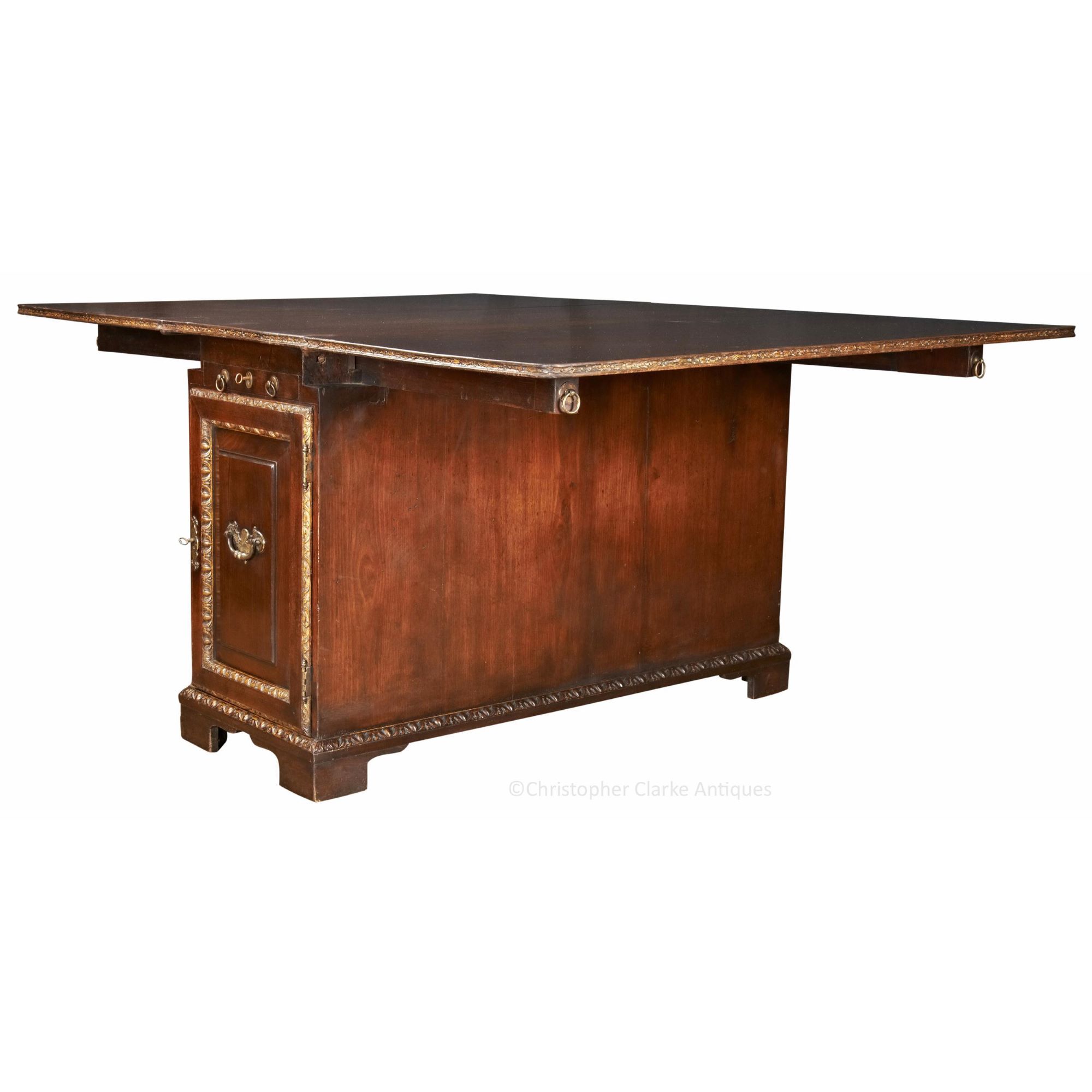 The desk has a central pedestal with a cupboard to each end and a large table leaf to each side. Above each cupboard, to one side there is a drawer with shaped dividers to take inkwells, pens, instruments and papers and to the other a writing or reading board. They both have ring pull handles and the board, once pulled out will unfold to double in size and reveal a red baized surface. The cupboards each have one shelf that can be set to 15 different positions, some ridiculously low others far too high. The panelled doors have good hinges that allow them to open to a 180 degree angle. The central door handles and escutcheons are engraved gilt brass and, with the cupboards locked, can be used for the moving the desk on its castors.