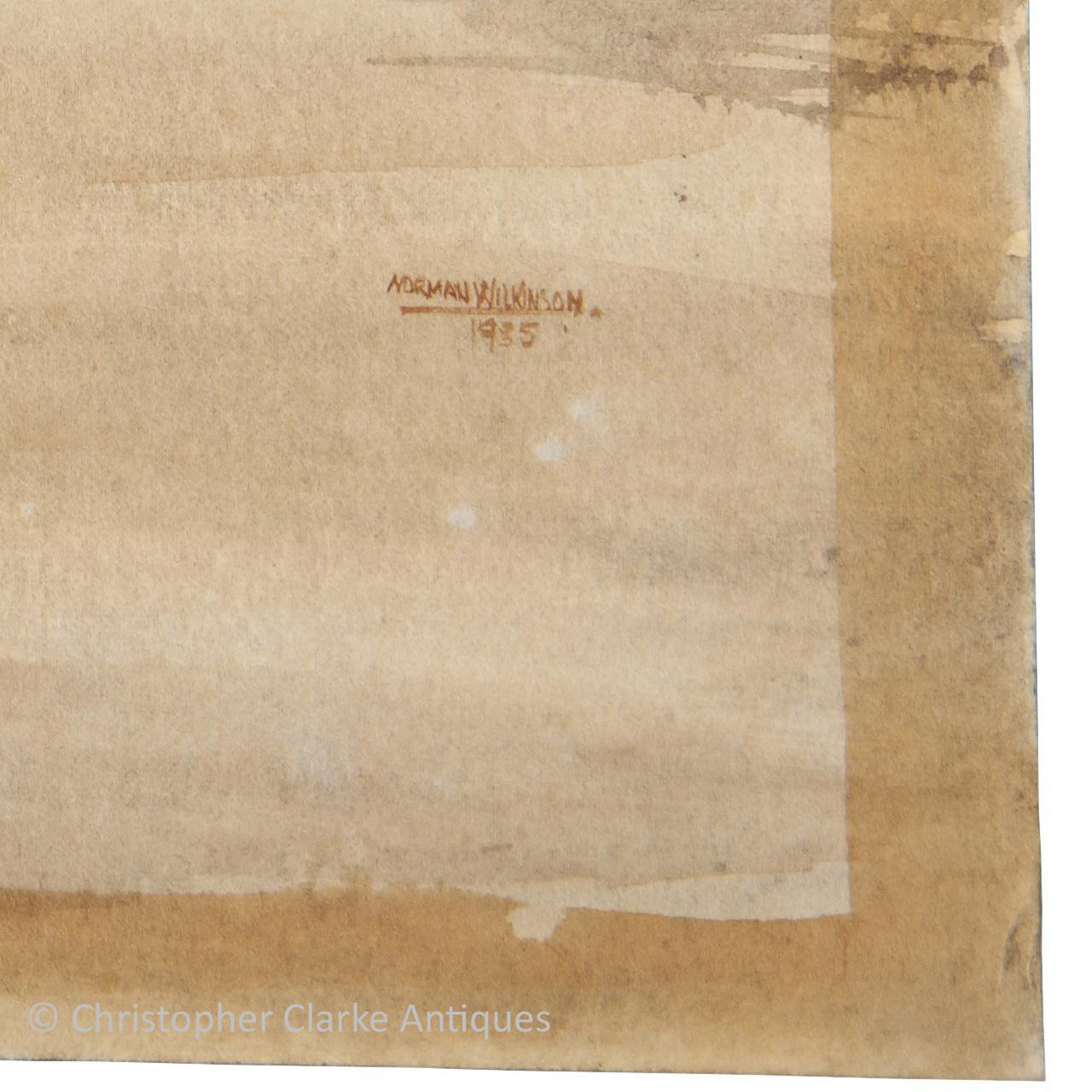 Wilkinson has pictured the Macon in good detail off the coast with another rigid airship in the background. He has painted very little detail to the sky or coastline presumably because the work was done remotely and he had little information on the scenery. A good picture of a historic airship. Dated 1935.