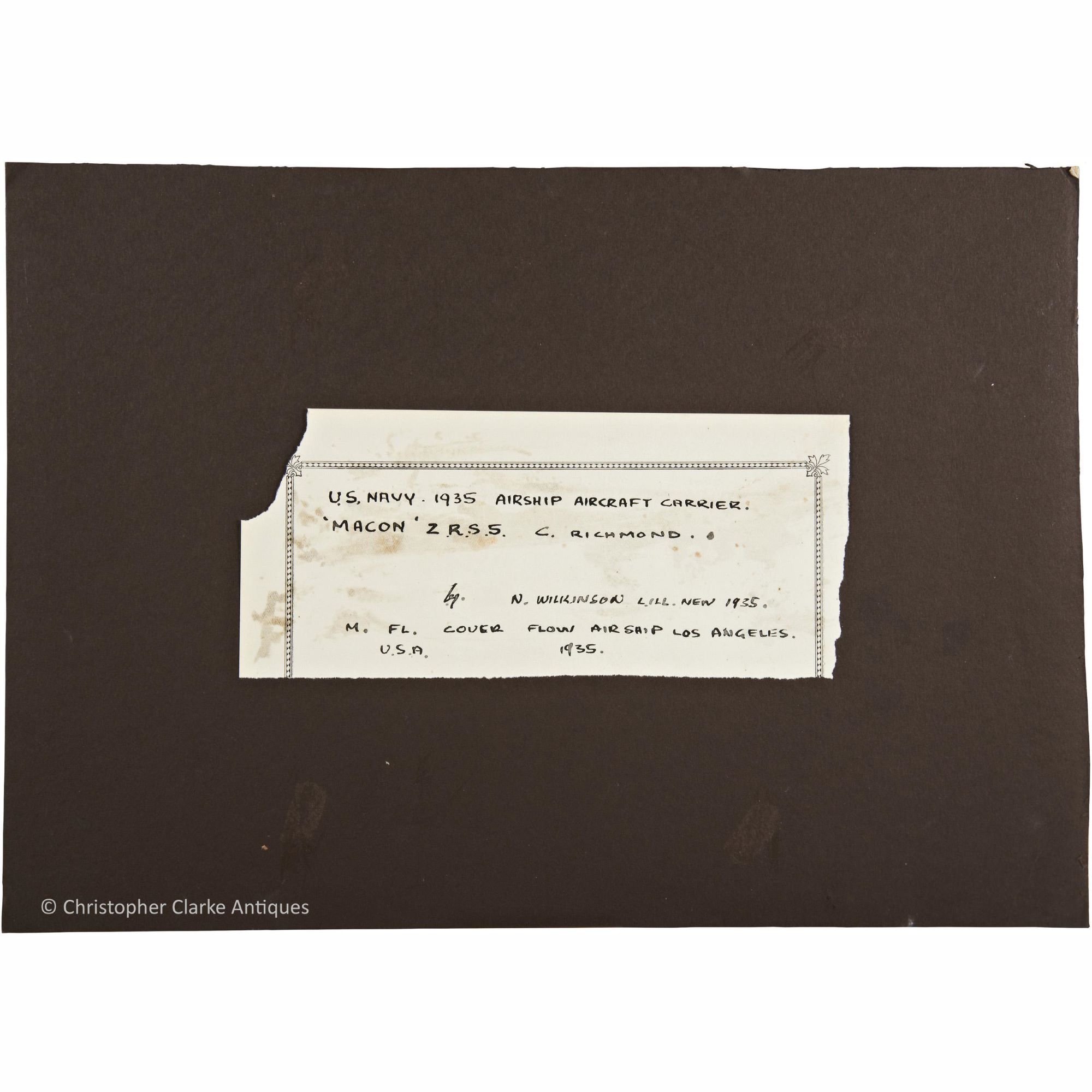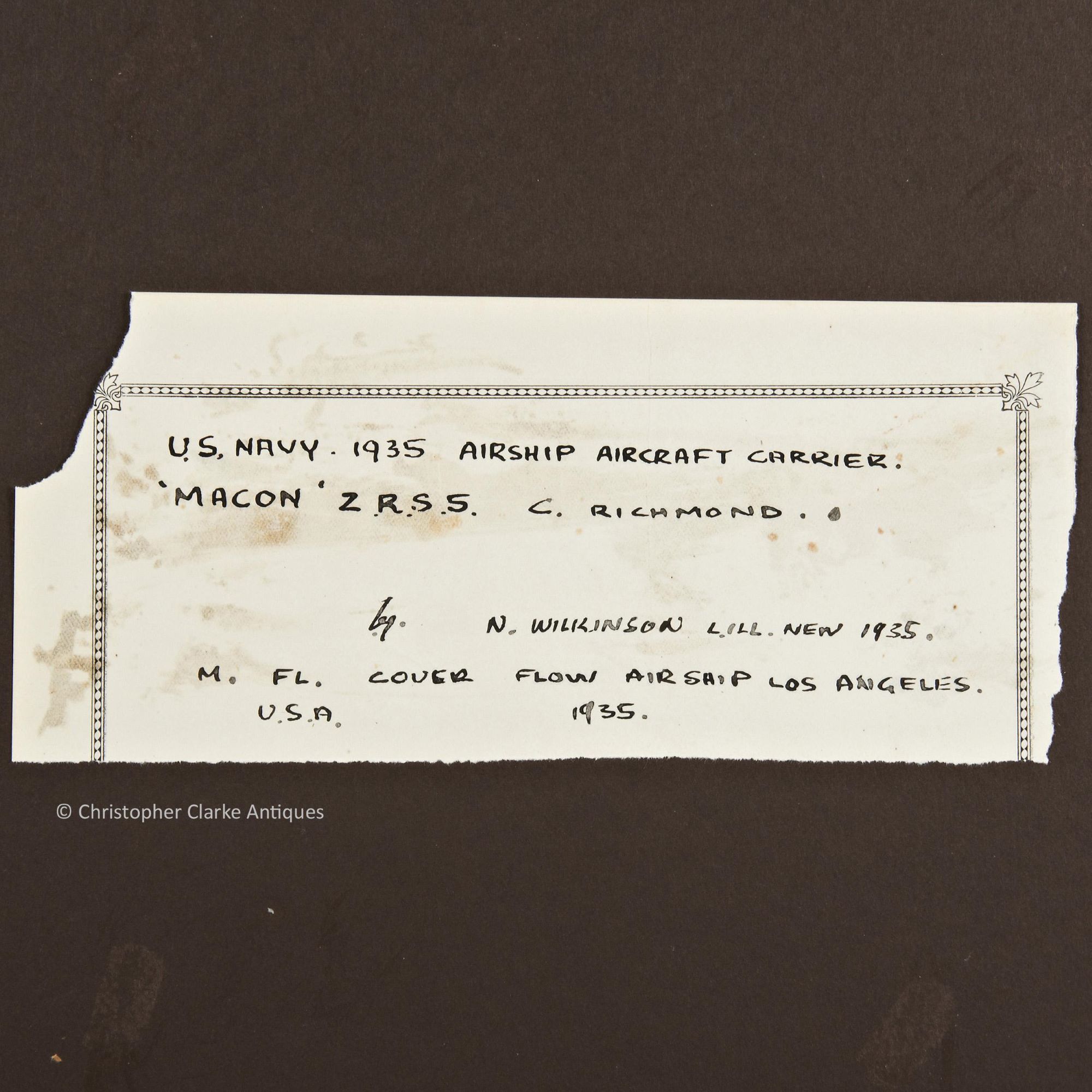 The large paper label to the back of the board notes 'U.S. Navy 1935 Airship Aircraft Carrier. 'Macon' Z.R.S.5. C. Richmond. By N. Wilkinson L. Ill. New 1935, M. Fl . Cover Flow Airship Los Angeles. U.S.A. 1935.' It is probable that Wilkinson was commissioned by the London Illustrated News to produce this illustration in response to the crash. The London Illustrated News covered the crash on the 16th of February but used a photograph of the Macon above a warship. Whether this illustration was used for a separate story or not, isn't known.